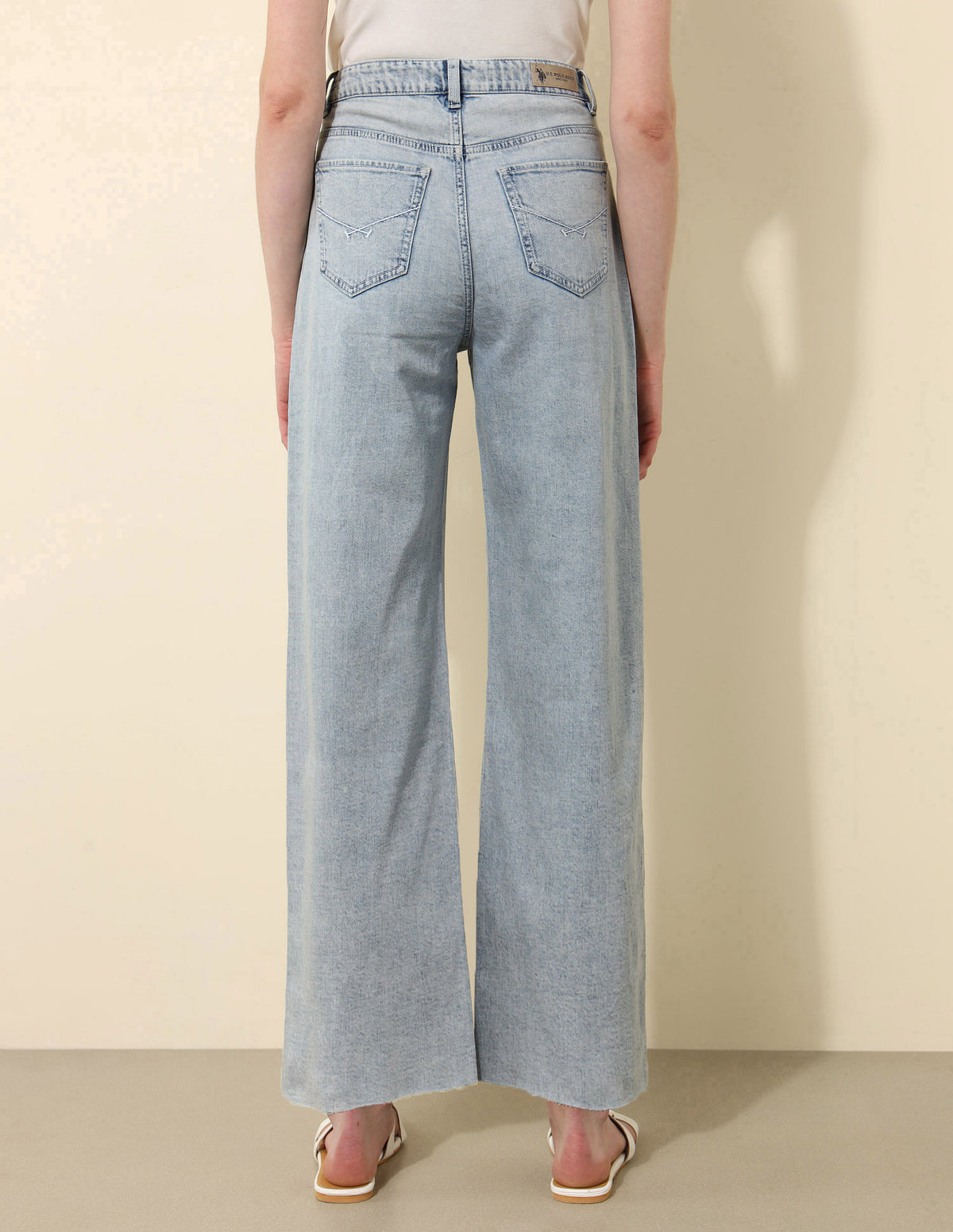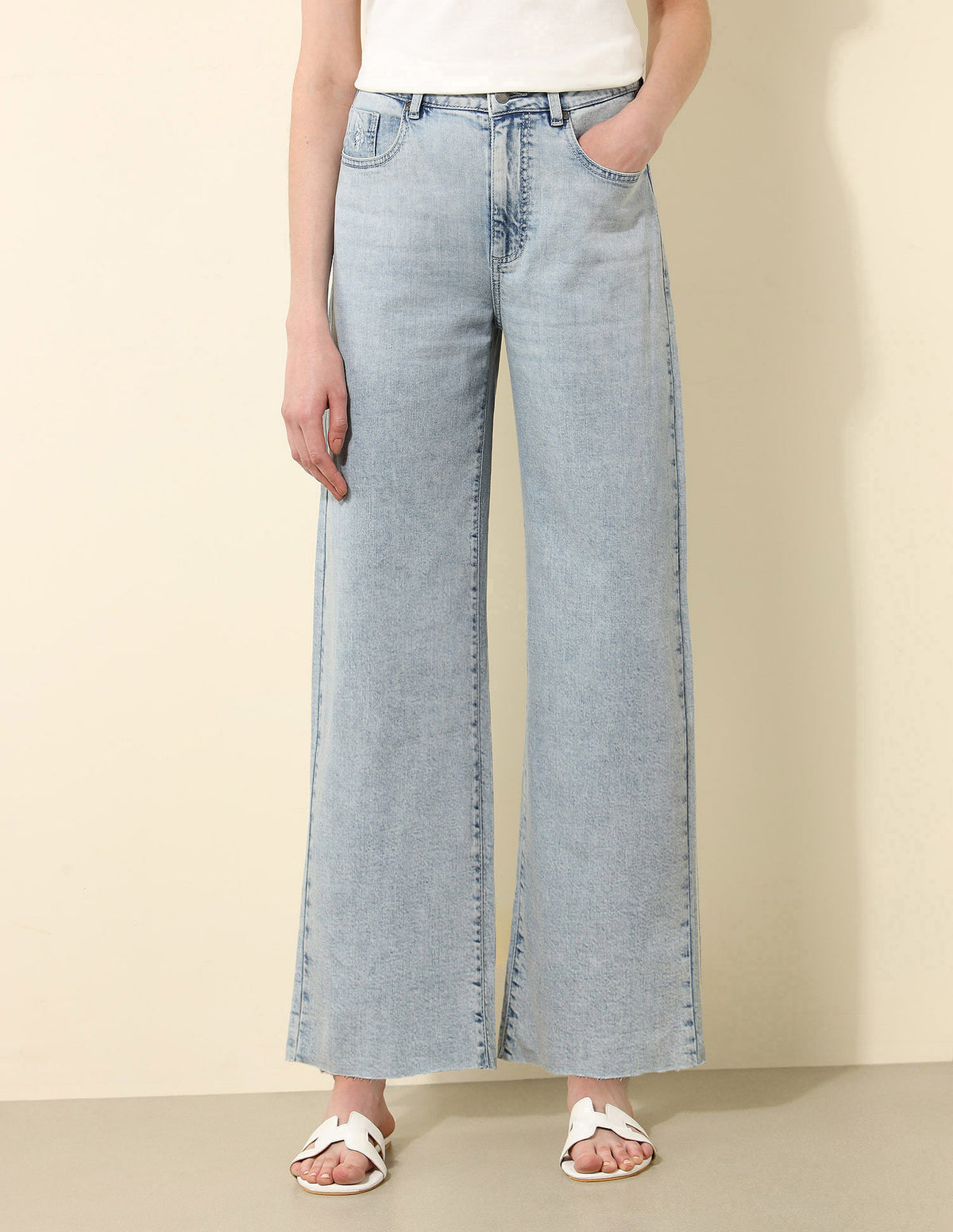 | High-rise waist | Button and zip fly closure | Five pockets | Stonewash | Denim weave | Flared fit |