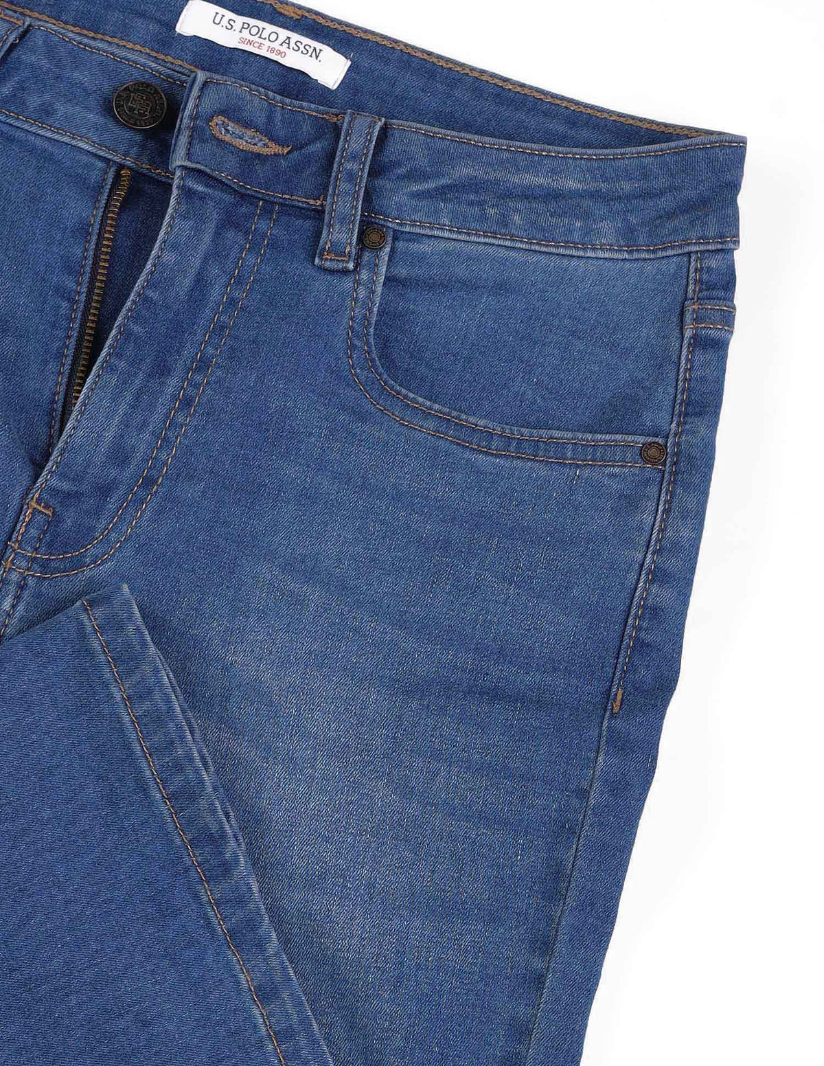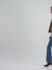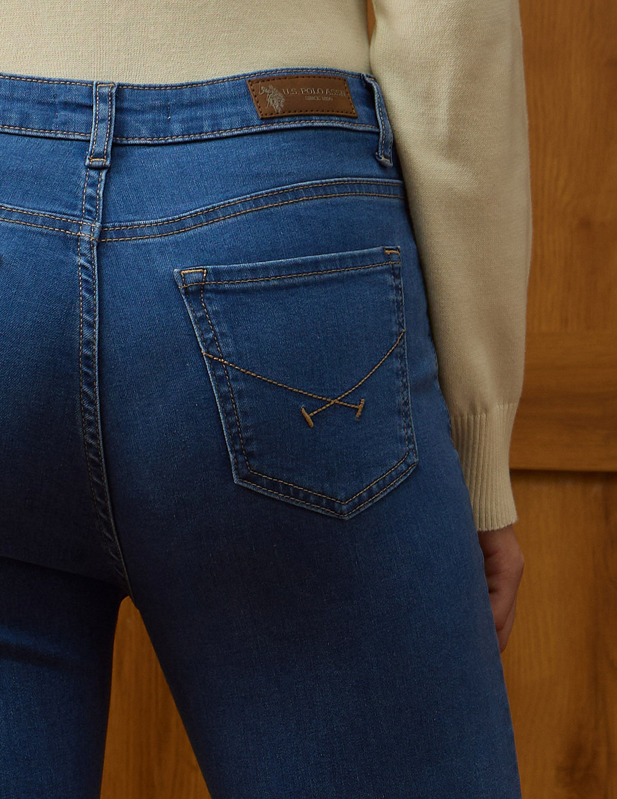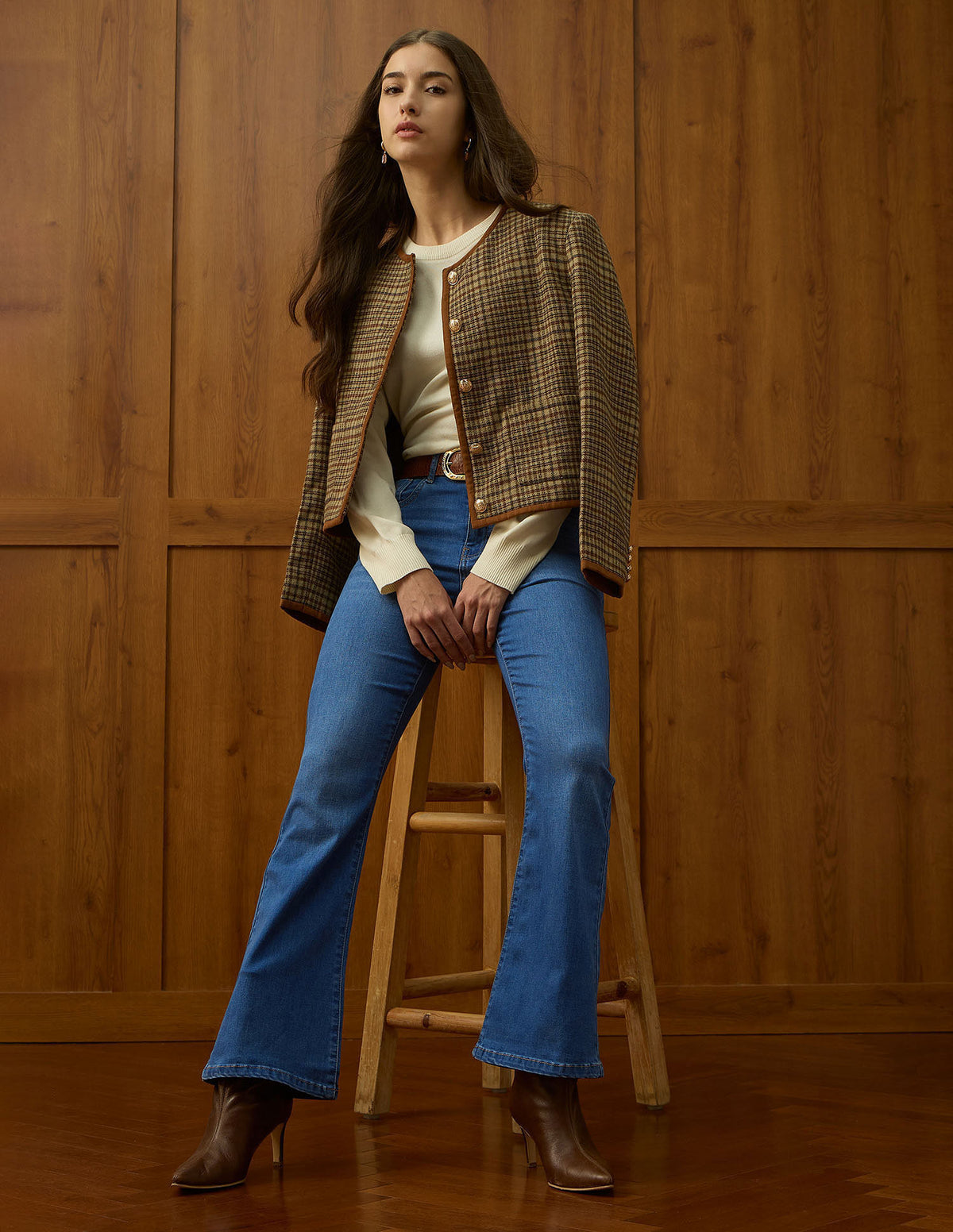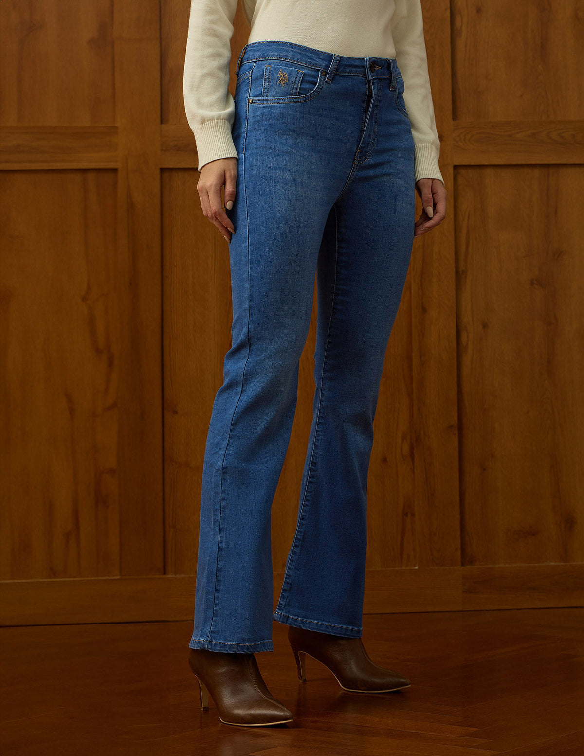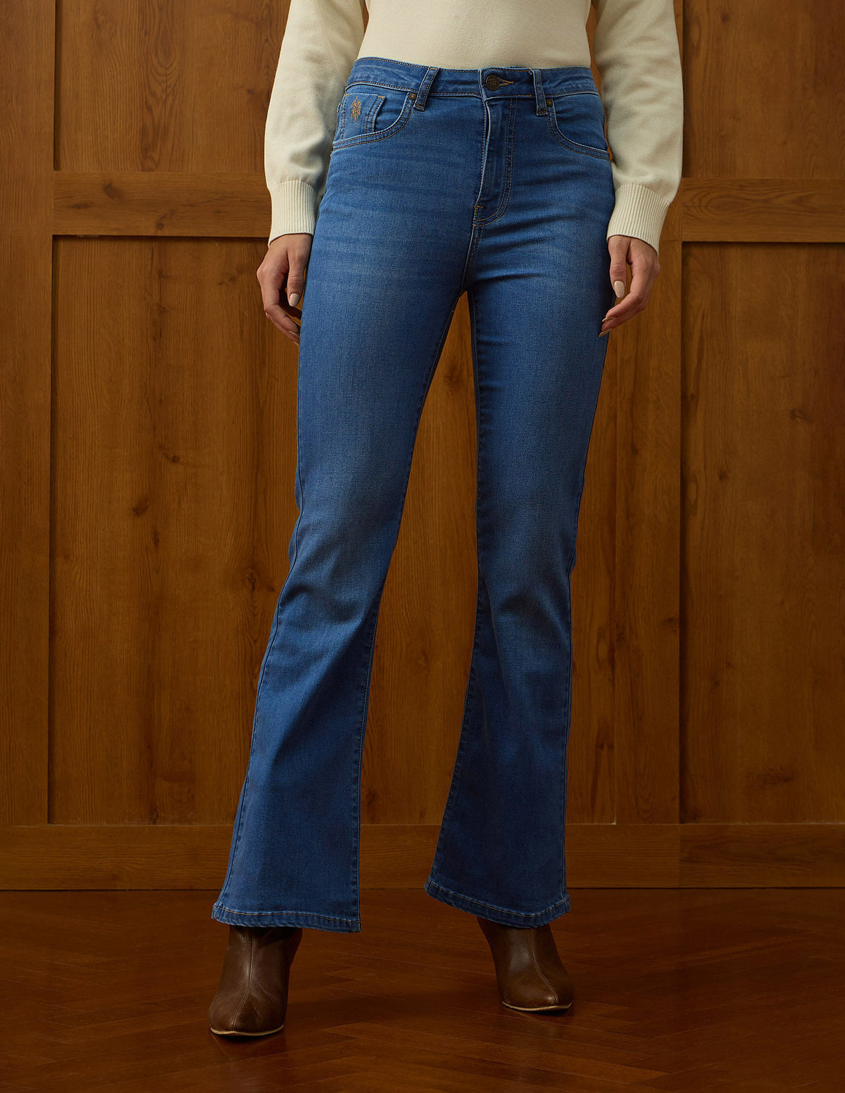 | High-rise waist | Button and zip fly closure | Five pockets | Stonewash | Denim weave | Flared fit |
