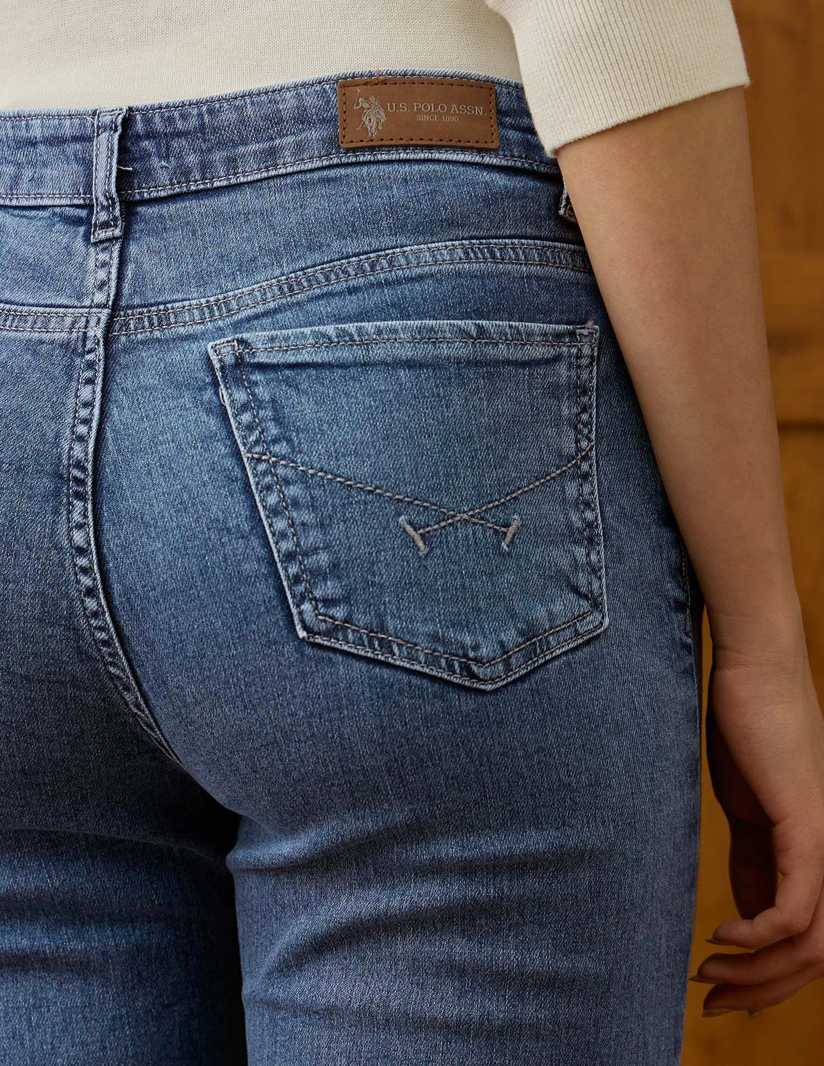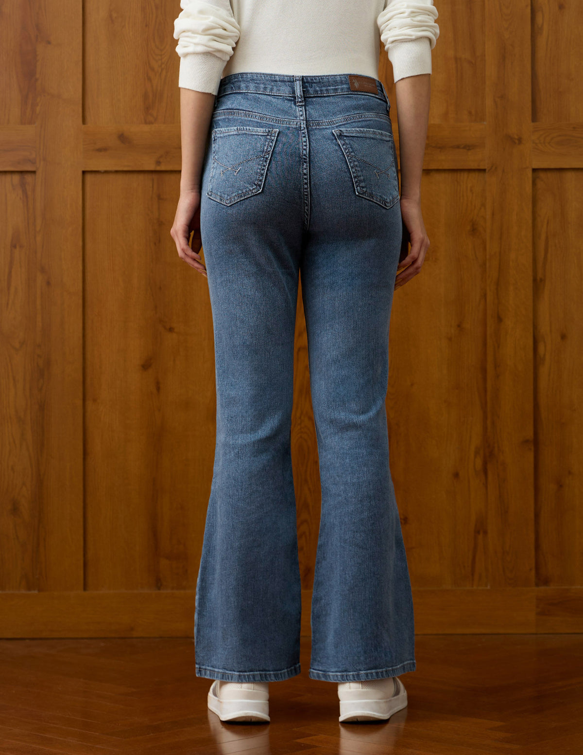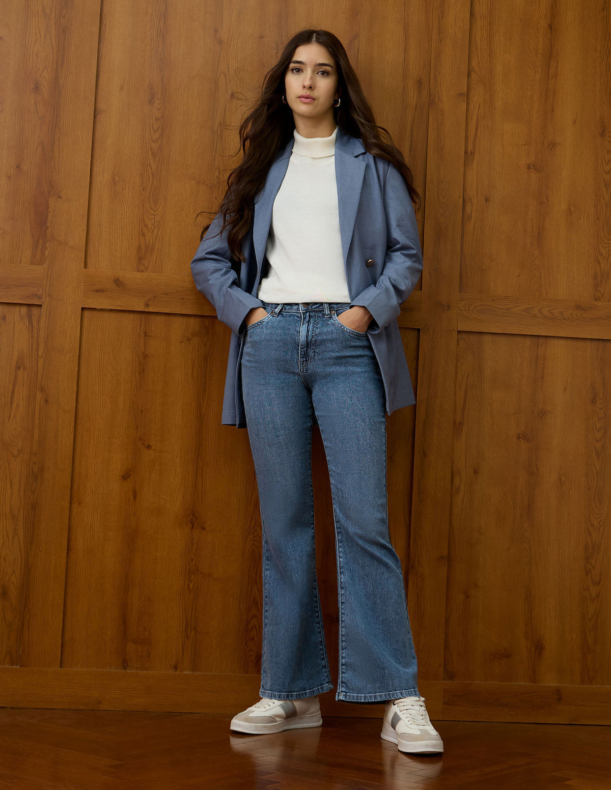 | High-rise waist | Button and zip fly closure | Five pockets | Denim weave | Flared fit |