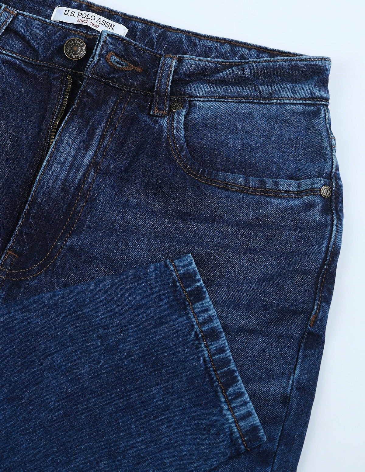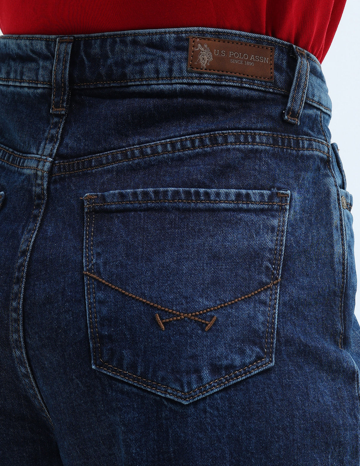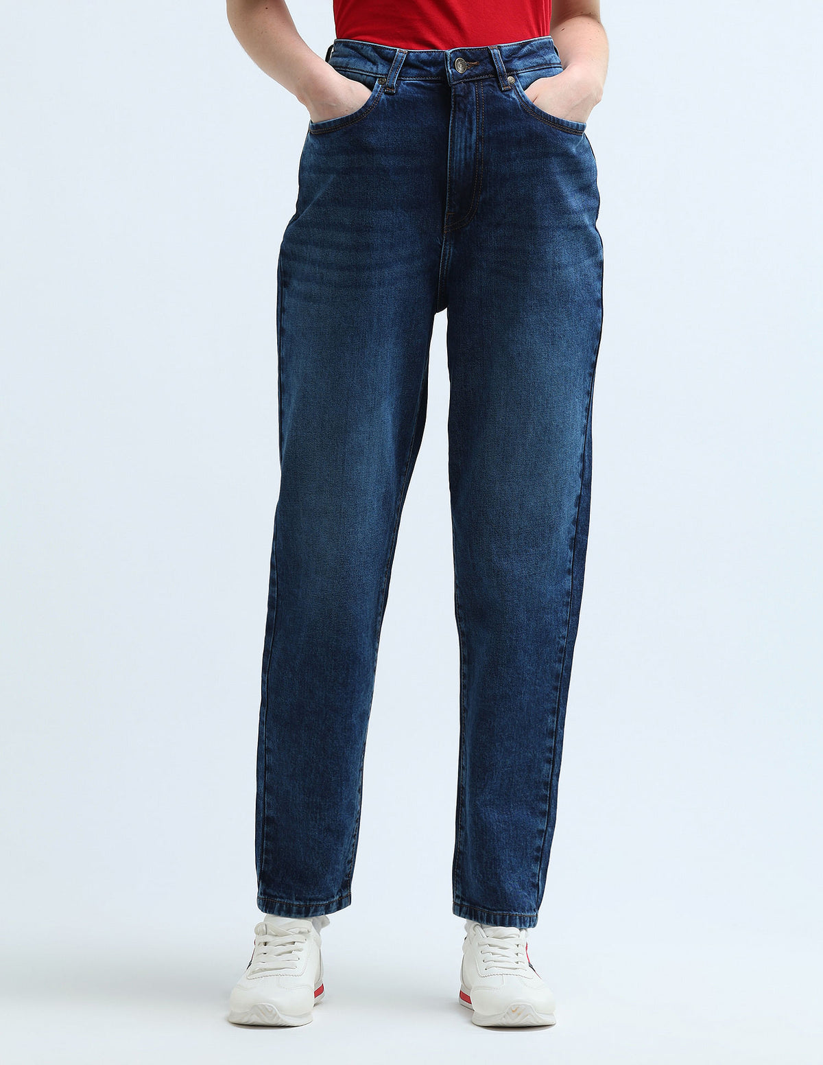 | High-rise waist | Button and zip fly closure | Five pockets | Stonewashed and whiskered | Denim weave | Mom fit