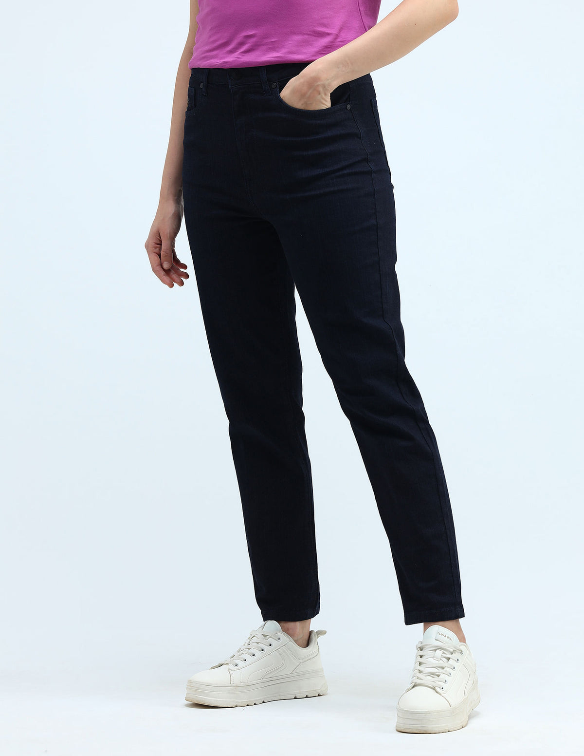 | High-rise waist | Button and zip fly closure | Five pockets | Rinsed | Denim weave | Mom fit