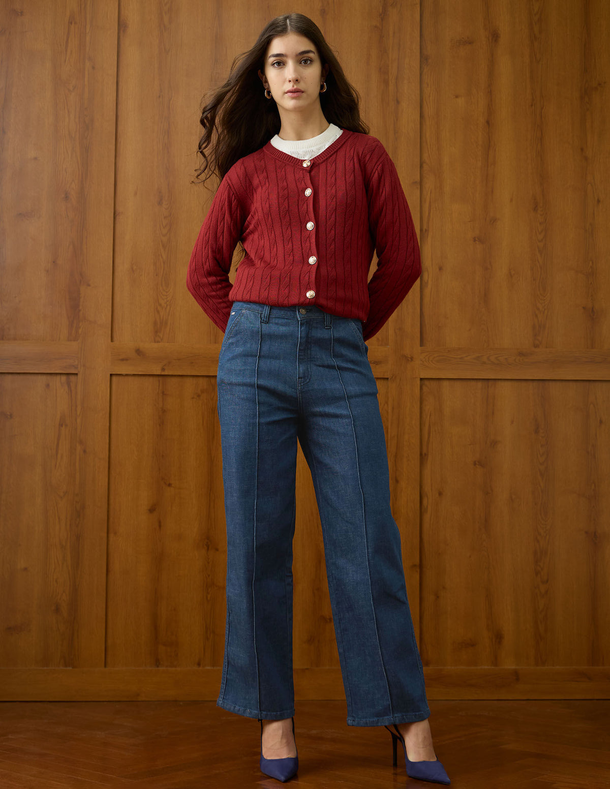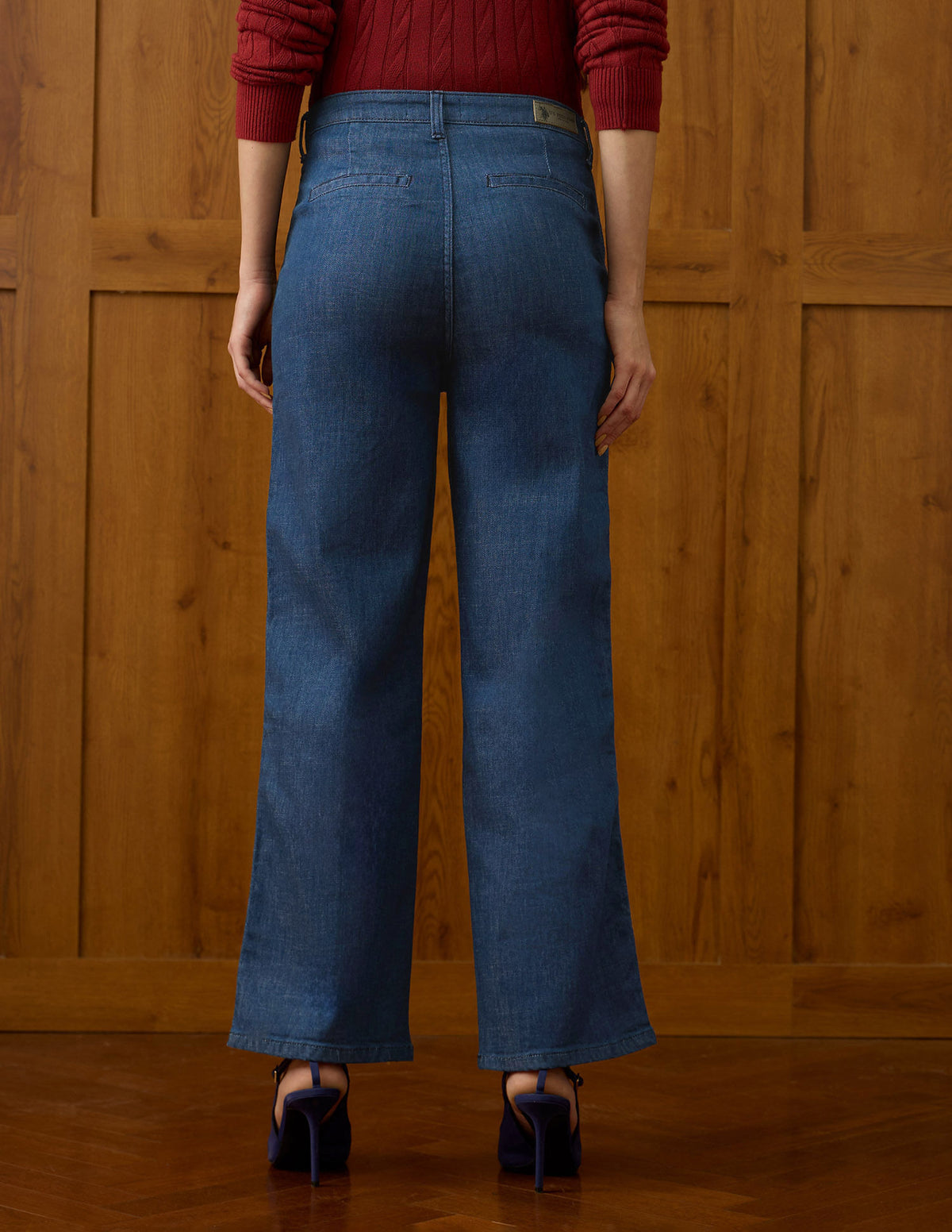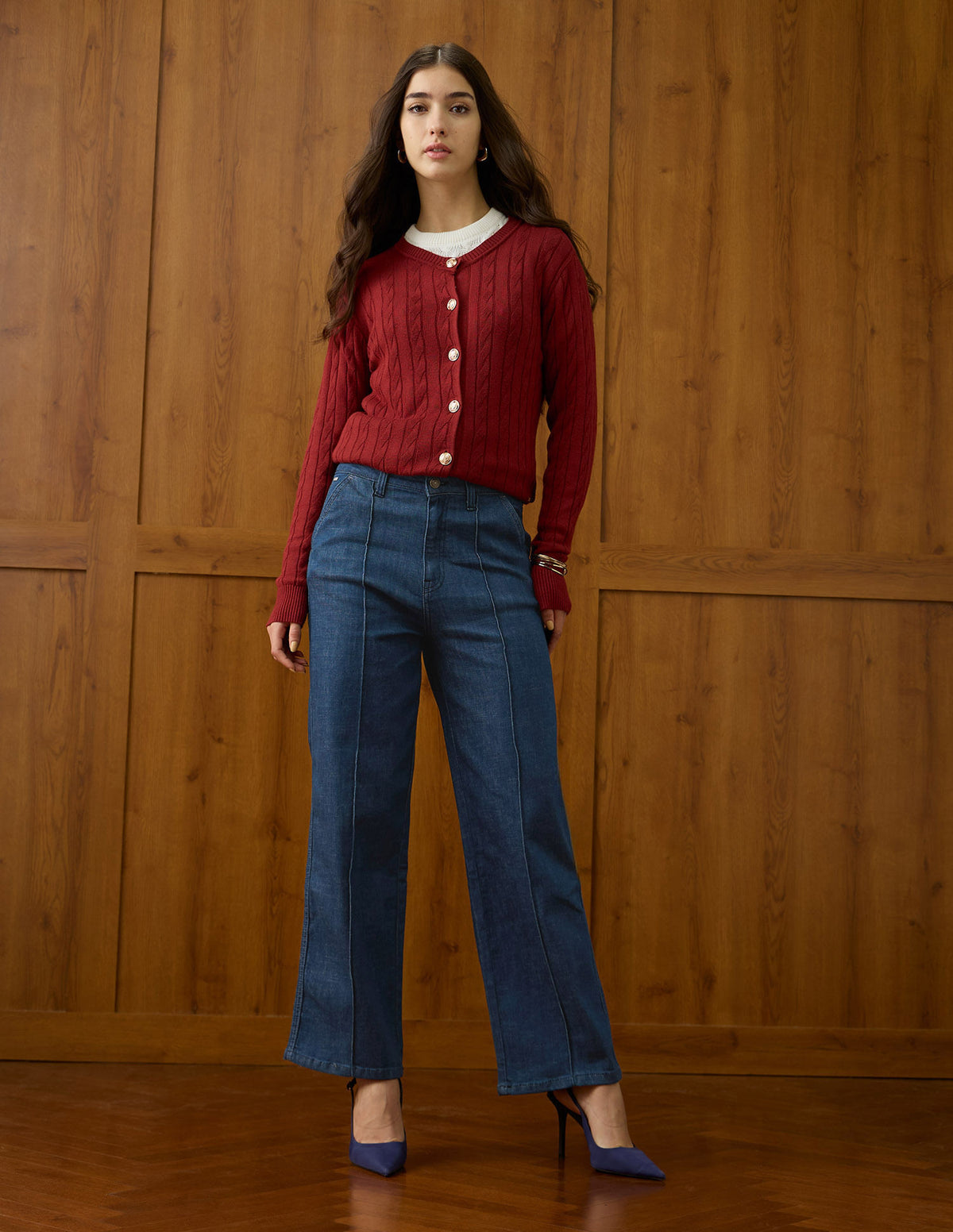 | High-rise waist | Button and zip fly closure | Five pockets | Denim weave | Straight fit |