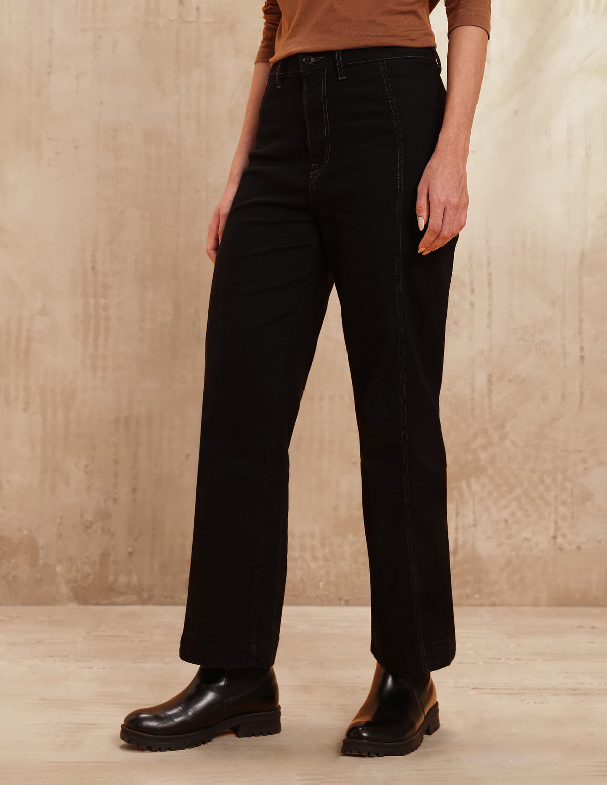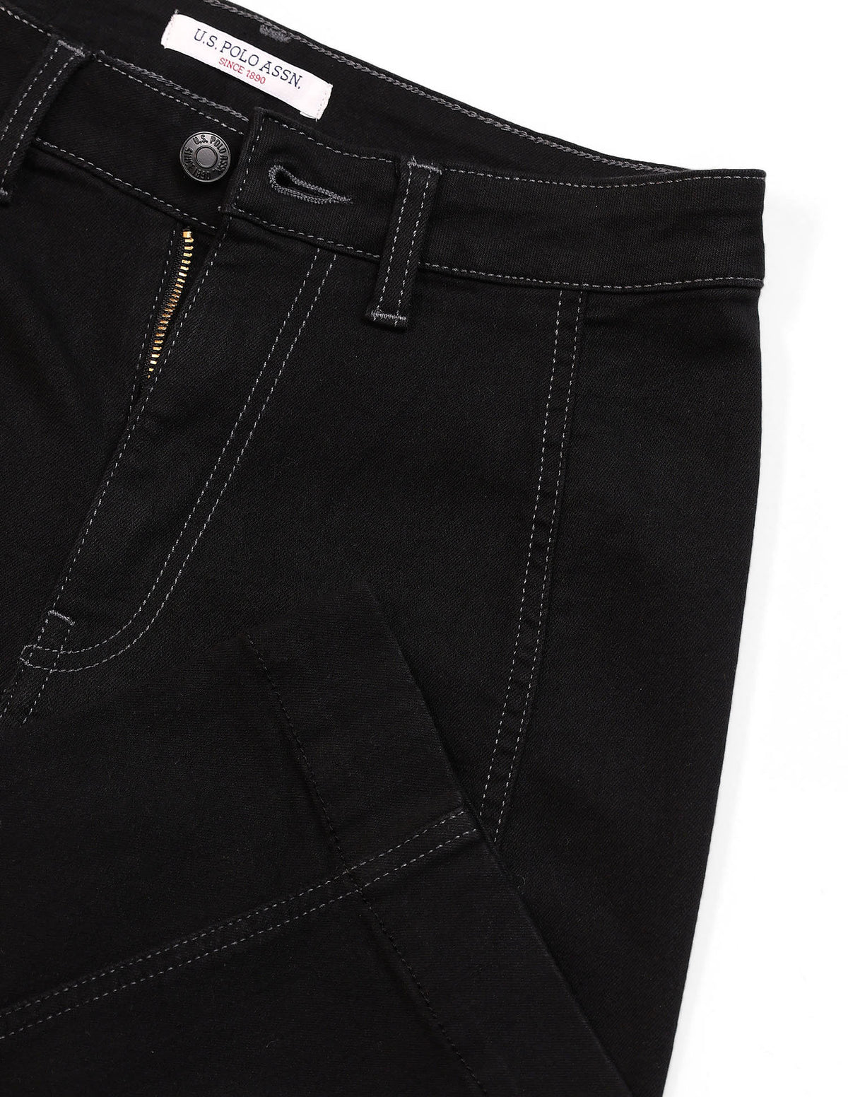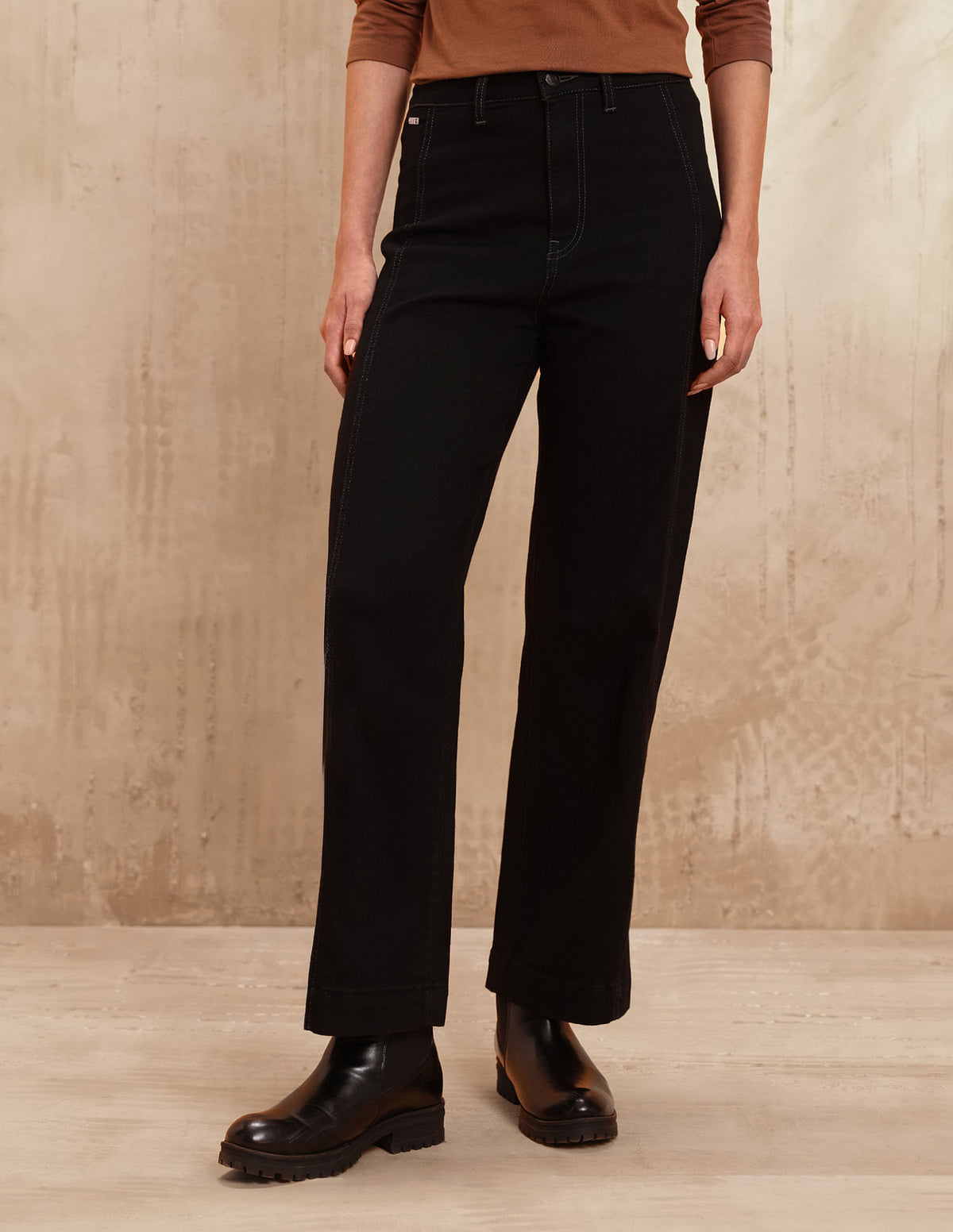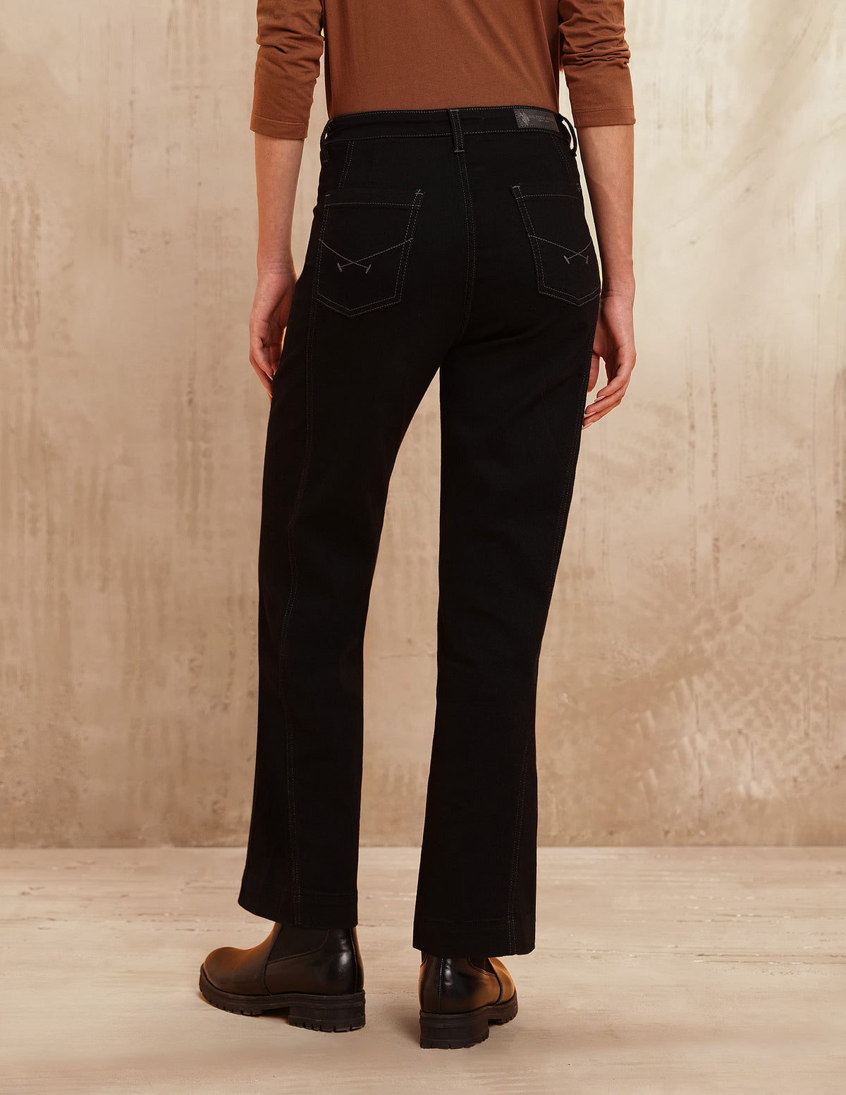 | High-rise waist | Button and zip fly closure | Dark wash | Five pockets | Denim weave | Straight fit |