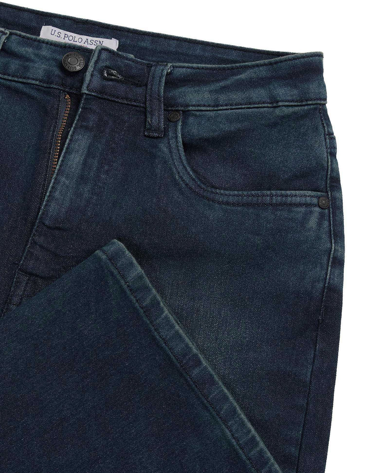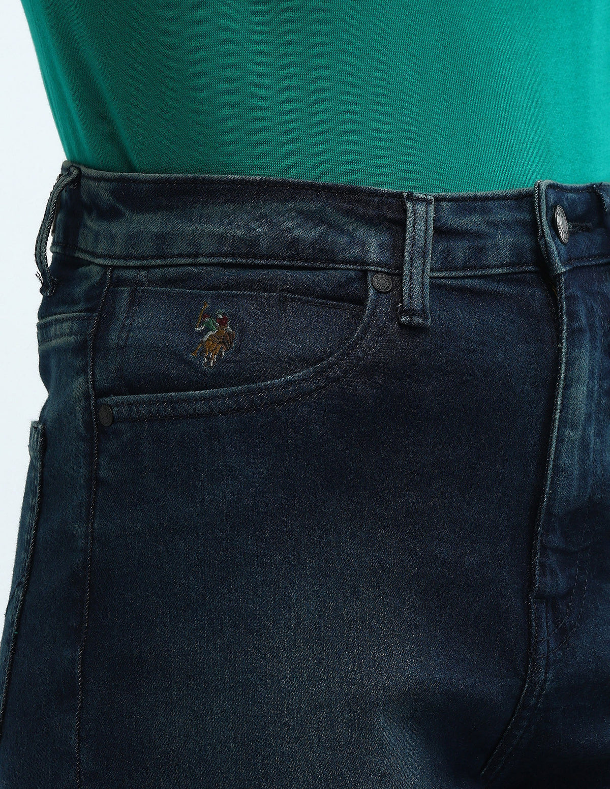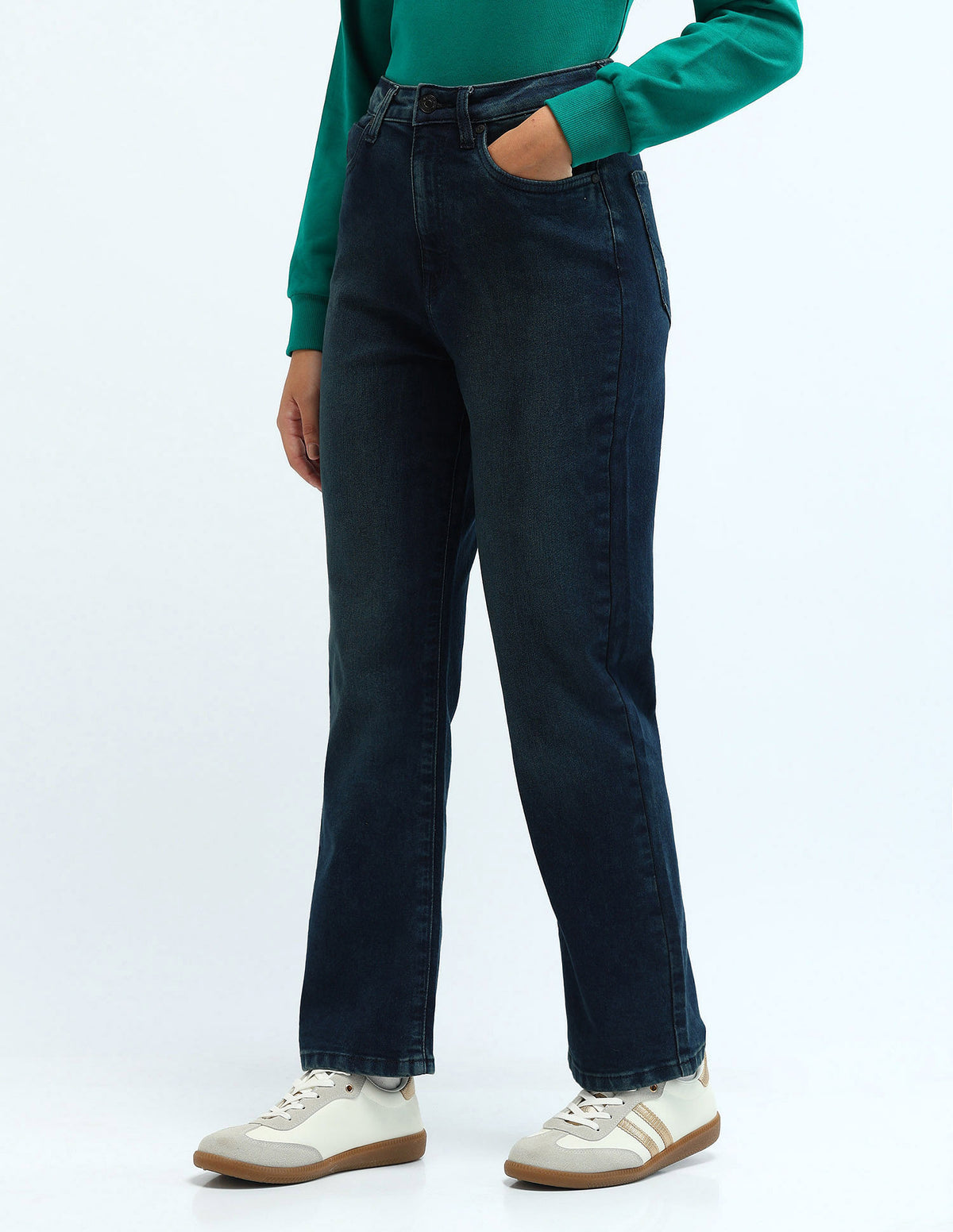 | High-rise waist | Button and zip fly closure | Five pockets | Dark washed | Denim weave | Straight fit |