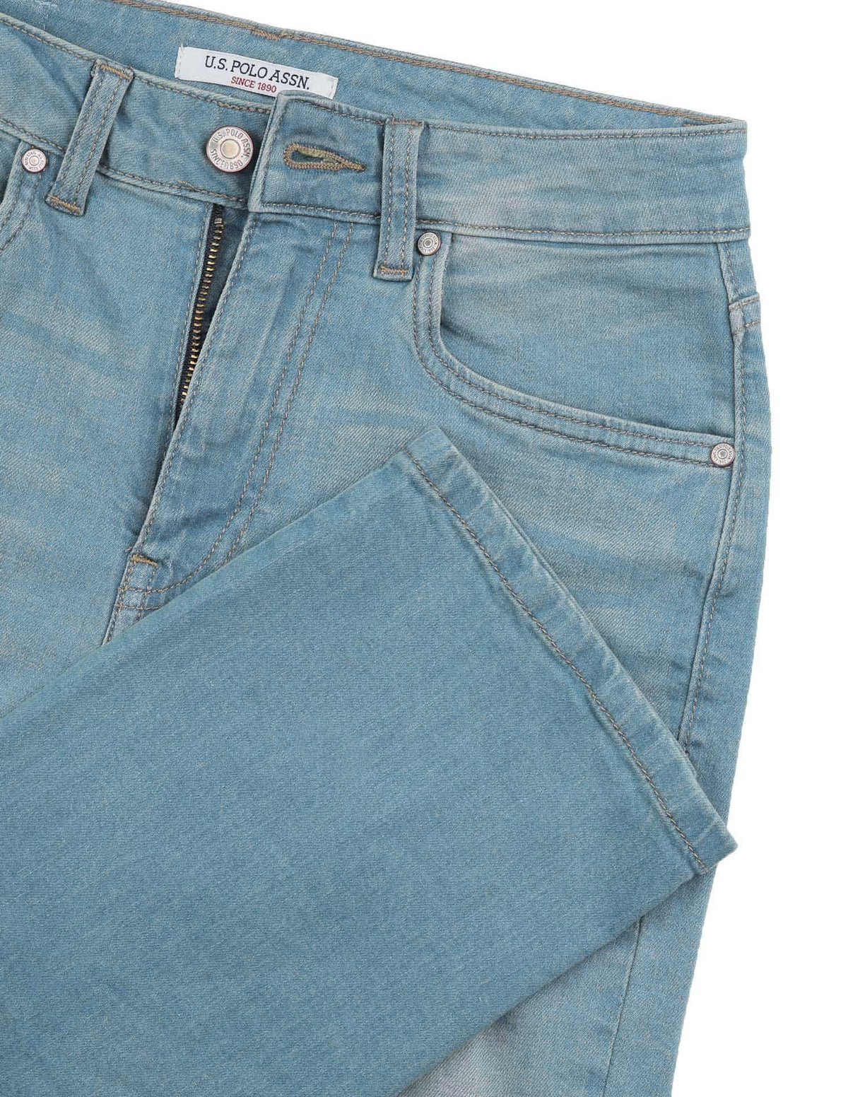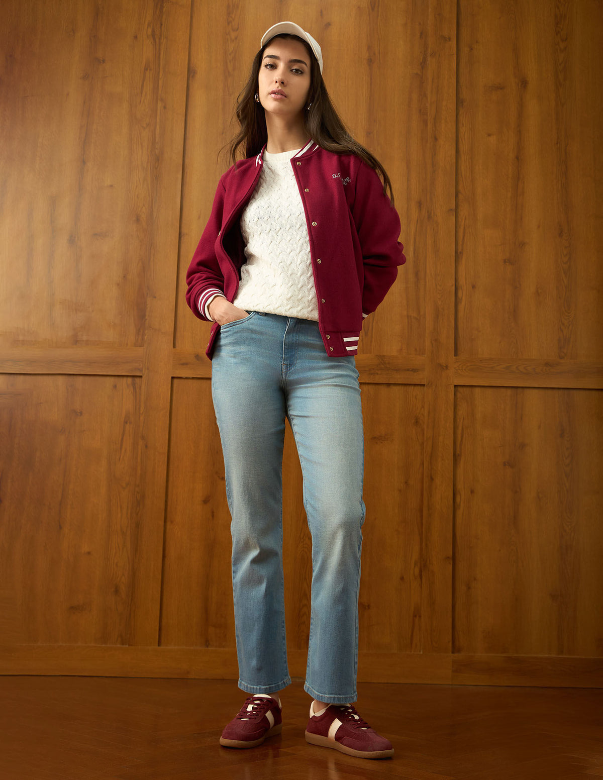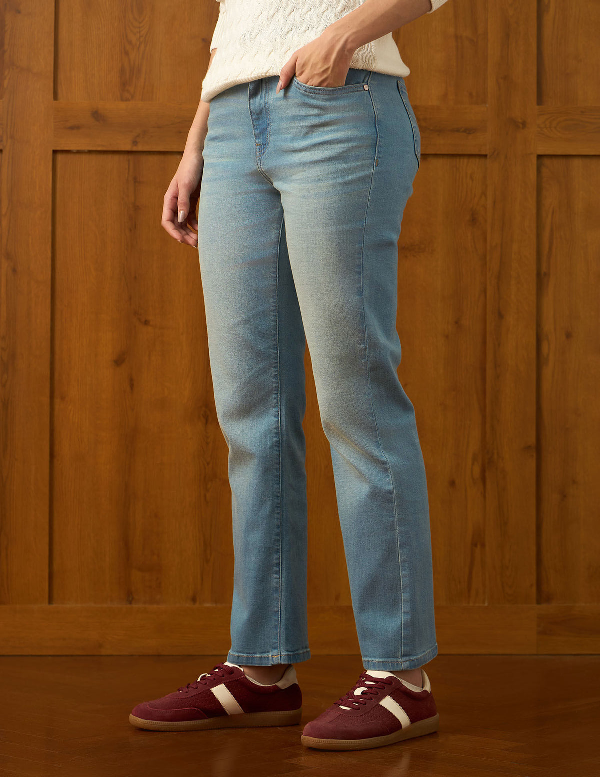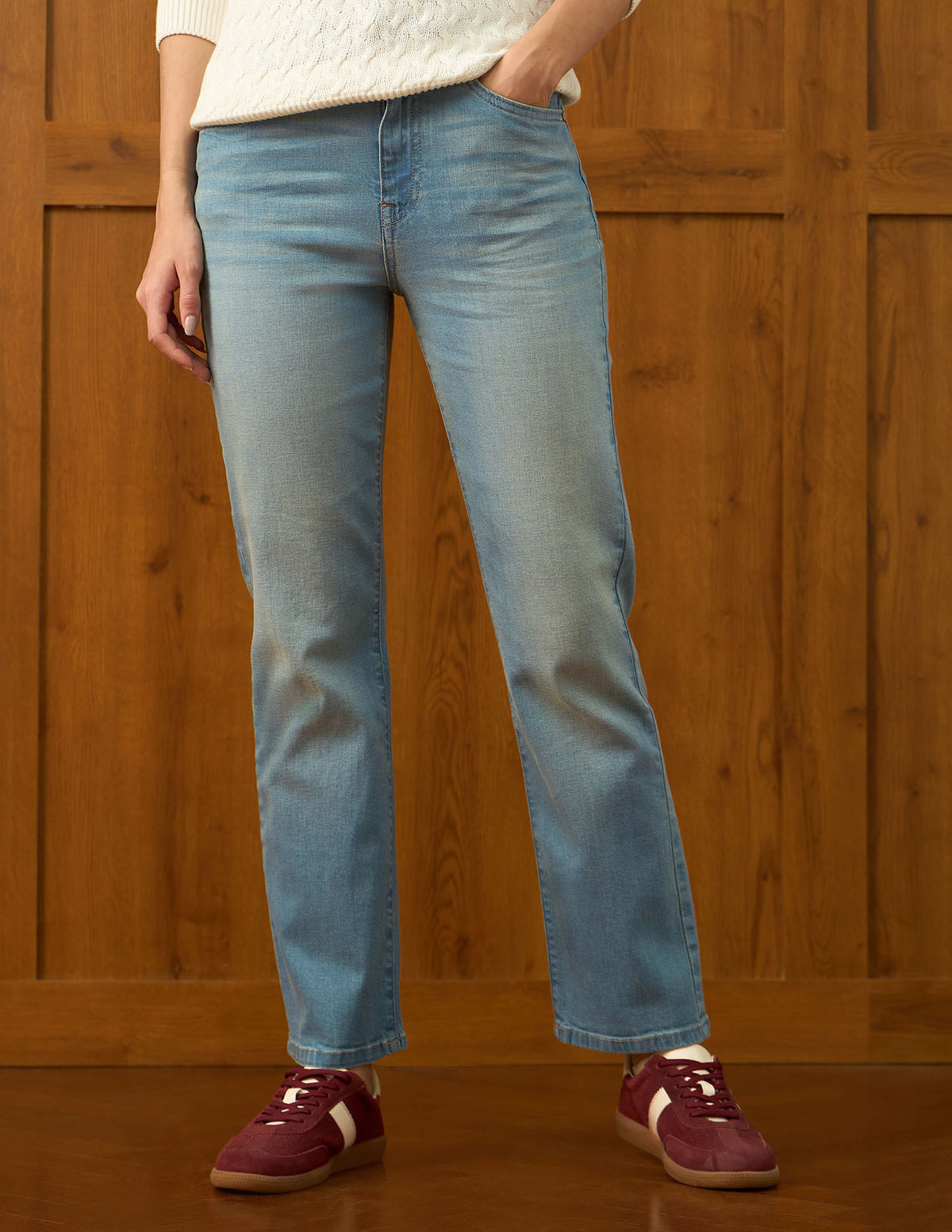 | High-rise waist | Button and zip fly closure | Five pockets | Stonewash | Denim weave | Straight fit |