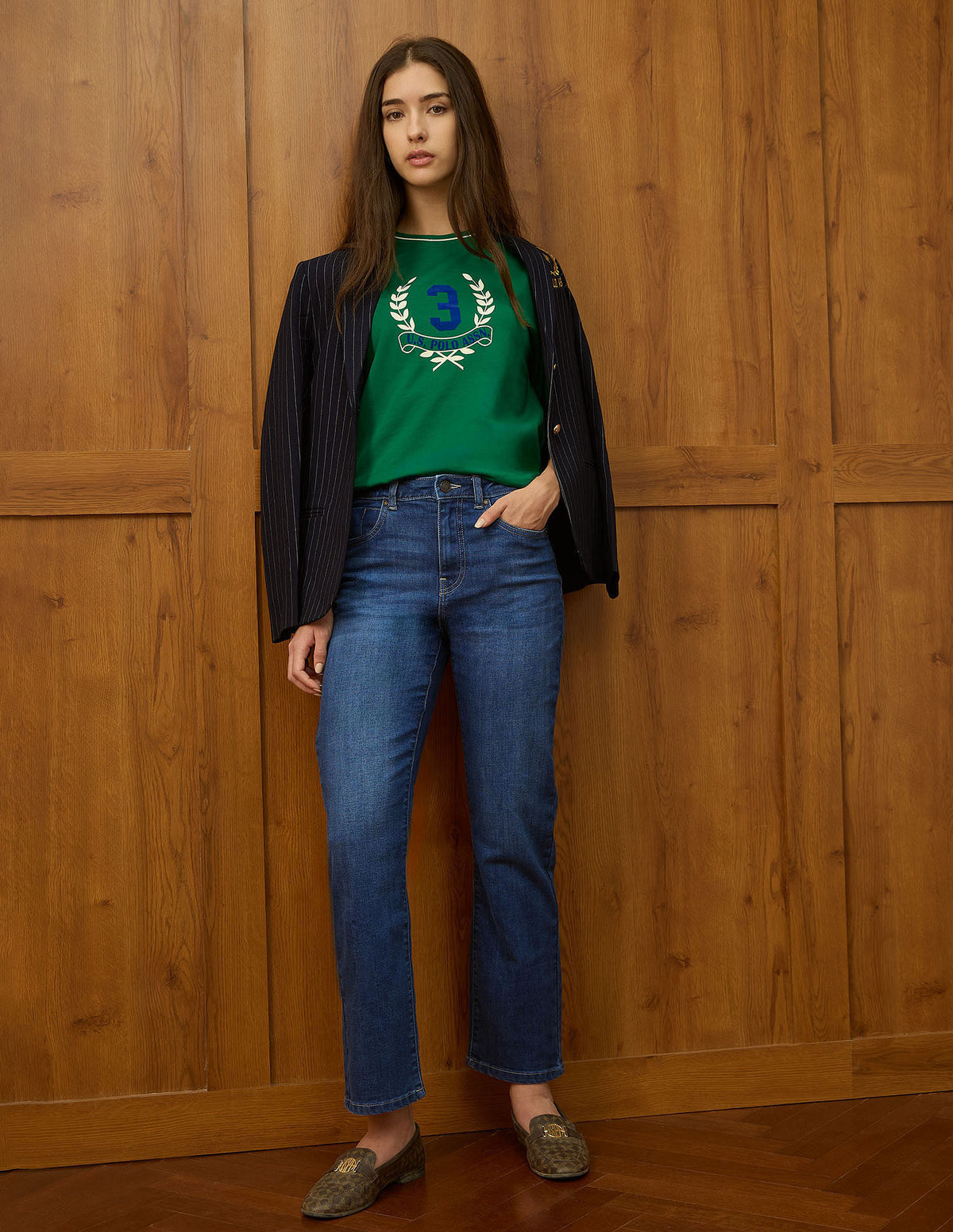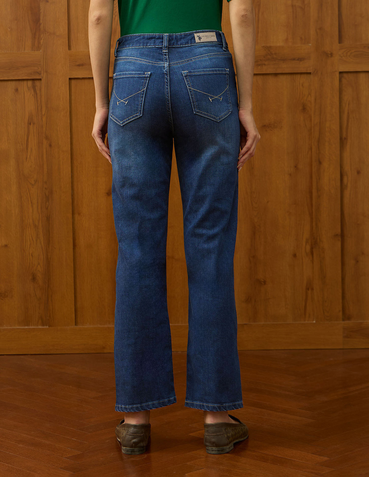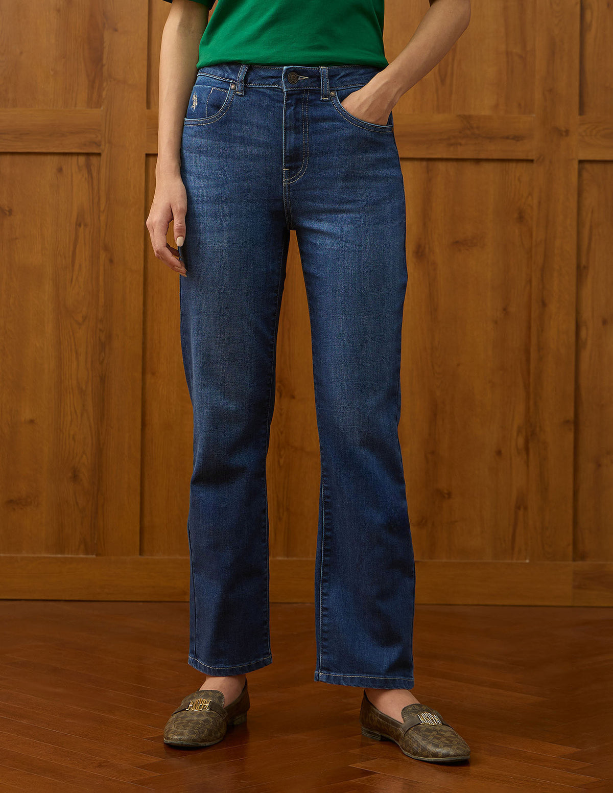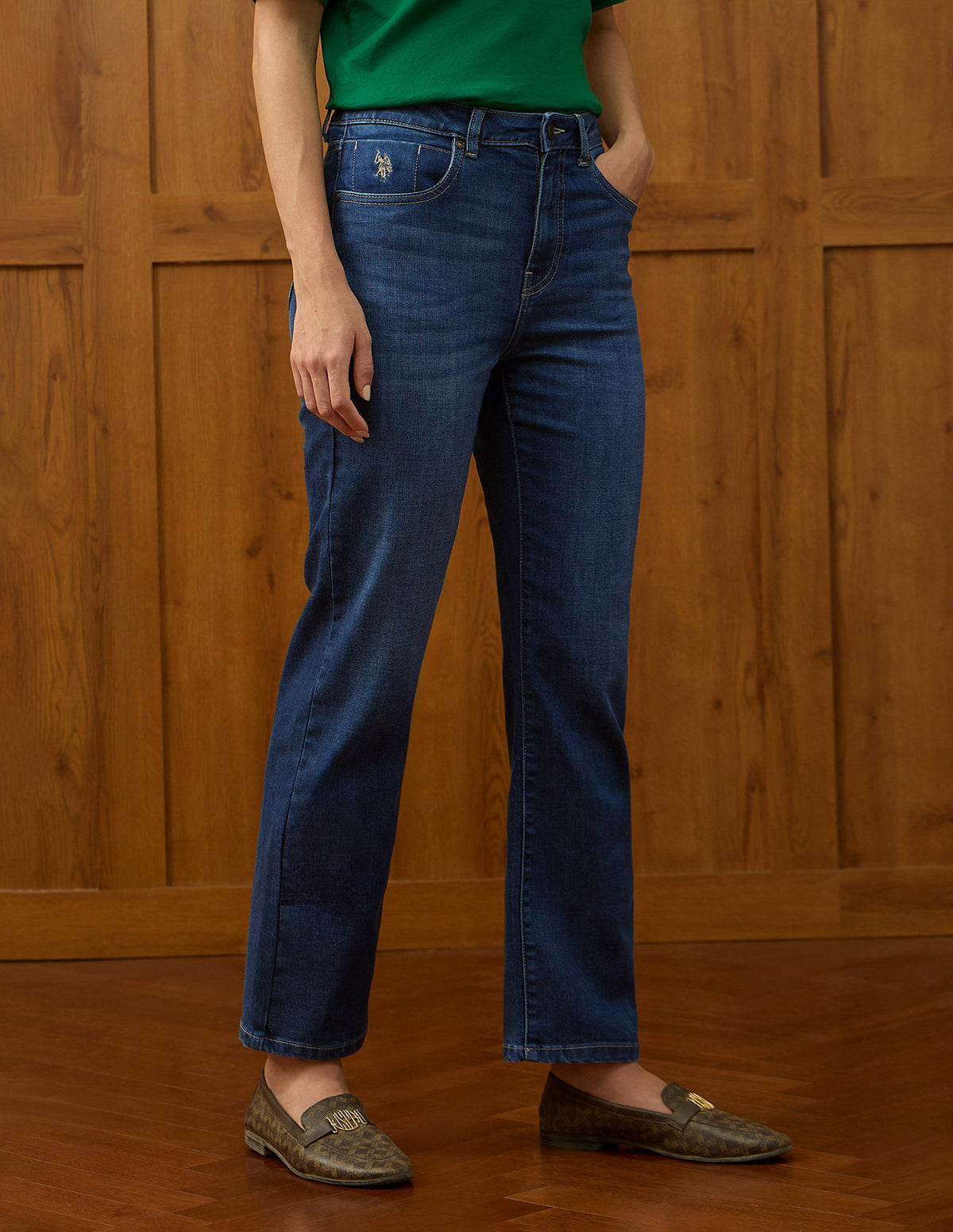 | High-rise waist | Button and zip fly closure | Five pockets | Stonewash | Denim weave | Straight fit |