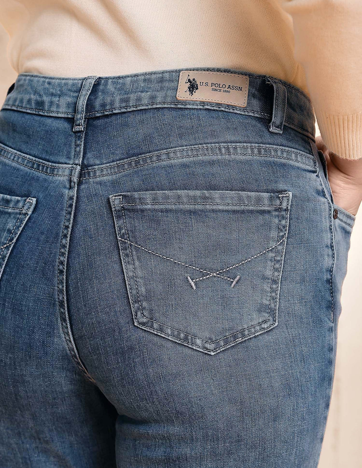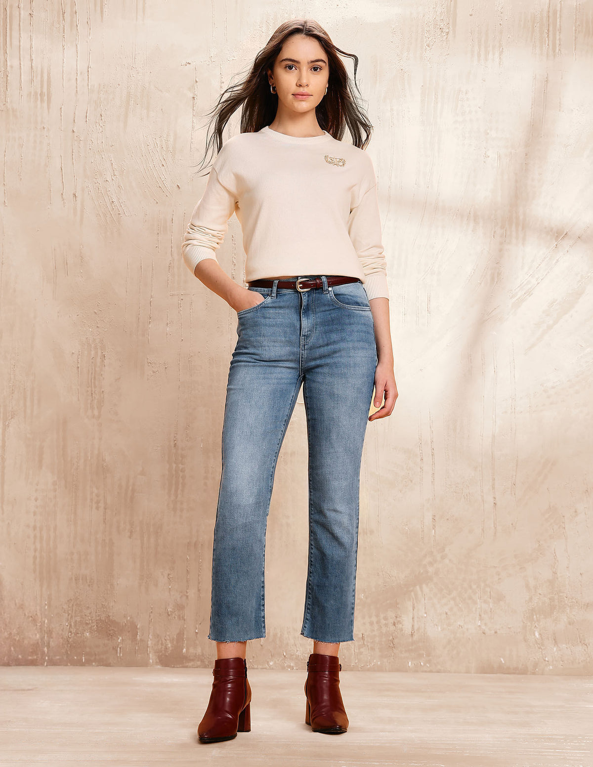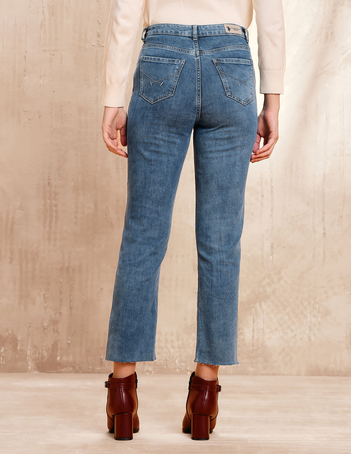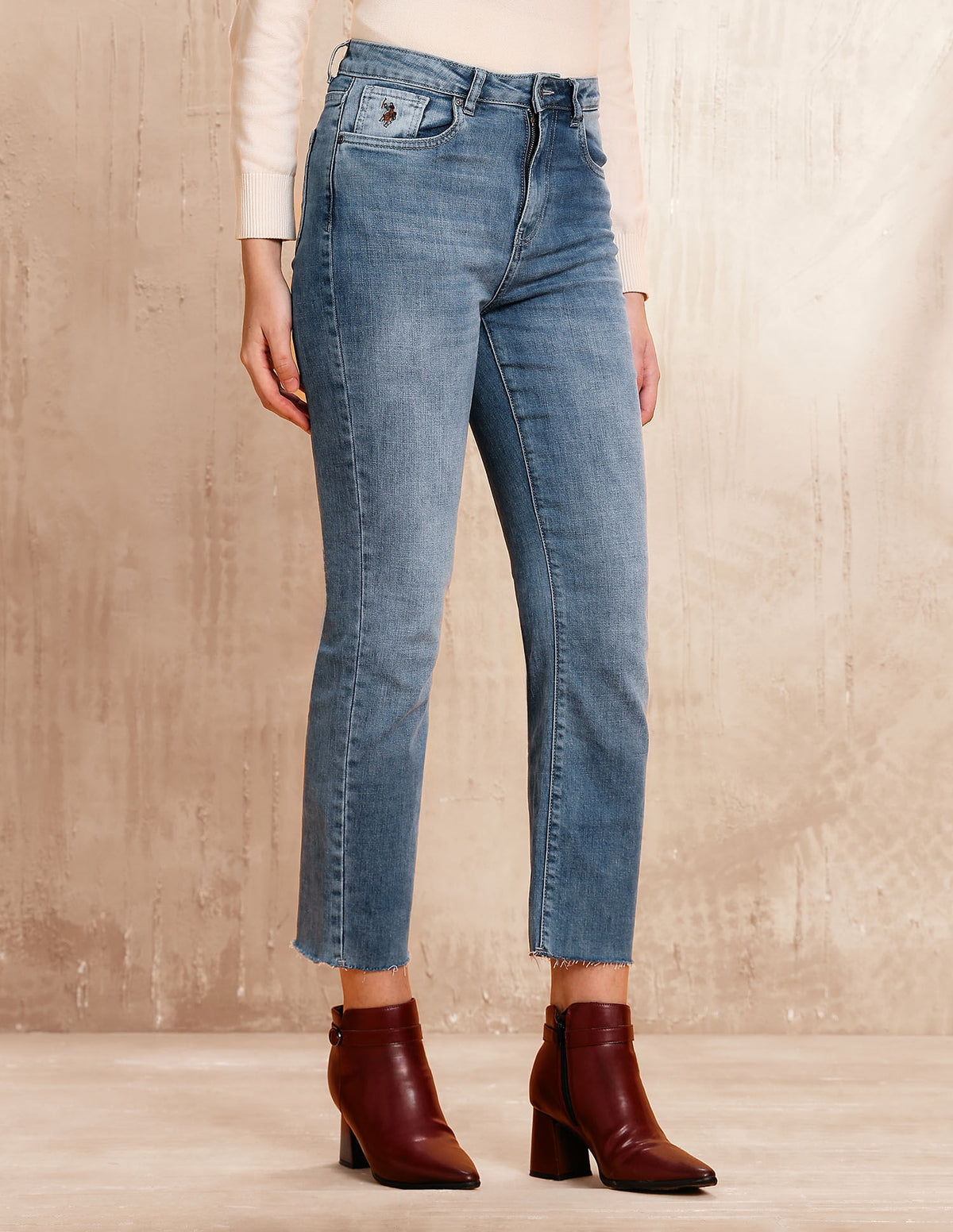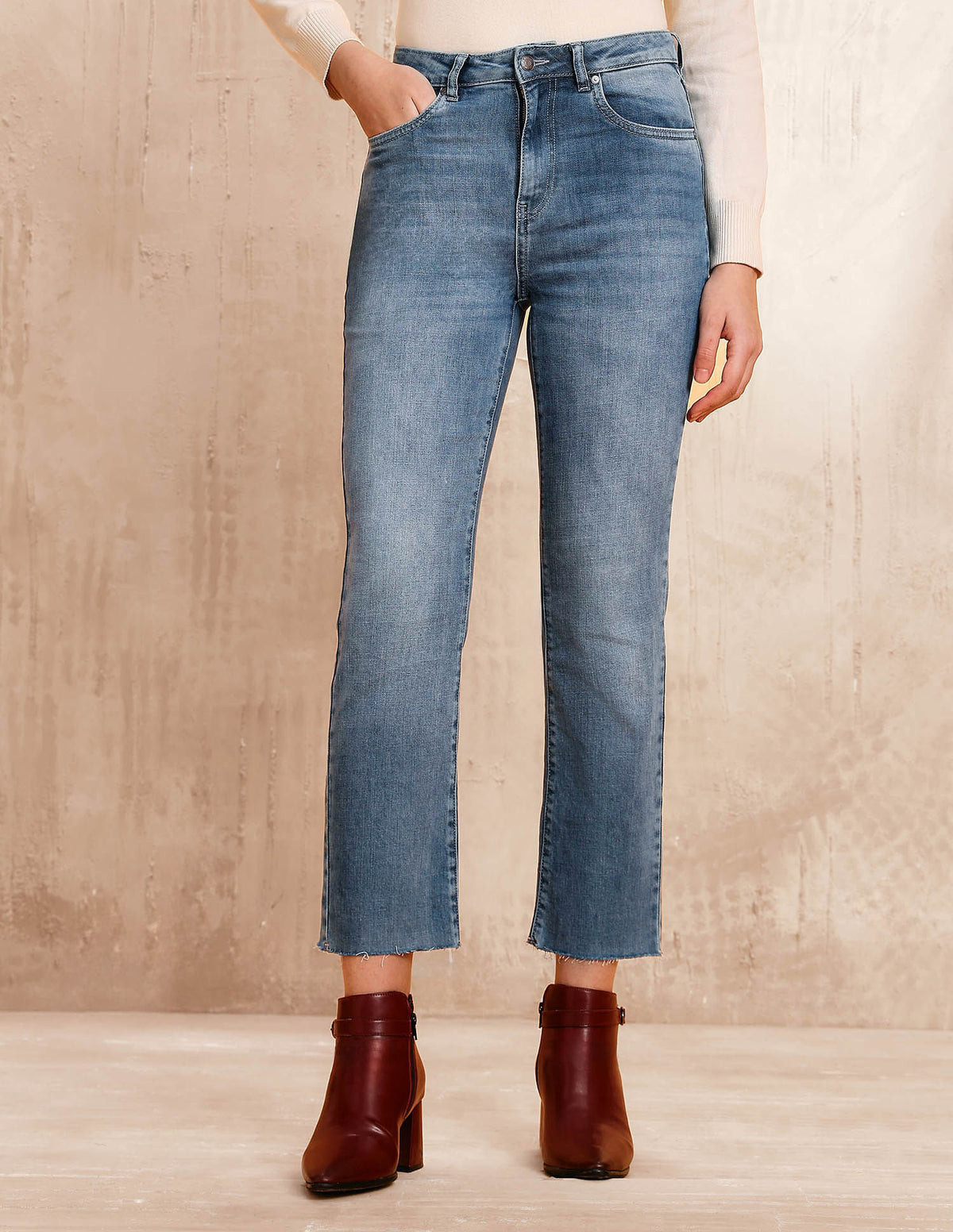 | High-rise waist | Button and zip fly closure | Five pockets | Stone washed | Denim weave | Tapered fit |