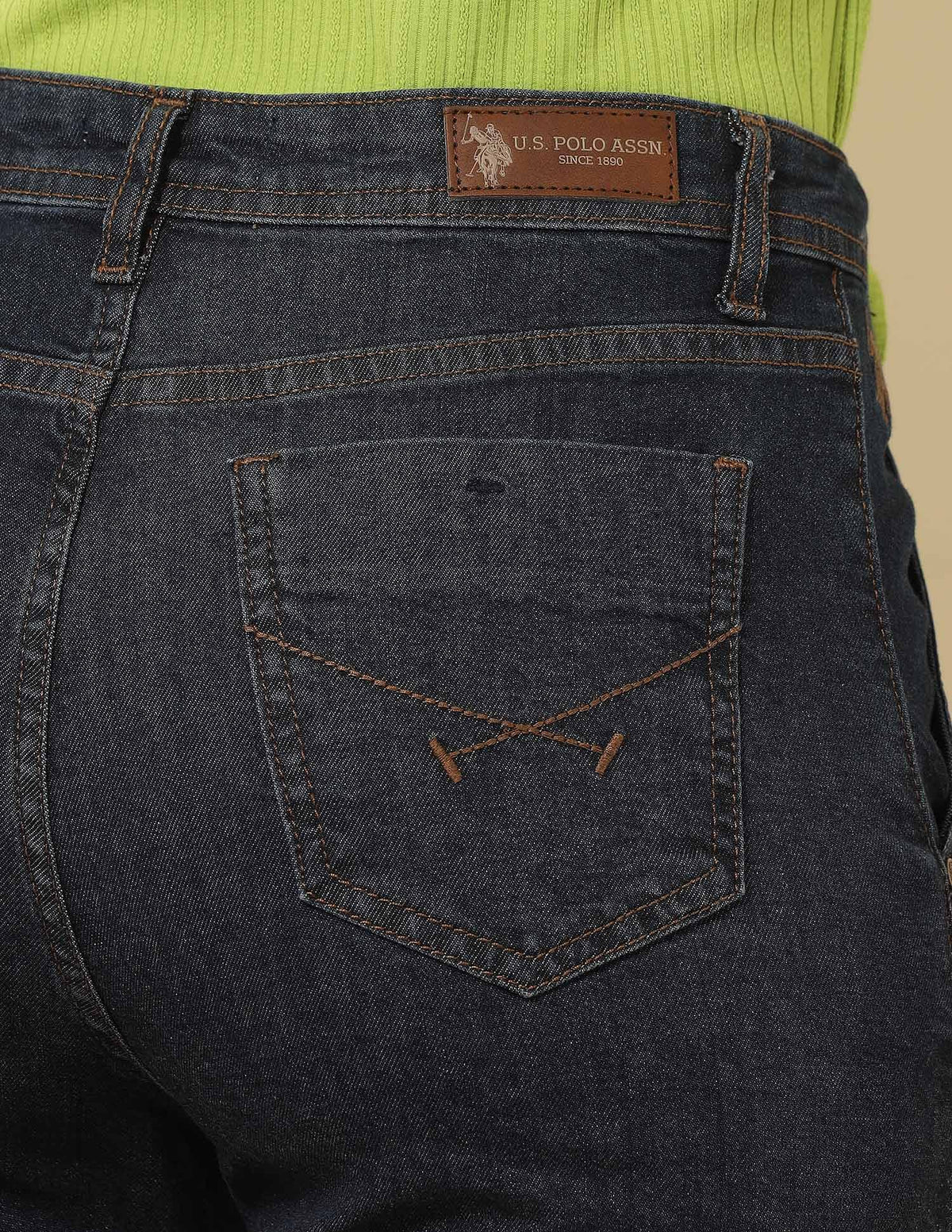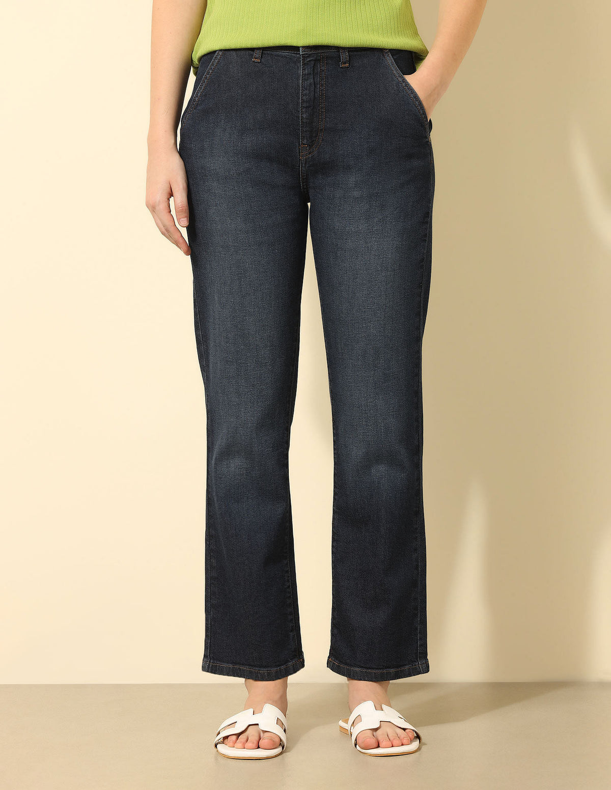 | High-rise waist | Button and zip fly closure | Five pockets | Stonewash | Denim weave | Straight fit |