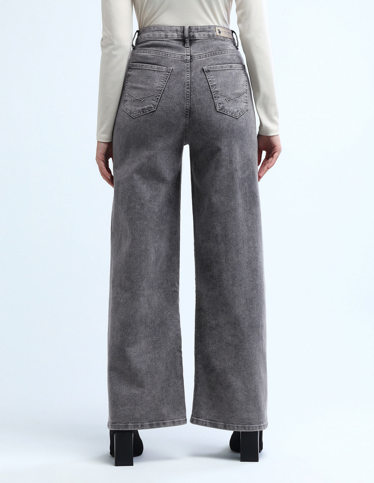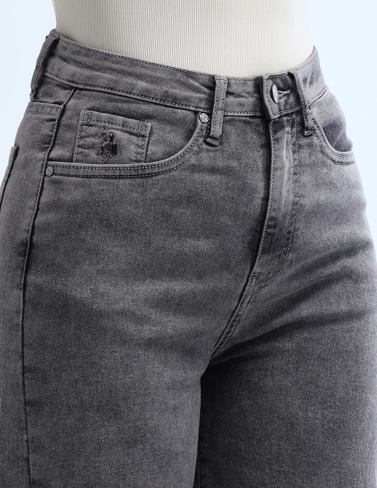 | High-rise waist | Button and zip fly closure | Five pockets | Bleached | Floor length | Twill weave | Baggy fit