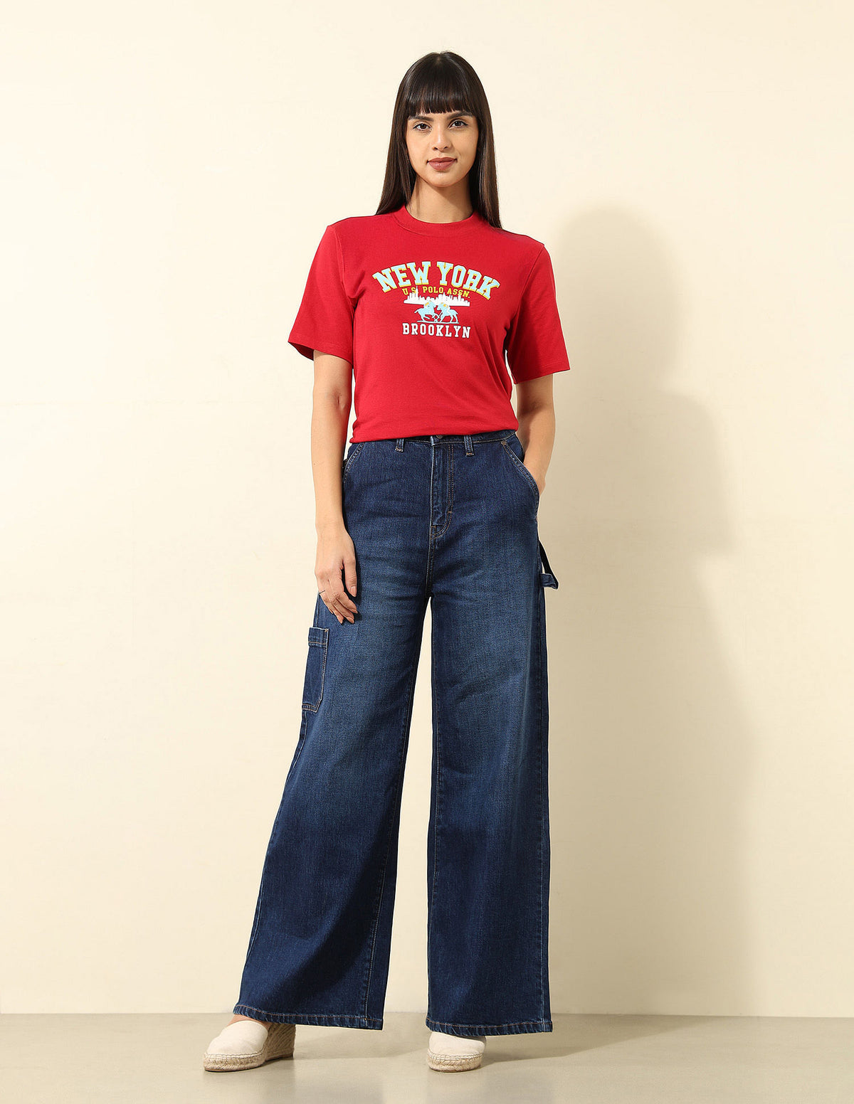 | High-rise waist | Button and zip fly closure | Five pockets | Stonewash | Denim weave | Ultra wide leg fit |