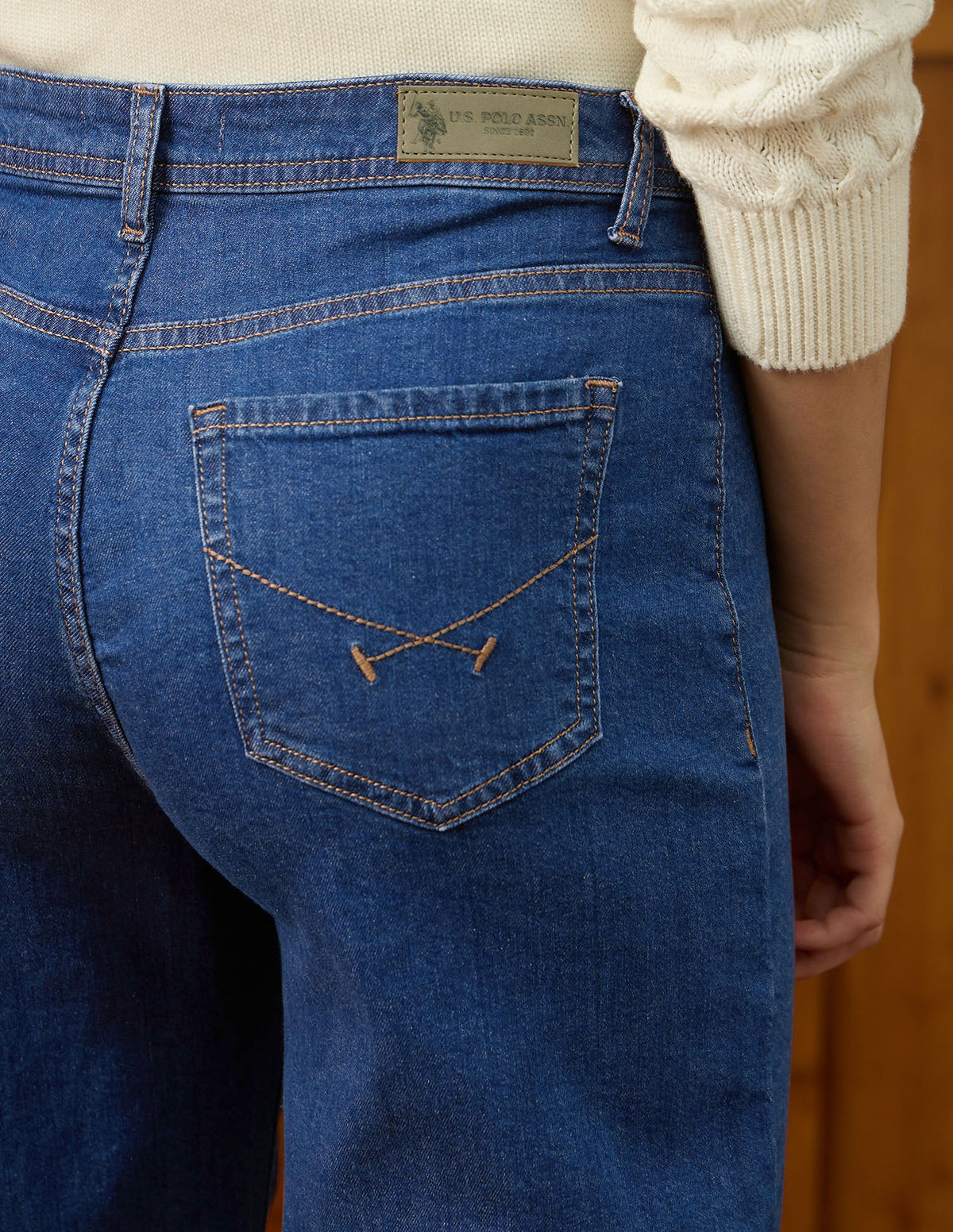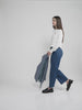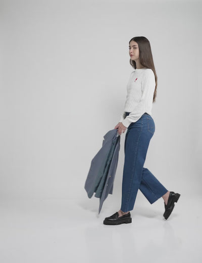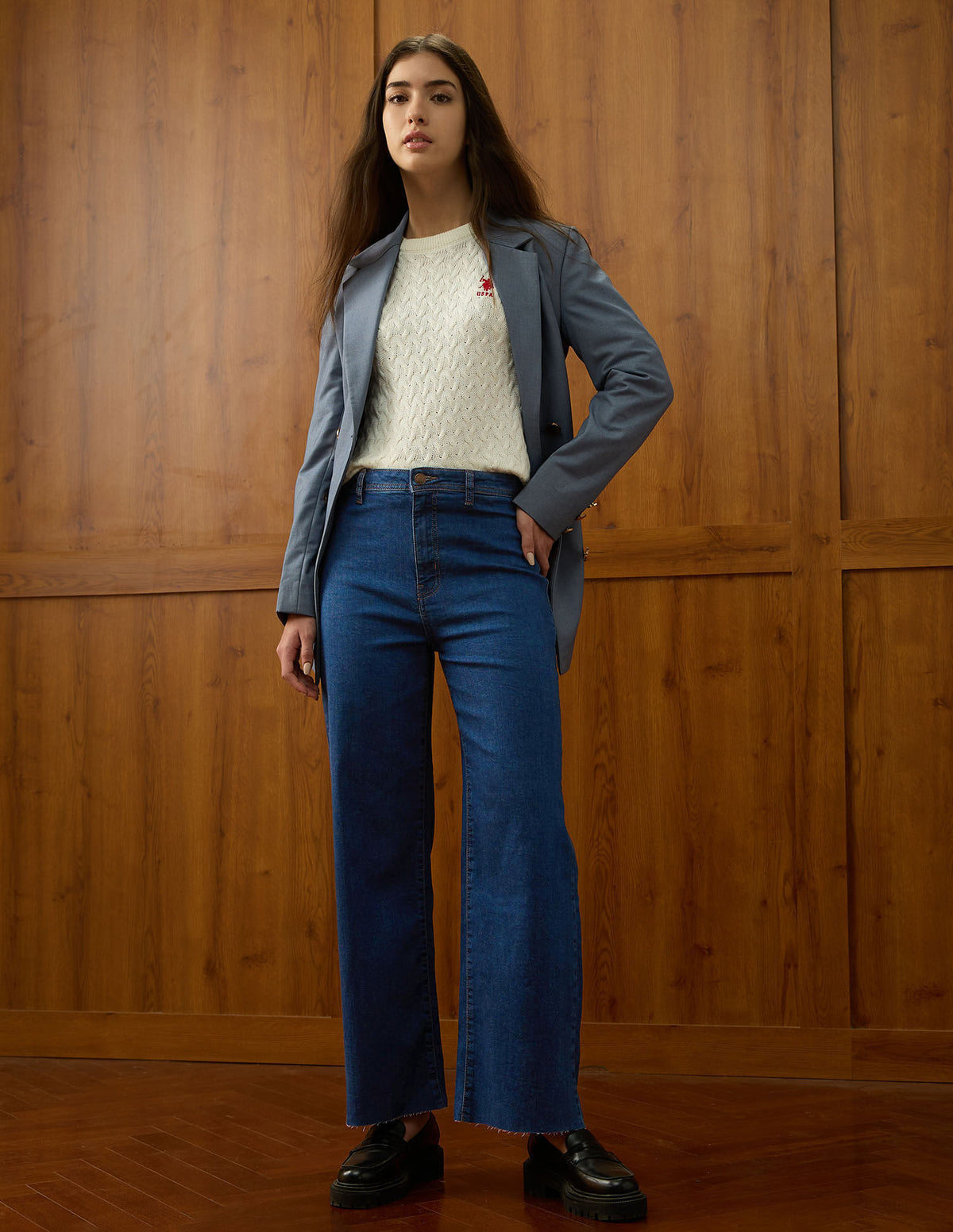 | High-rise waist | Button and zip fly closure | Five pockets | Stone wash | Denim weave | Wide leg fit |