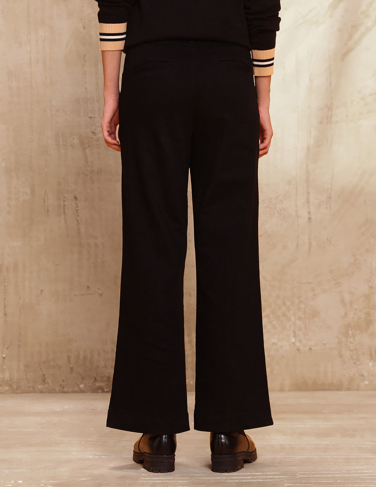 | High-rise waist | Button and zip fly closure | Five pockets | Dark wash | Denim weave | Wide leg fit |