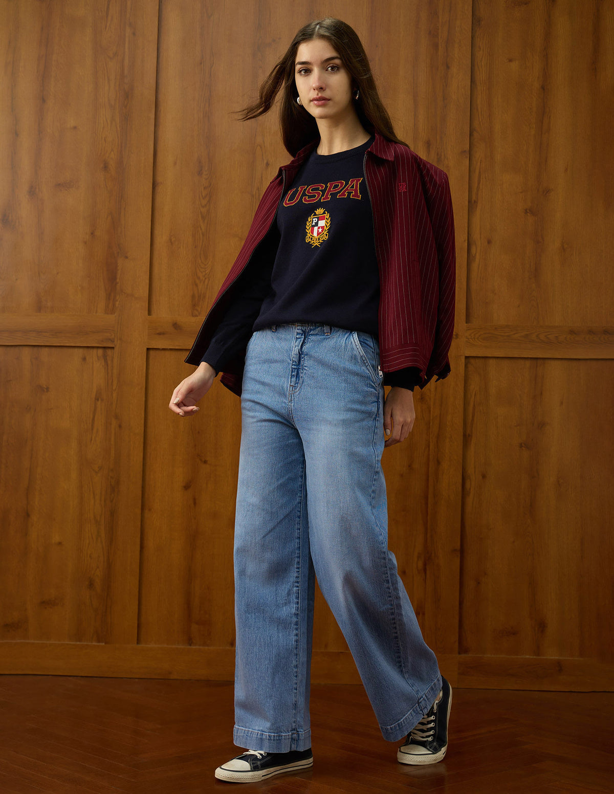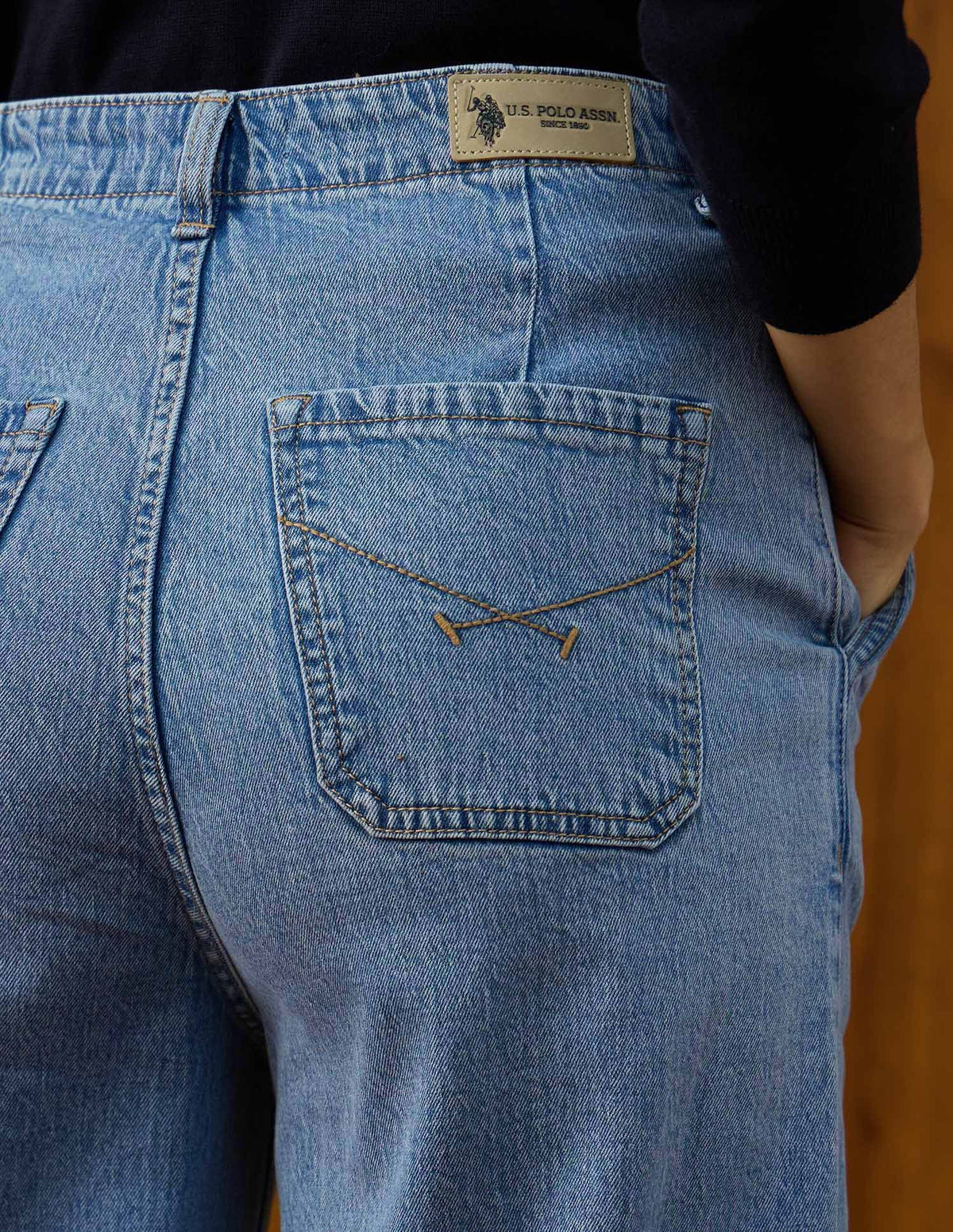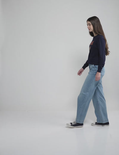 | High-rise waist | Button and zip fly closure | Five pockets | Denim weave | Wide leg fit |