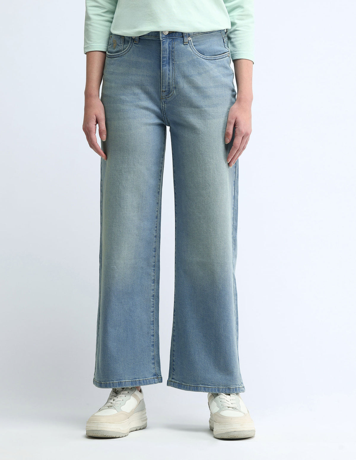 High-rise waist | Button and zip fly closure | Five pockets | Stonewashed | Clean look | Denim weave | Wide leg fit |