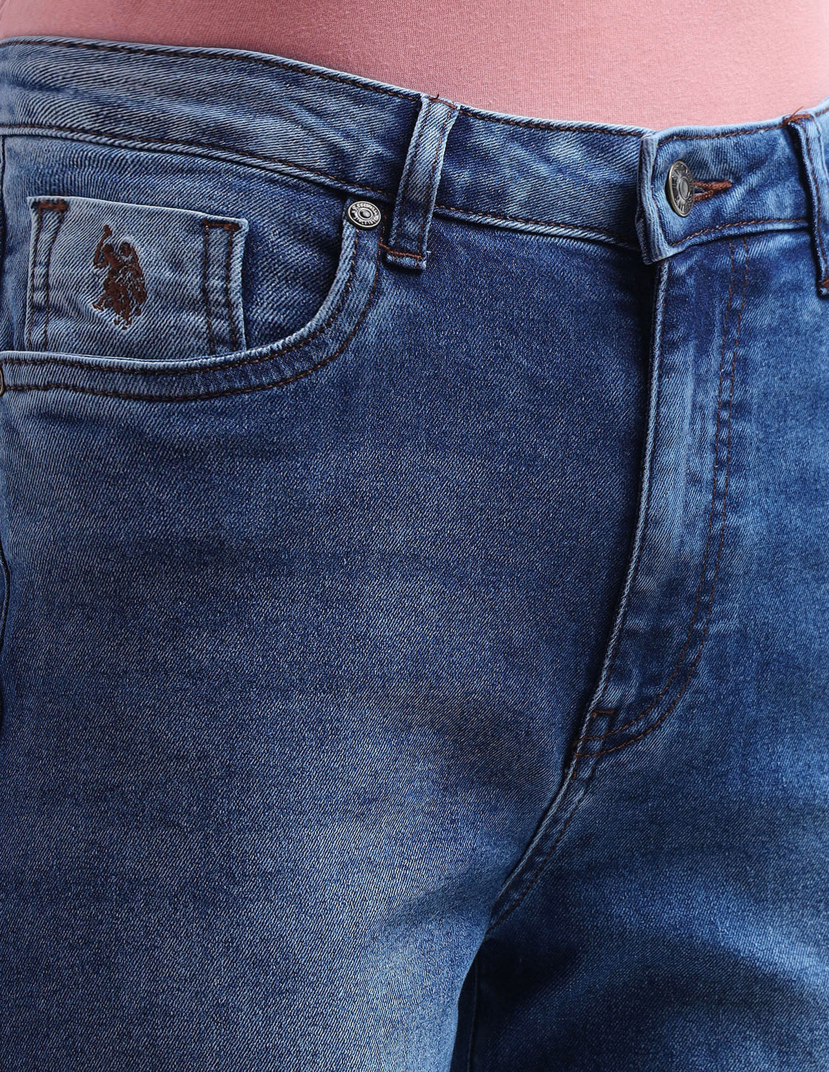 | High-rise waist | Button and zip fly closure | Five pockets | Stonewashed and whiskered | Denim weave | Wide leg fit