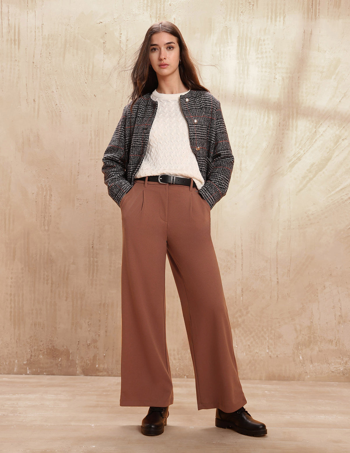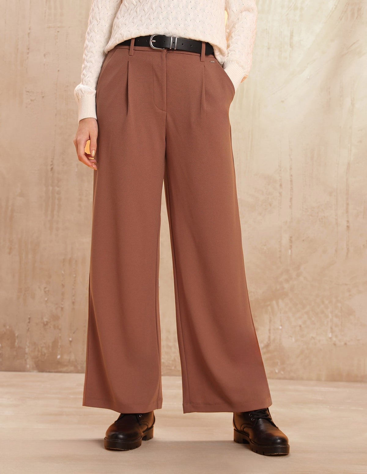 | High-rise waist | Slip-on closure | Flat front | Solid pattern | Regular weave | Wide leg fit |