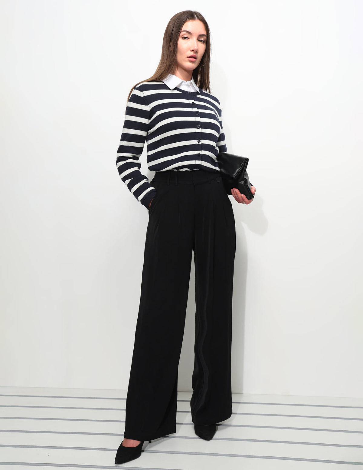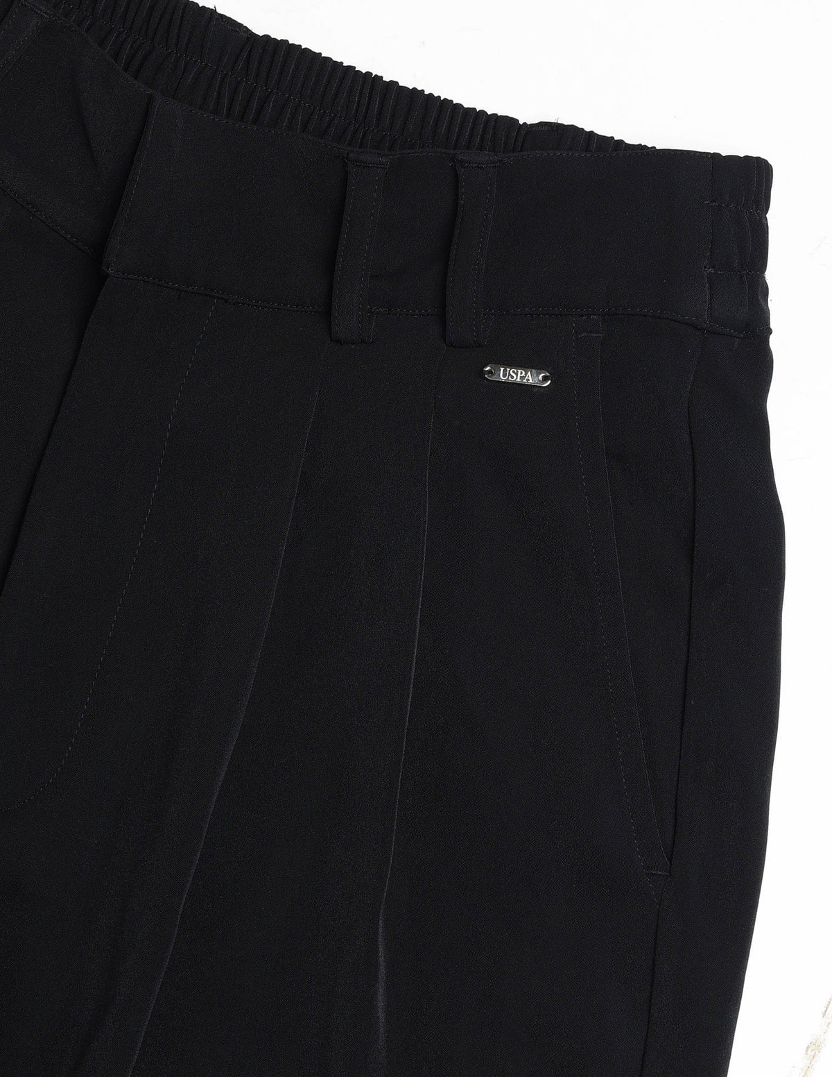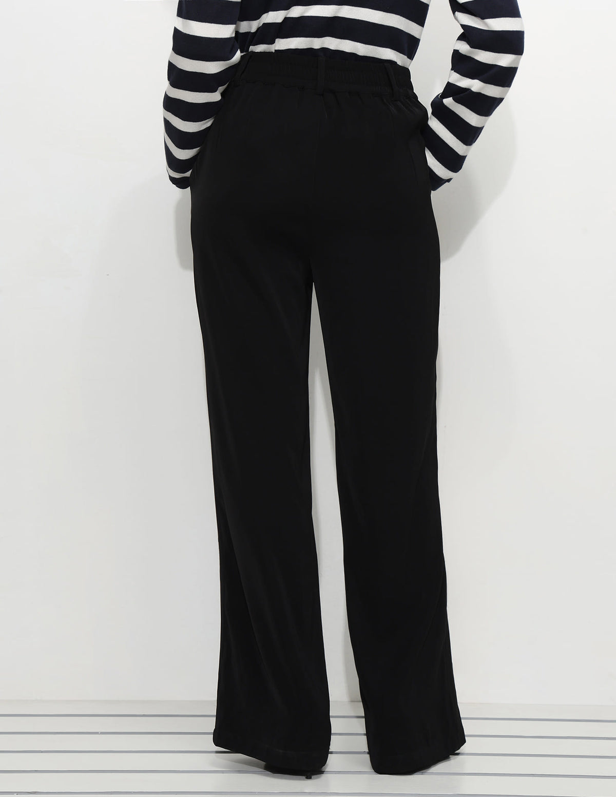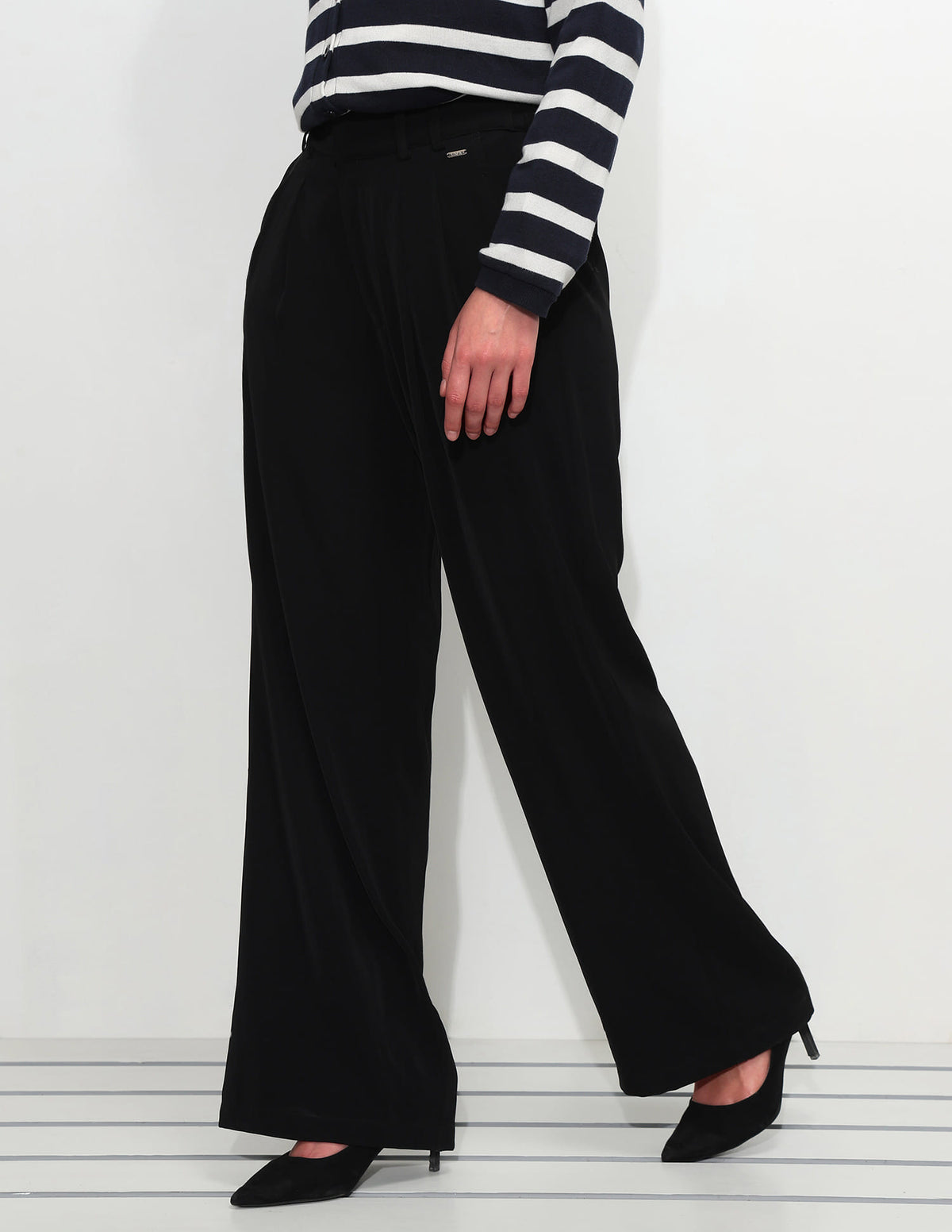 | High-rise waist | Slip-on closure | Two pockets | Flat front | Solid pattern | Regular weave | Wide leg fit |