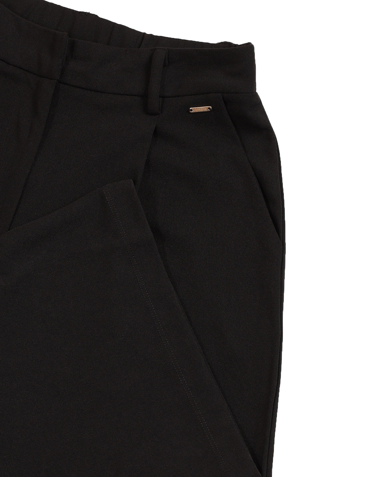 | High-rise waist | Slip-on closure | Flat front | Solid pattern | Regular weave | Wide leg fit |