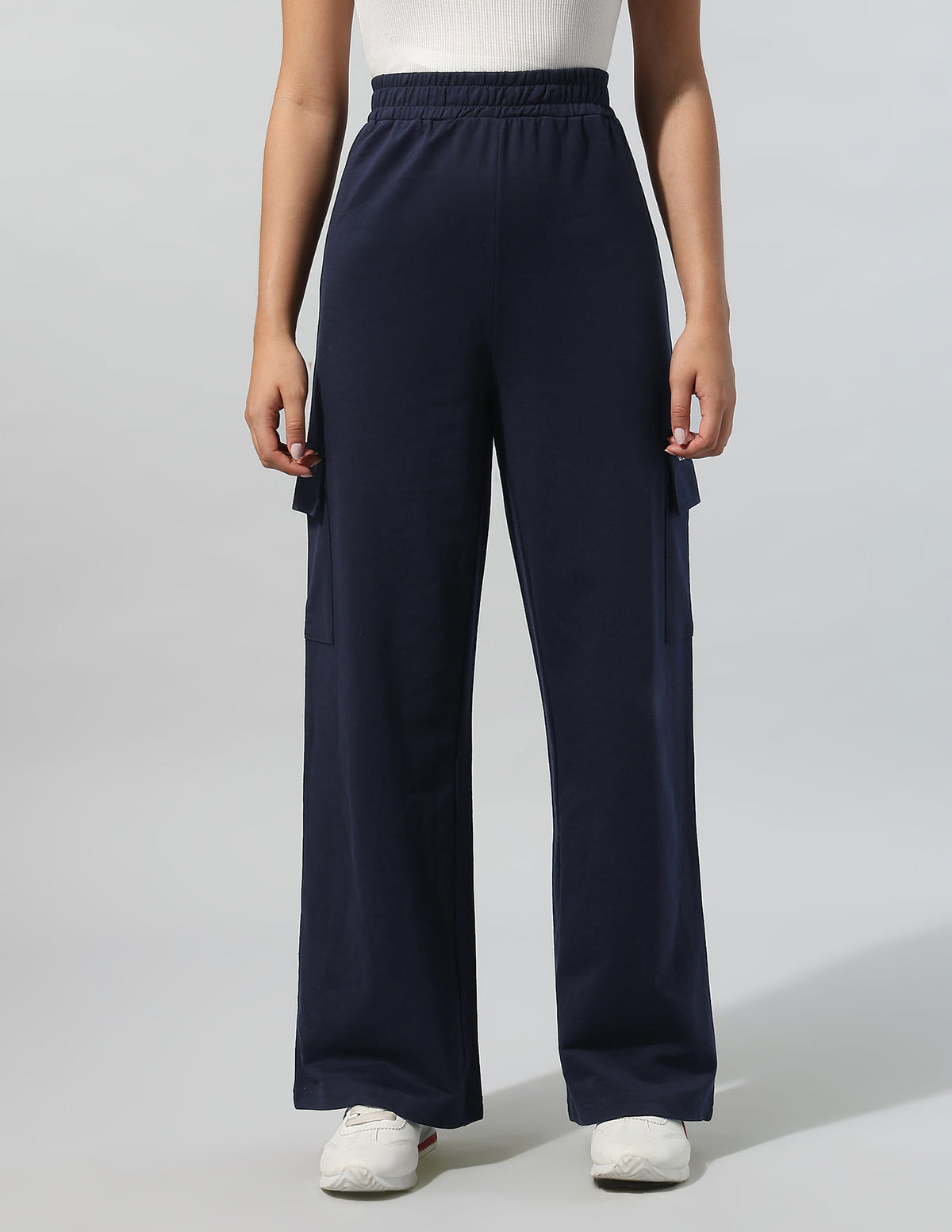 | High-rise waist | Slip-on closure | Two pockets | Solid pattern | Wide leg fit | Country Of Origin - India