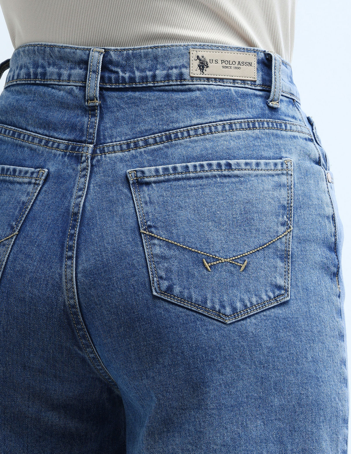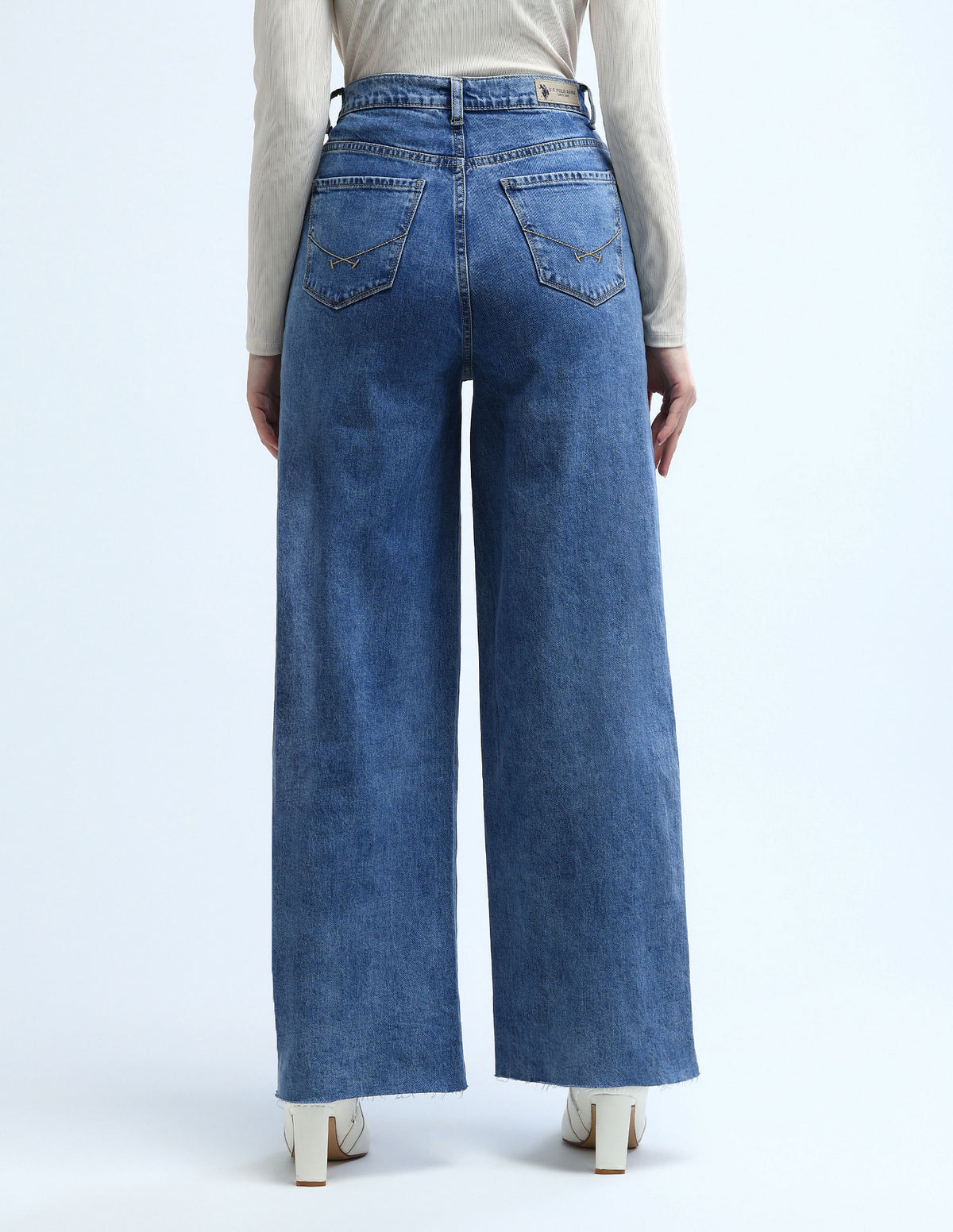 | High-rise waist | Button and zip fly closure | Five pockets | Stonewashed and whiskered | Denim weave | Wideleg fit
