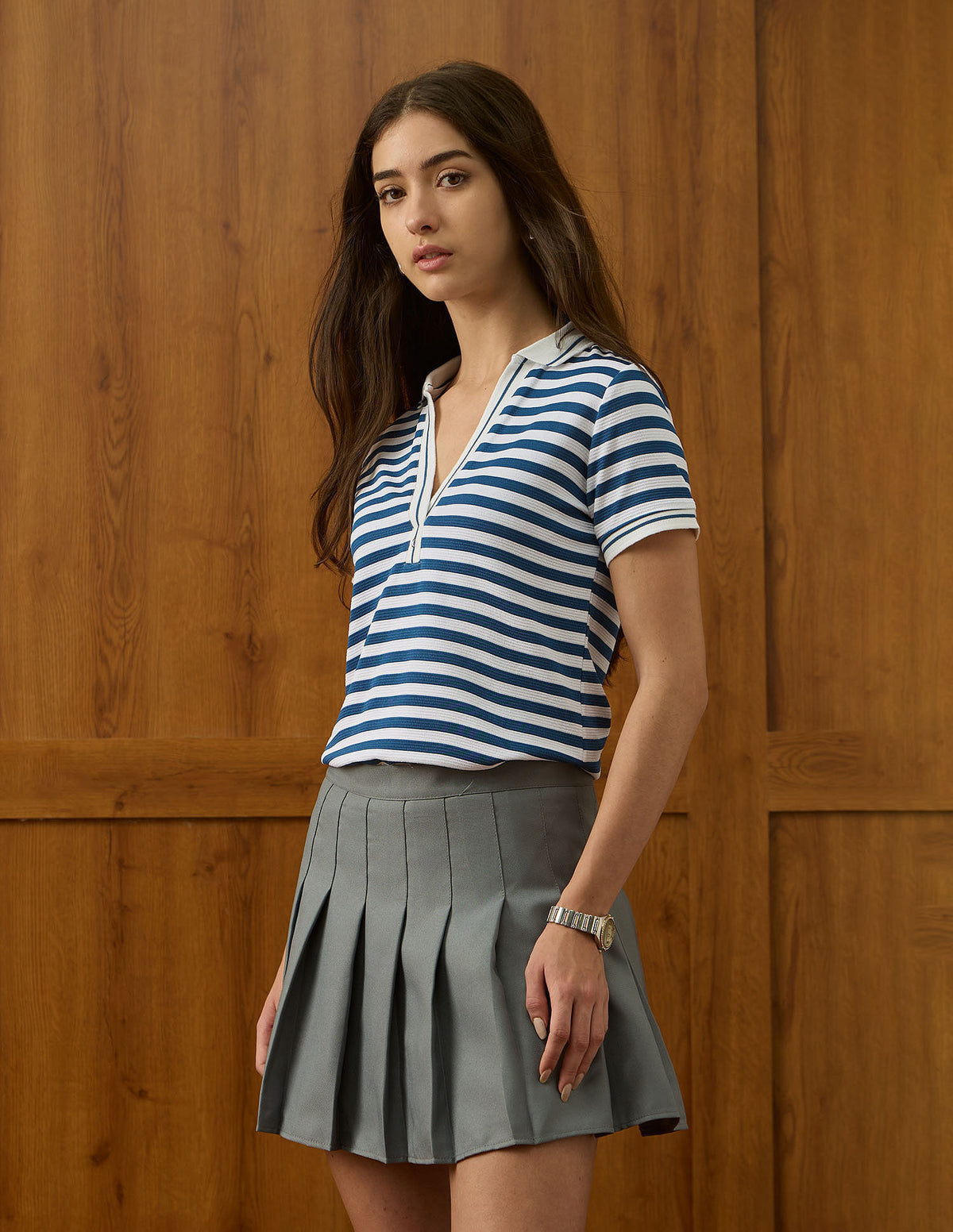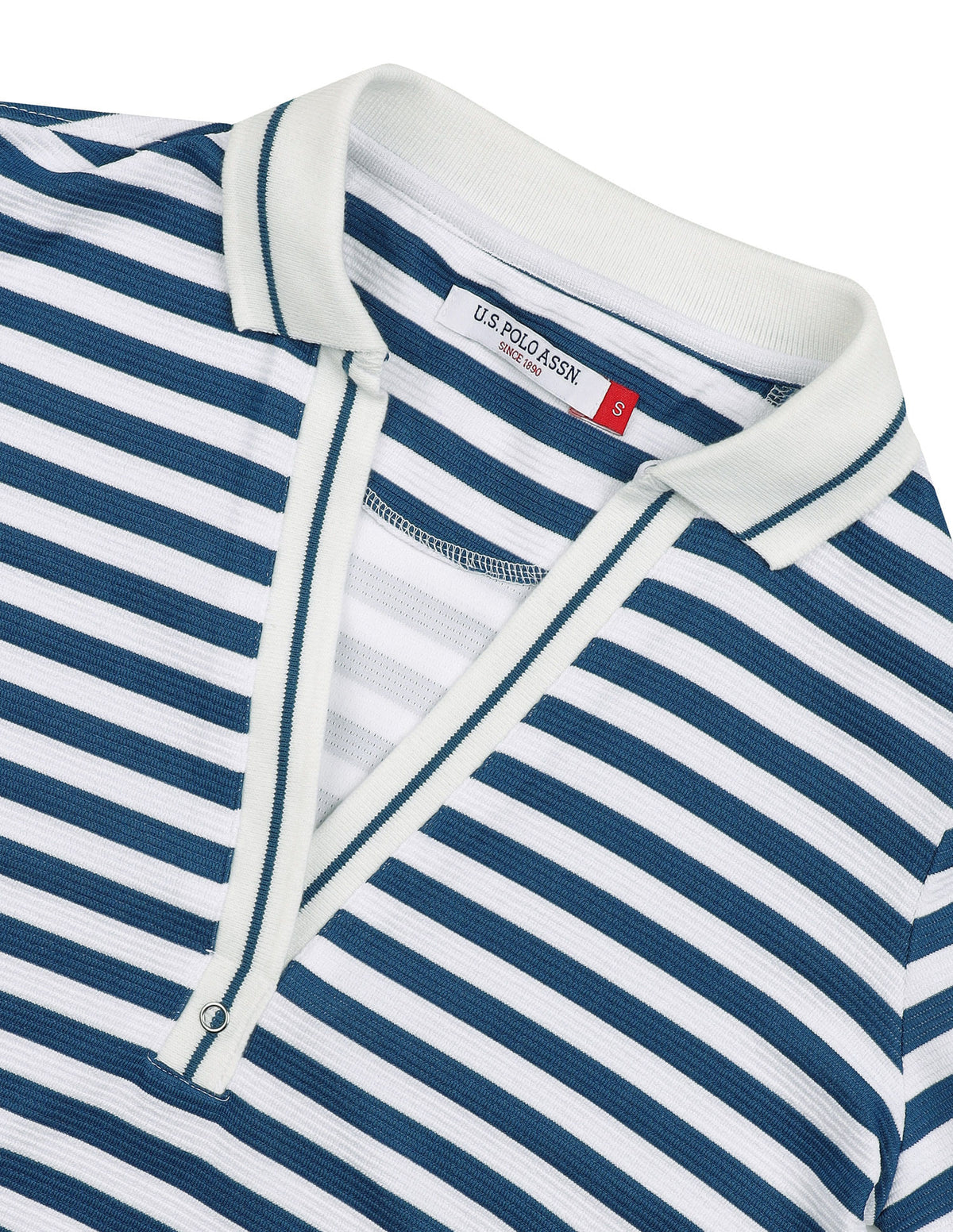 | Polo collar | Logo at chest | Open placket | Short sleeves | Ribbed collar and sleeve hems | Uneven vented hem | Horizontal striped pattern | Pique knit | Regular fit |