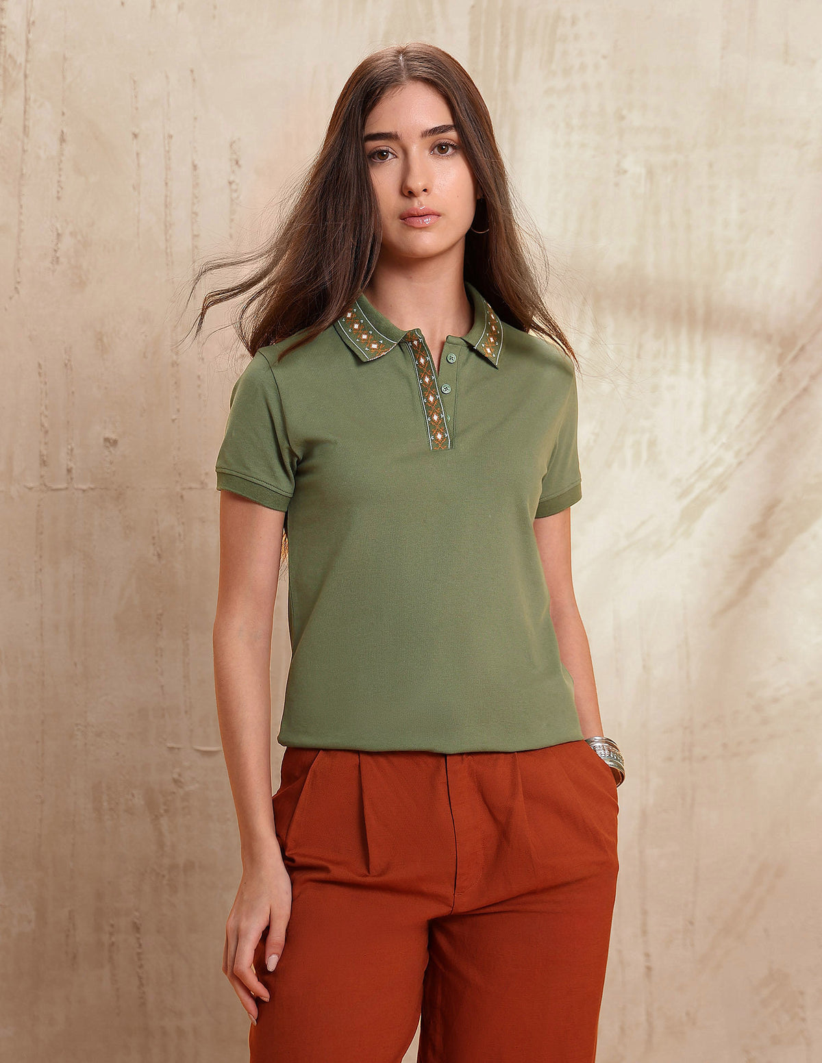 | Jacquard polo collar | Logo at chest | Short button placket | Short sleeves | Ribbed collar and sleeve hems | Uneven vented hem | Solid pattern | Pique knit | Regular fit |