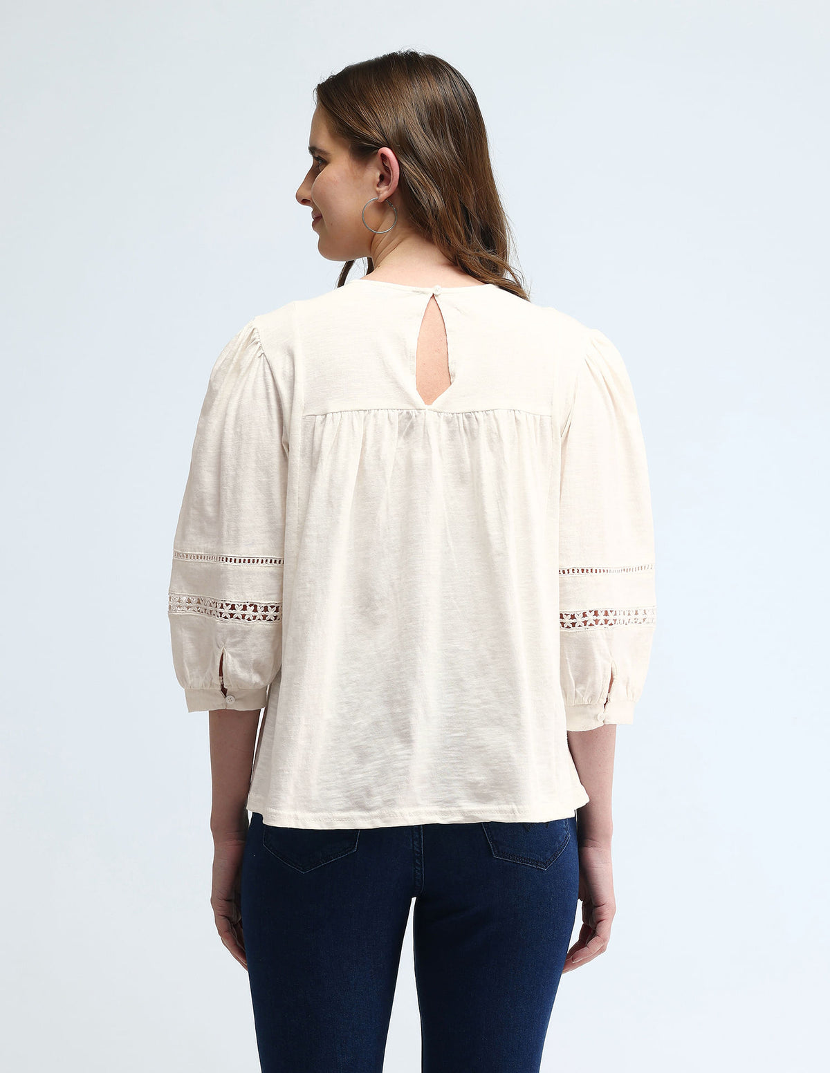 | Round neck | Lace detailed yoke at chest | Gathered near yoke | Button and loop closure at back | Long sleeves with buttoned closure | Straight hemline | Solid pattern | Regular weave | Regular fit |