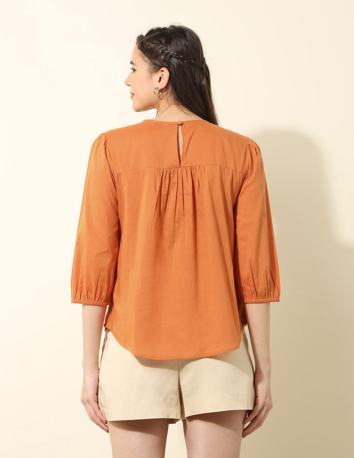 | Round neck | Lace detailed yoke at chest | Gathered near yoke | Button and loop closure at back | Long sleeves with buttoned closure | Straight hemline | Solid pattern | Regular weave | Regular fit |