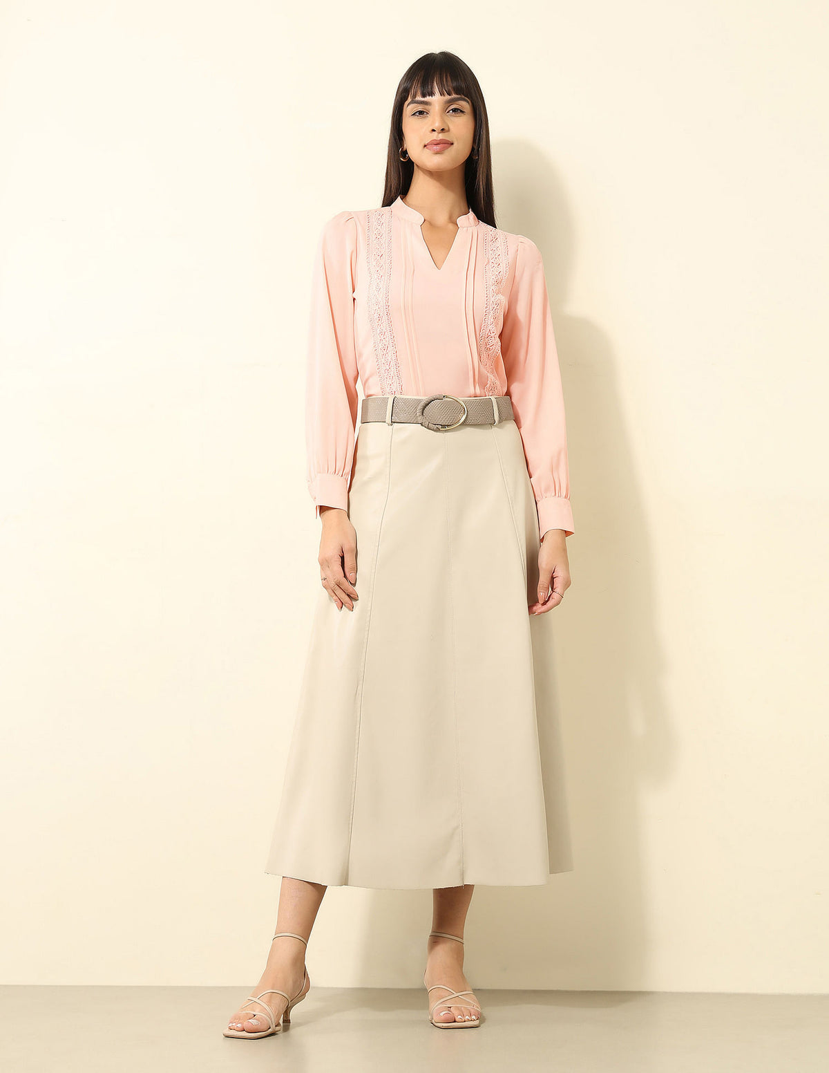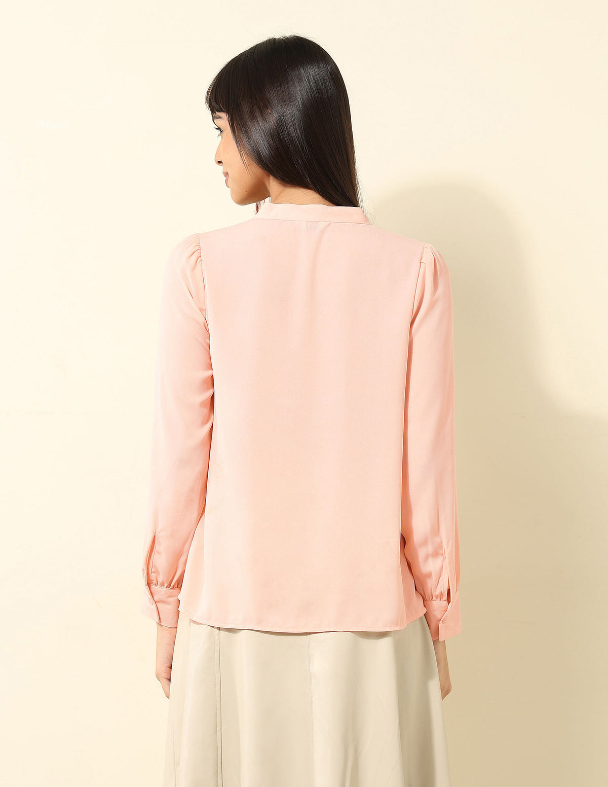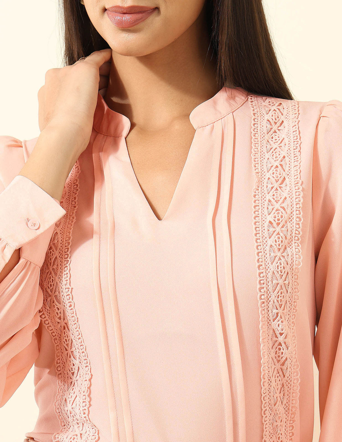 | Mandarin collar | Lace detailed | Long sleeves with elasticized hems | Straight hemline | Solid pattern | Regular weave | Regular fit |