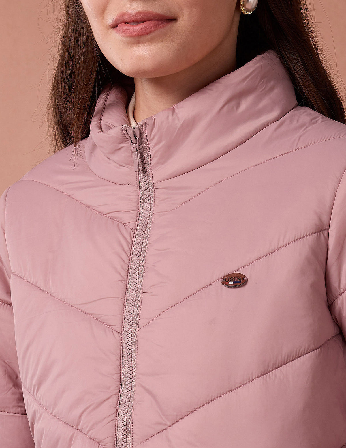 | High neck | Logo at chest | Full zipper closure | Long sleeves | Two pockets | Quilted construction | Solid pattern |