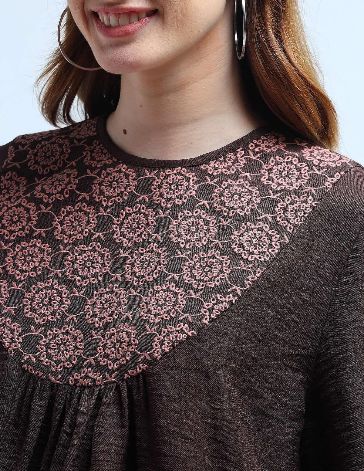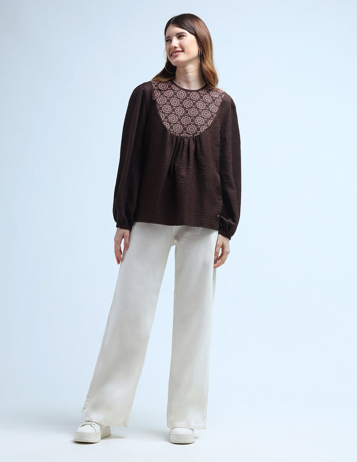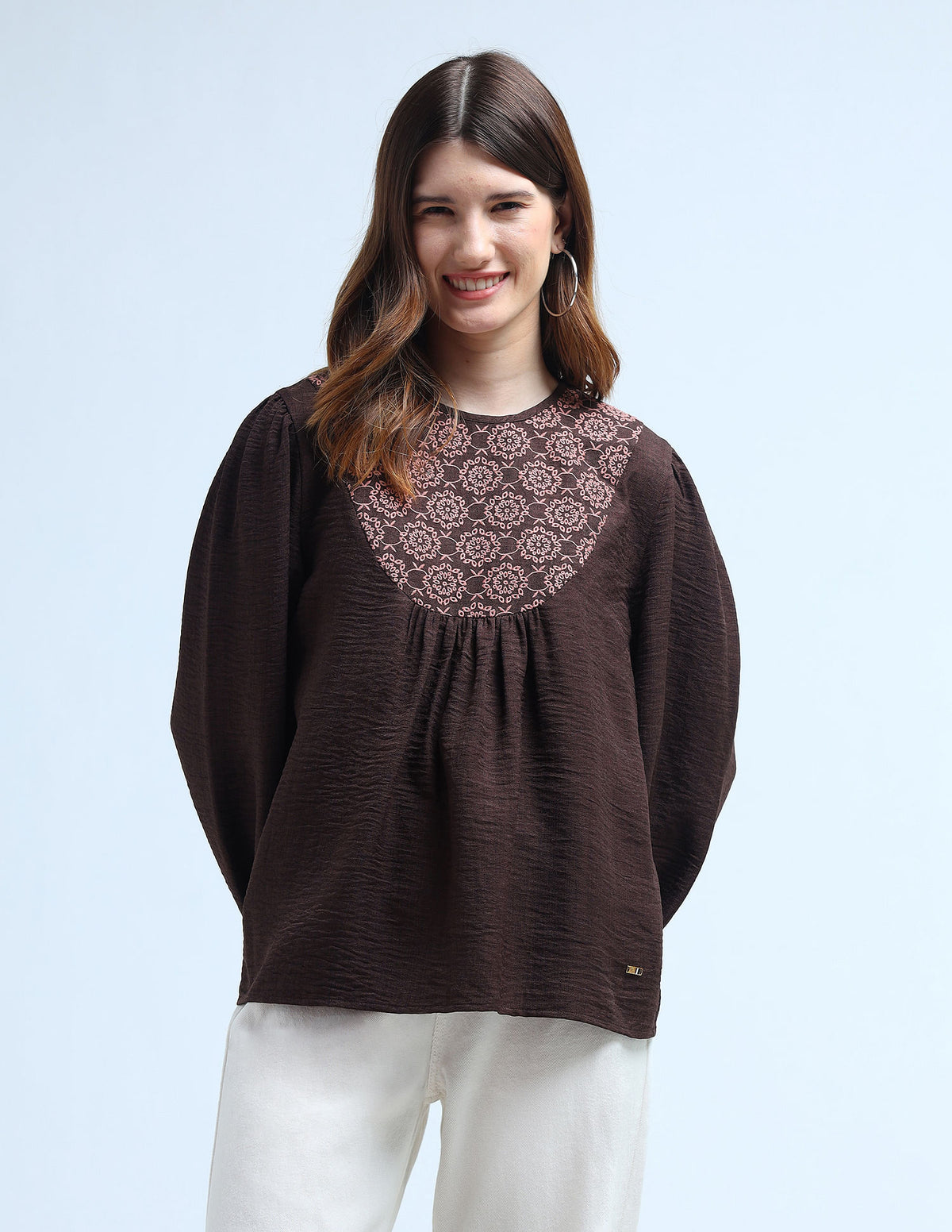 | Round neck | Embroidered detailed yoke at chest | Gathered near yoke | Button and loop closure at back | Long sleeves with elasticized hems | Straight hemline | Textured pattern | Twill weave | Loose fit