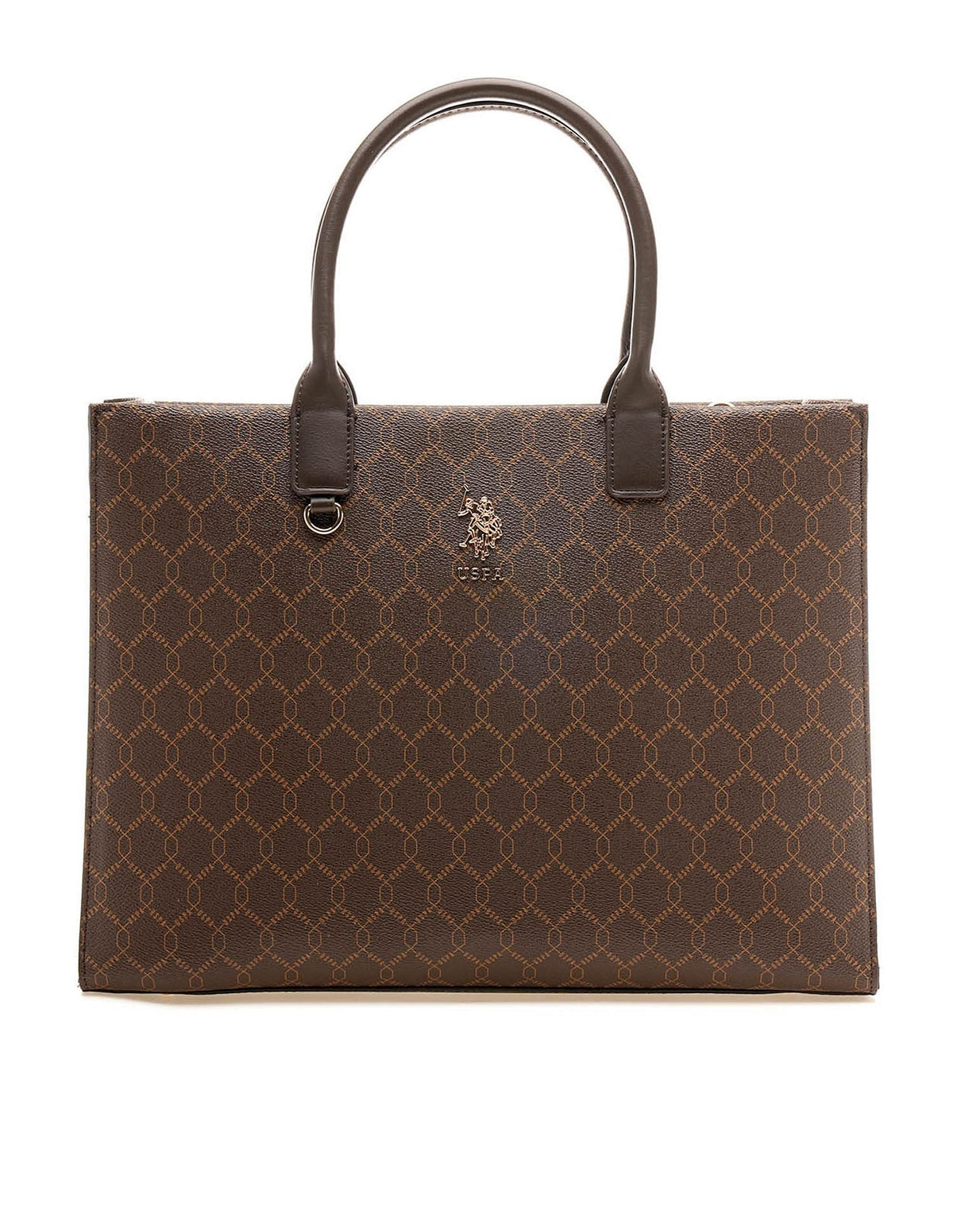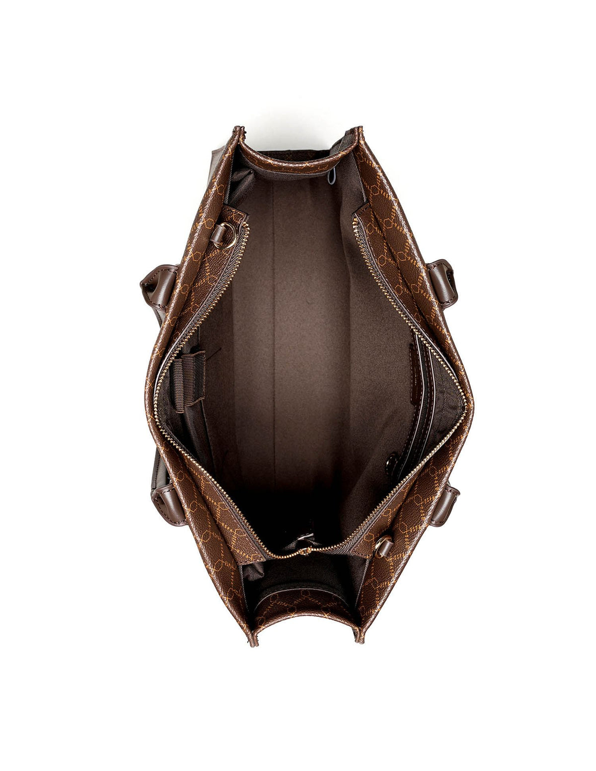 | Top handles | Metallic monogram accent at front | One main compartment with zipper closure | All over monogram jacquard pattern |