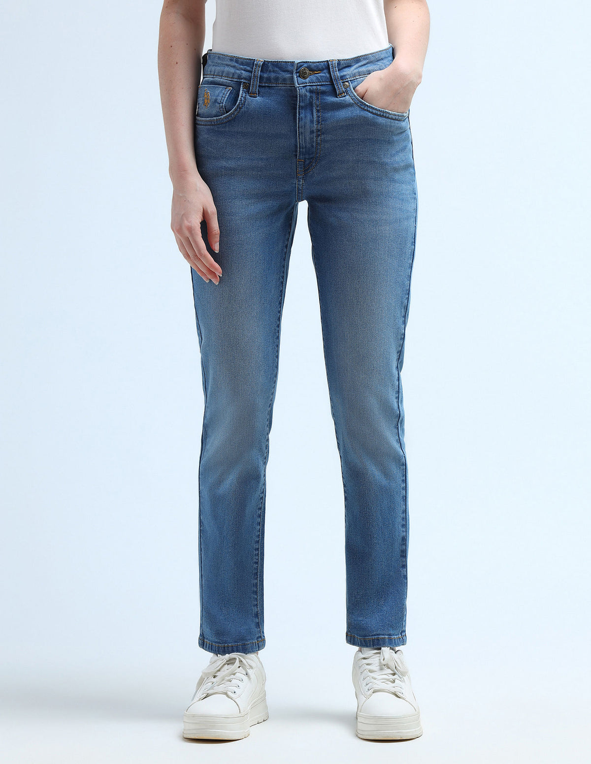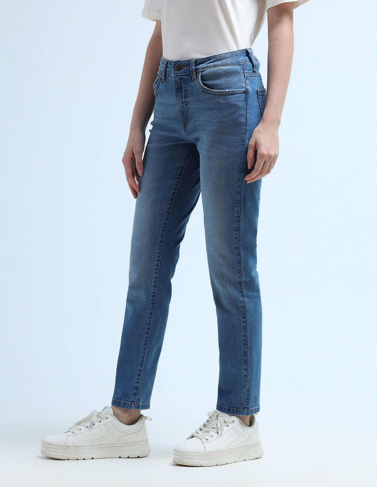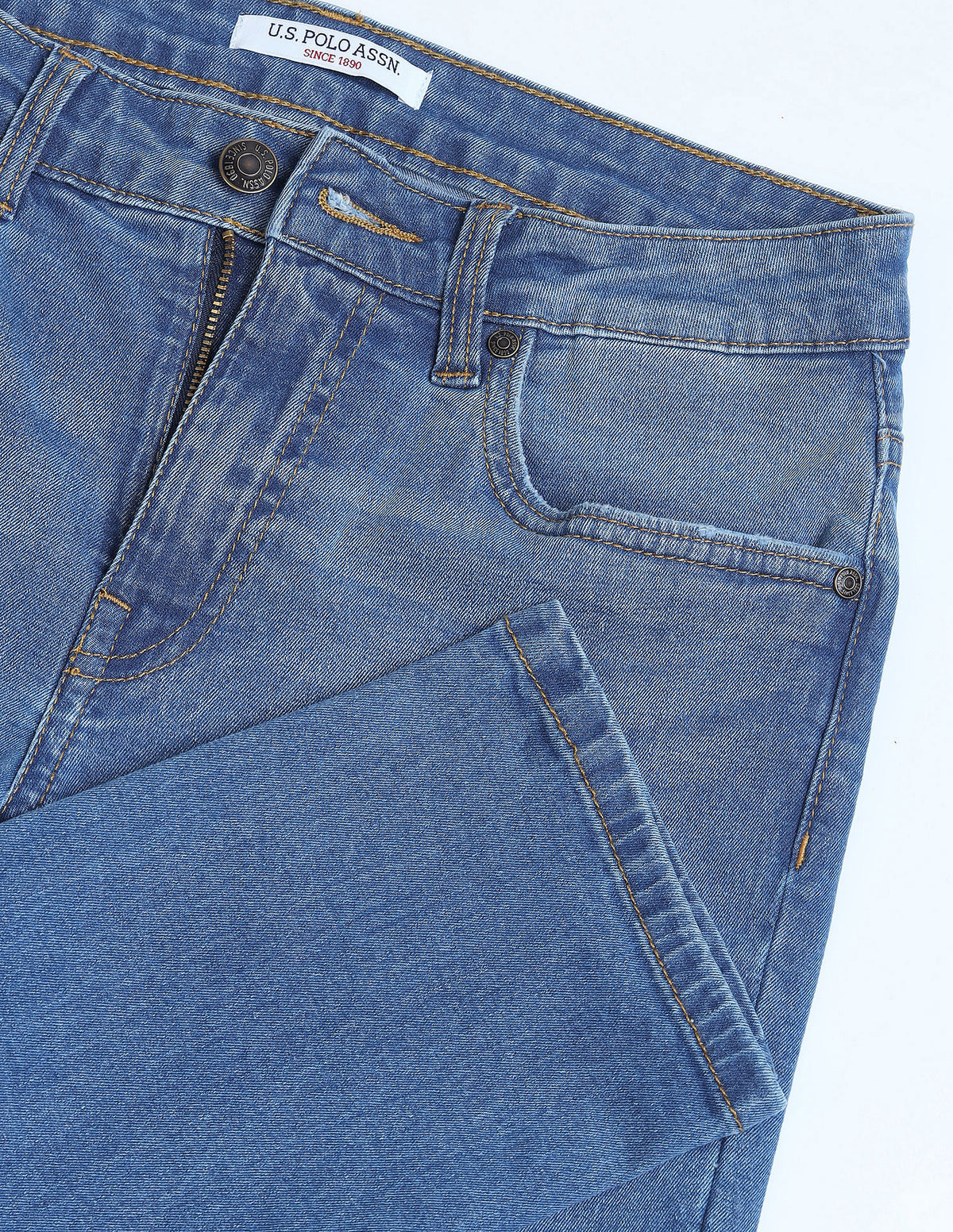 | Mid-rise waist | Button and zip fly closure | Five pockets | Stonewashed and whiskered | Denim weave | Slim fit