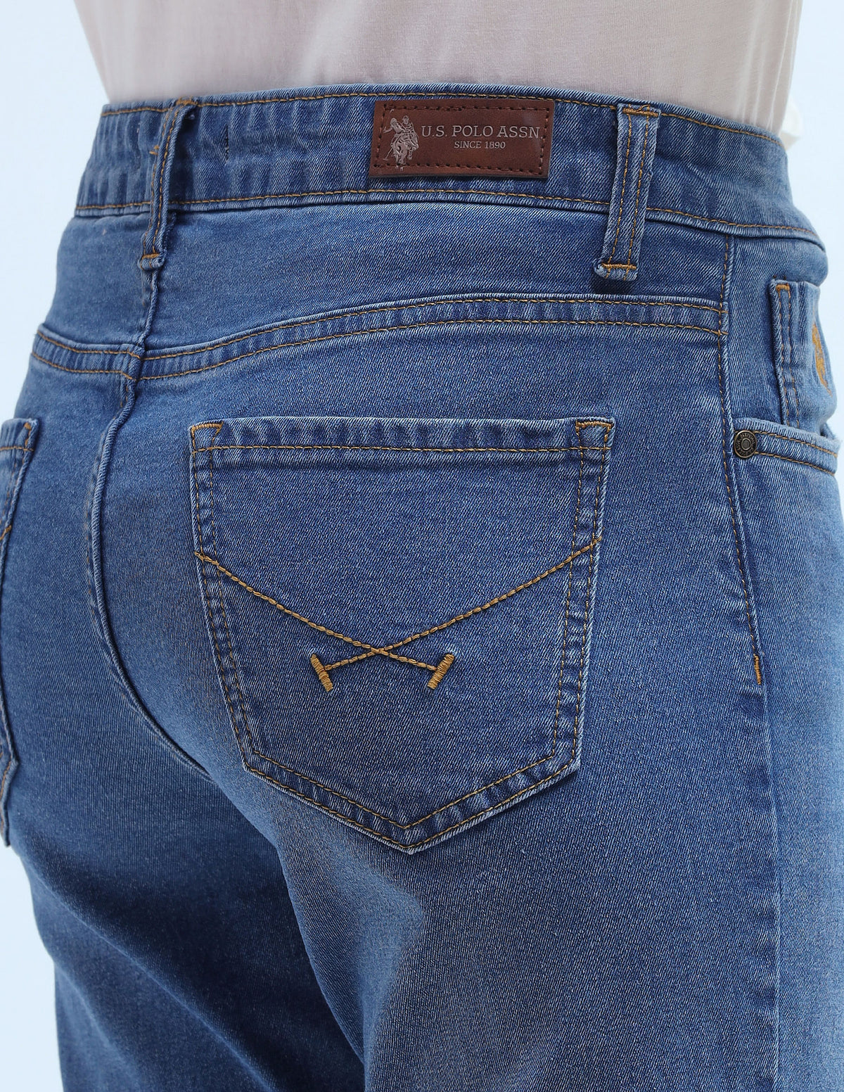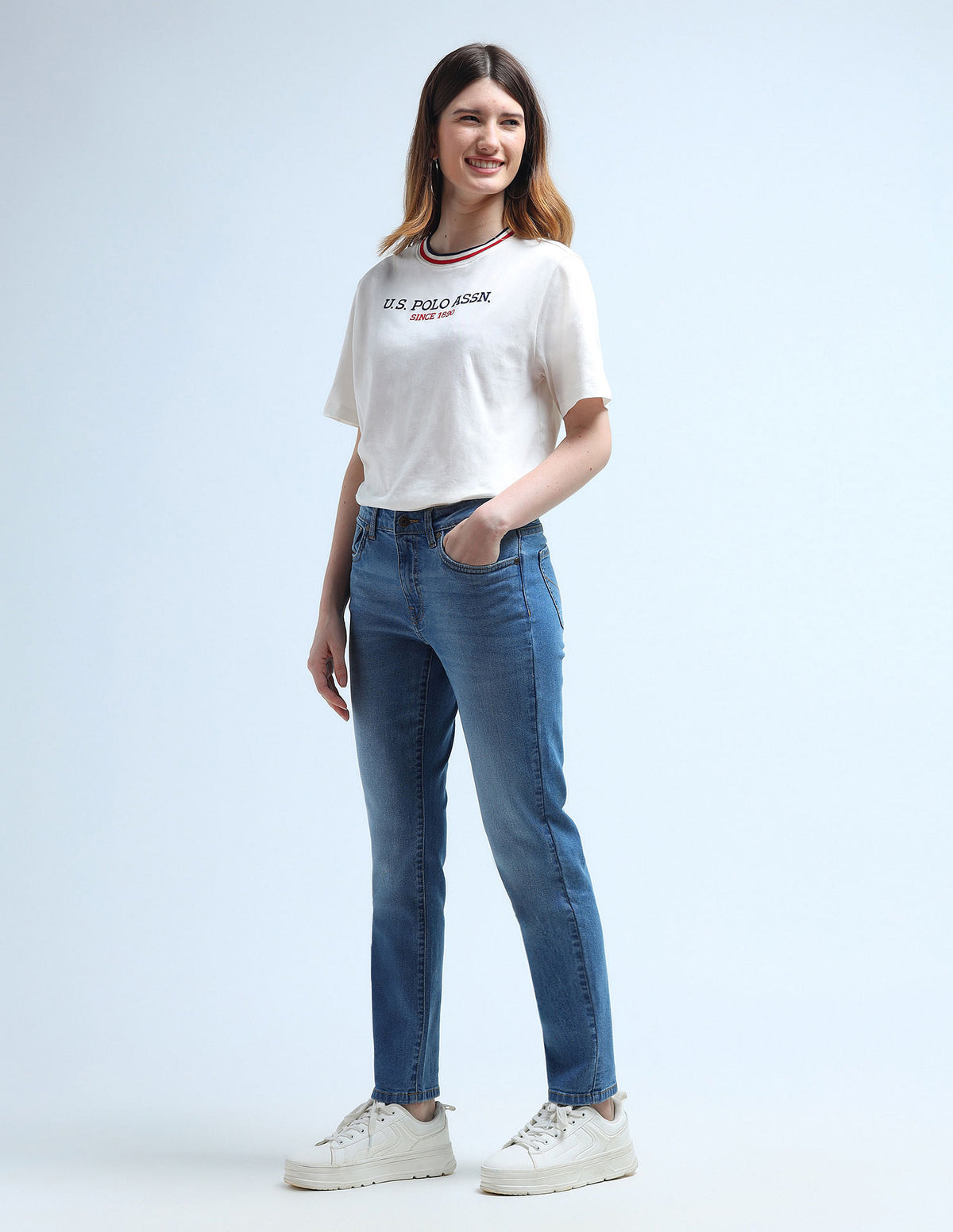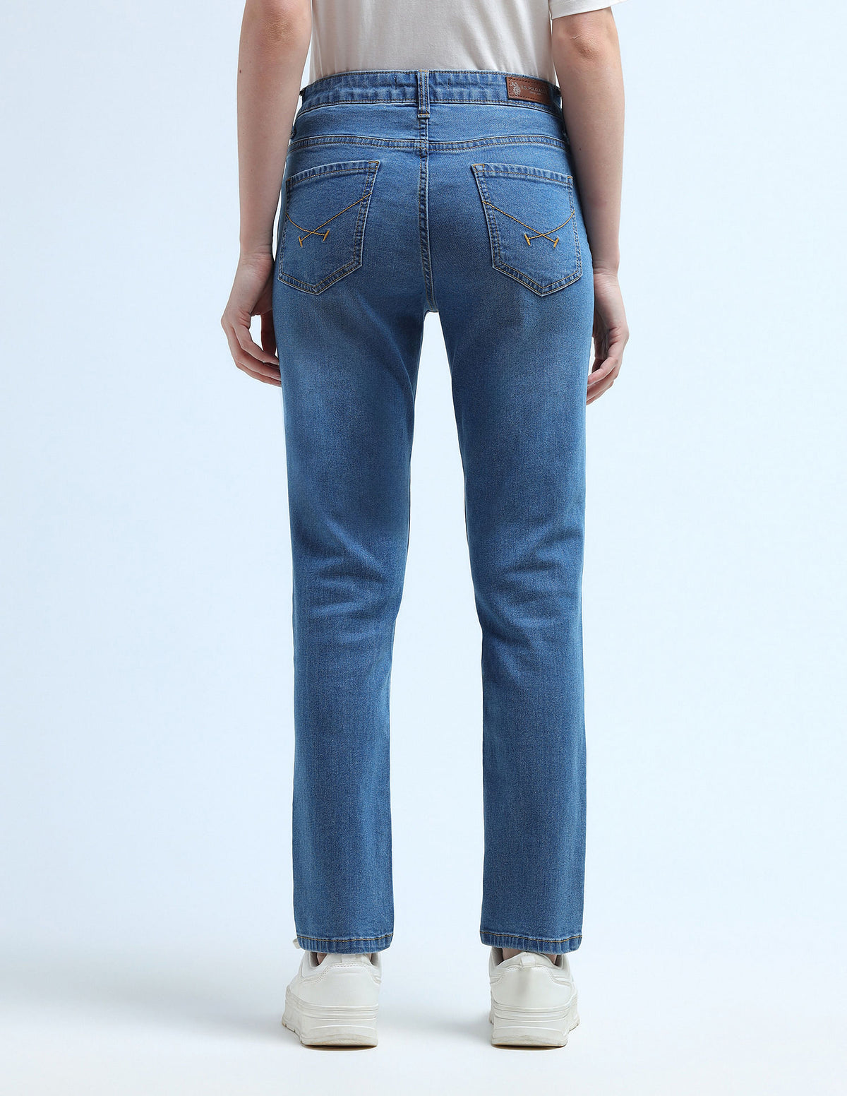 | Mid-rise waist | Button and zip fly closure | Five pockets | Stonewashed and whiskered | Denim weave | Slim fit