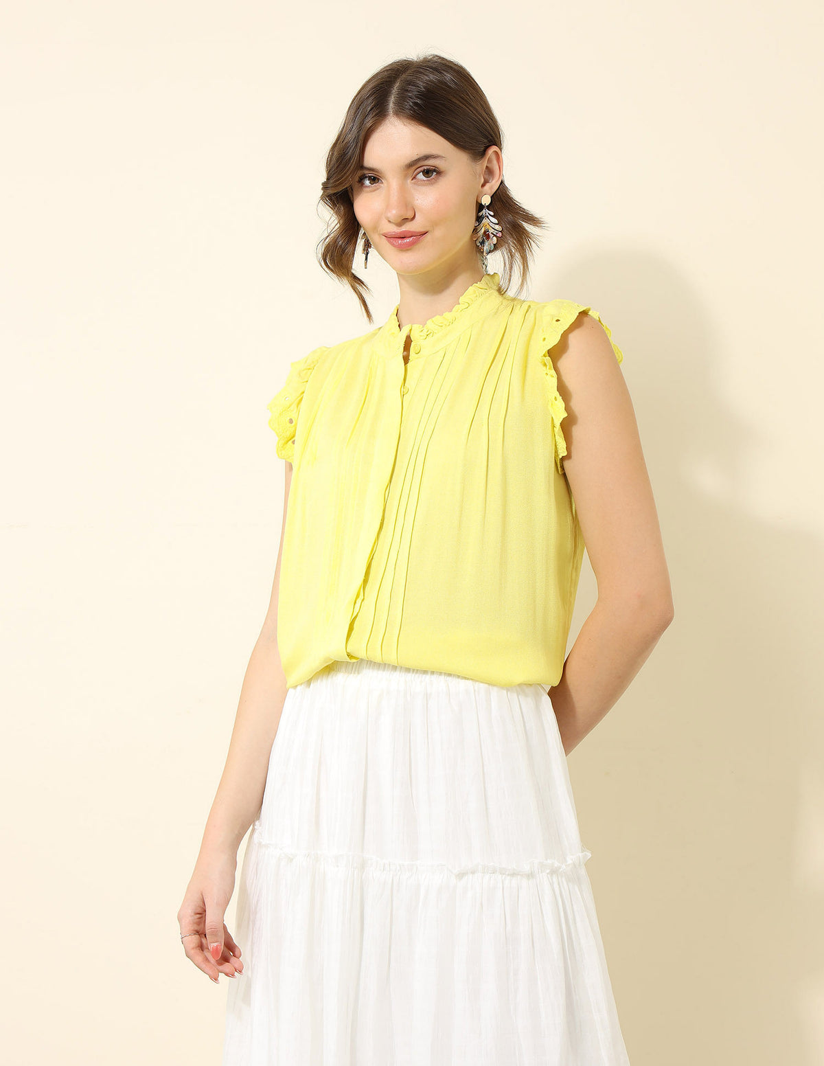 | Round neck | Full concealed button closure placket | Gathered near yoke | Short sleeves | Straight hemline | Solid pattern | Regular weave | Regular fit |
