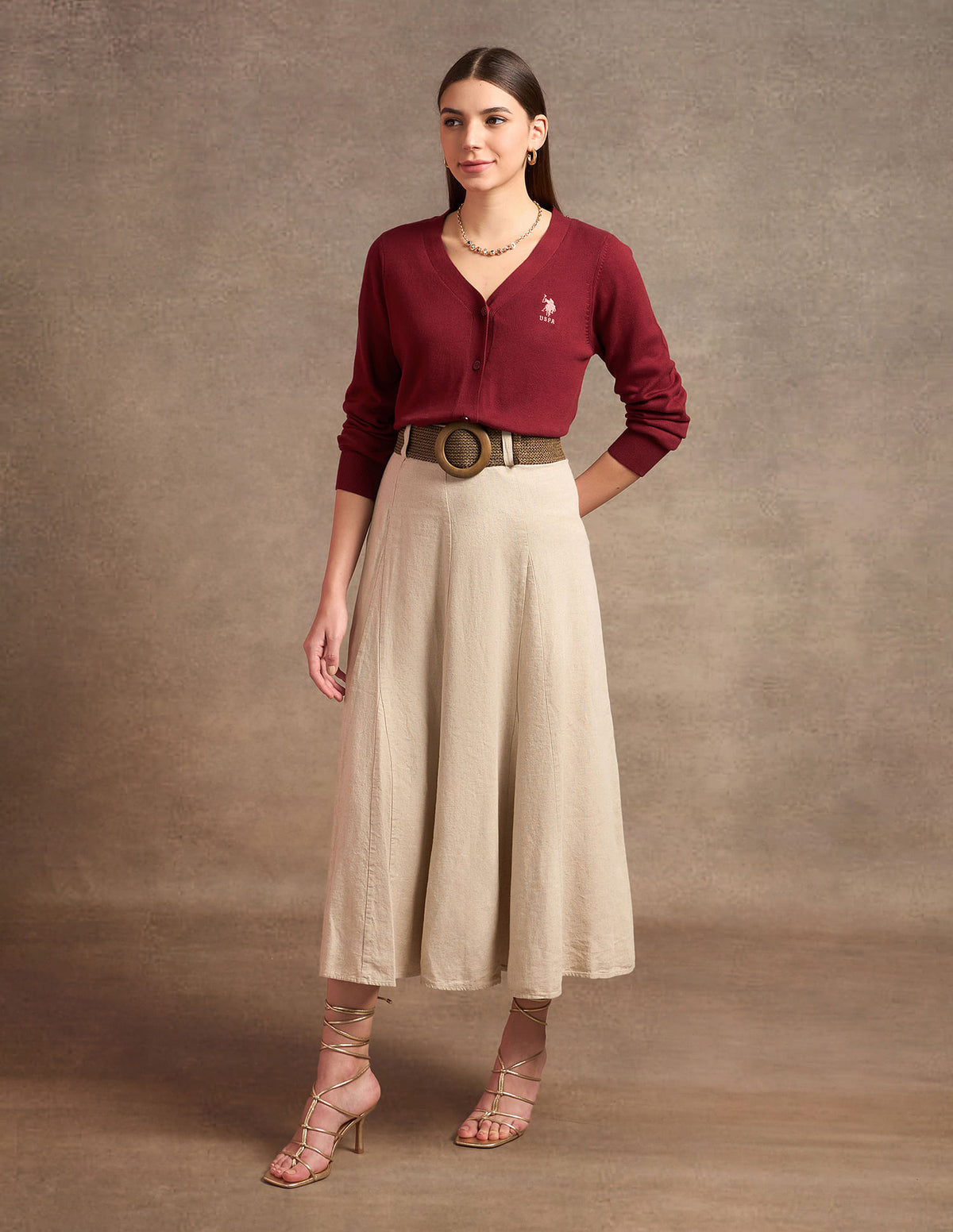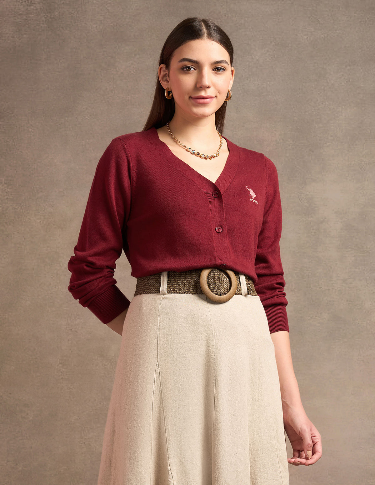 | V-neck | Full button closure | Logo at chest | Long sleeves | Ribbed neck, sleeve hems and hemline | Solid pattern | Knitted | Regular fit | Country Of Origin - India