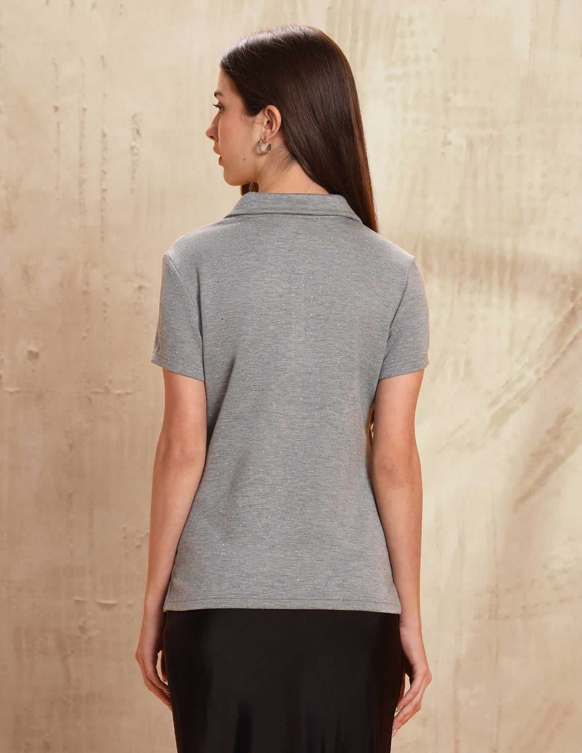 | Polo collar | Logo at chest | Short button placket | Short sleeves | Ribbed collar and sleeve hems | Uneven vented hem | Embellished pattern | Pique knit | Regular fit |