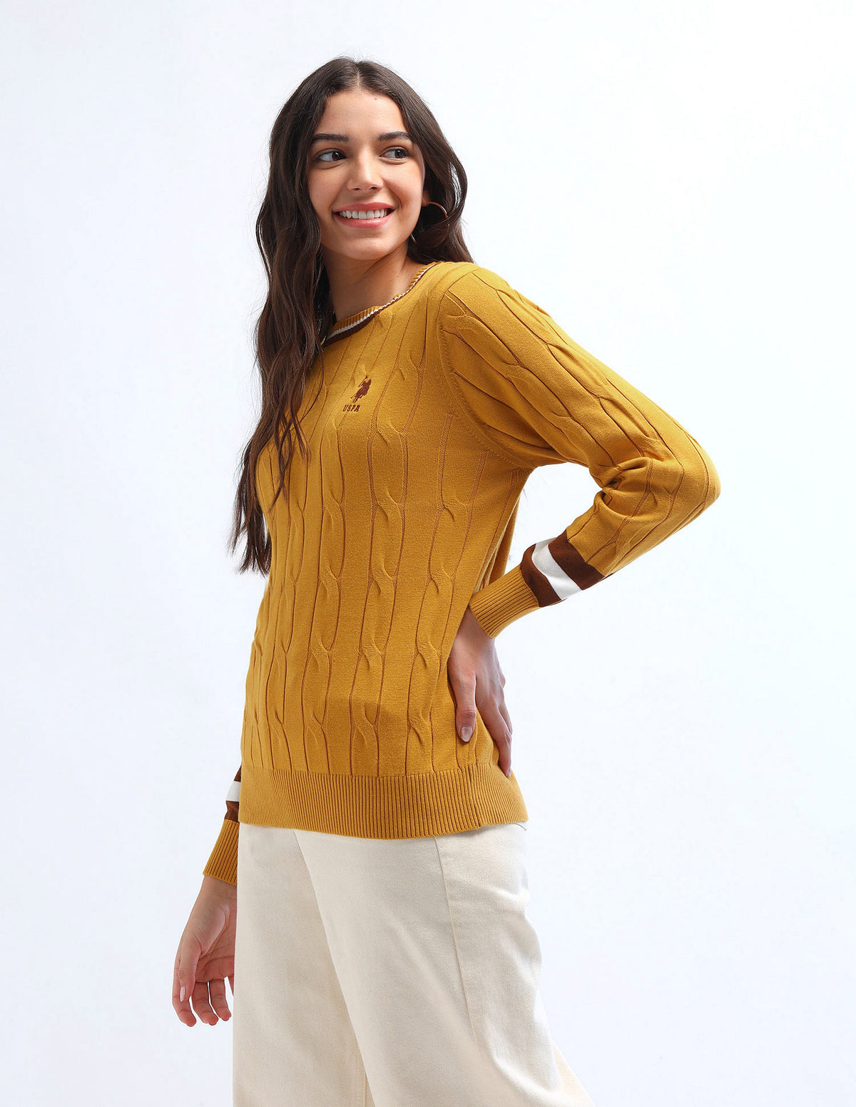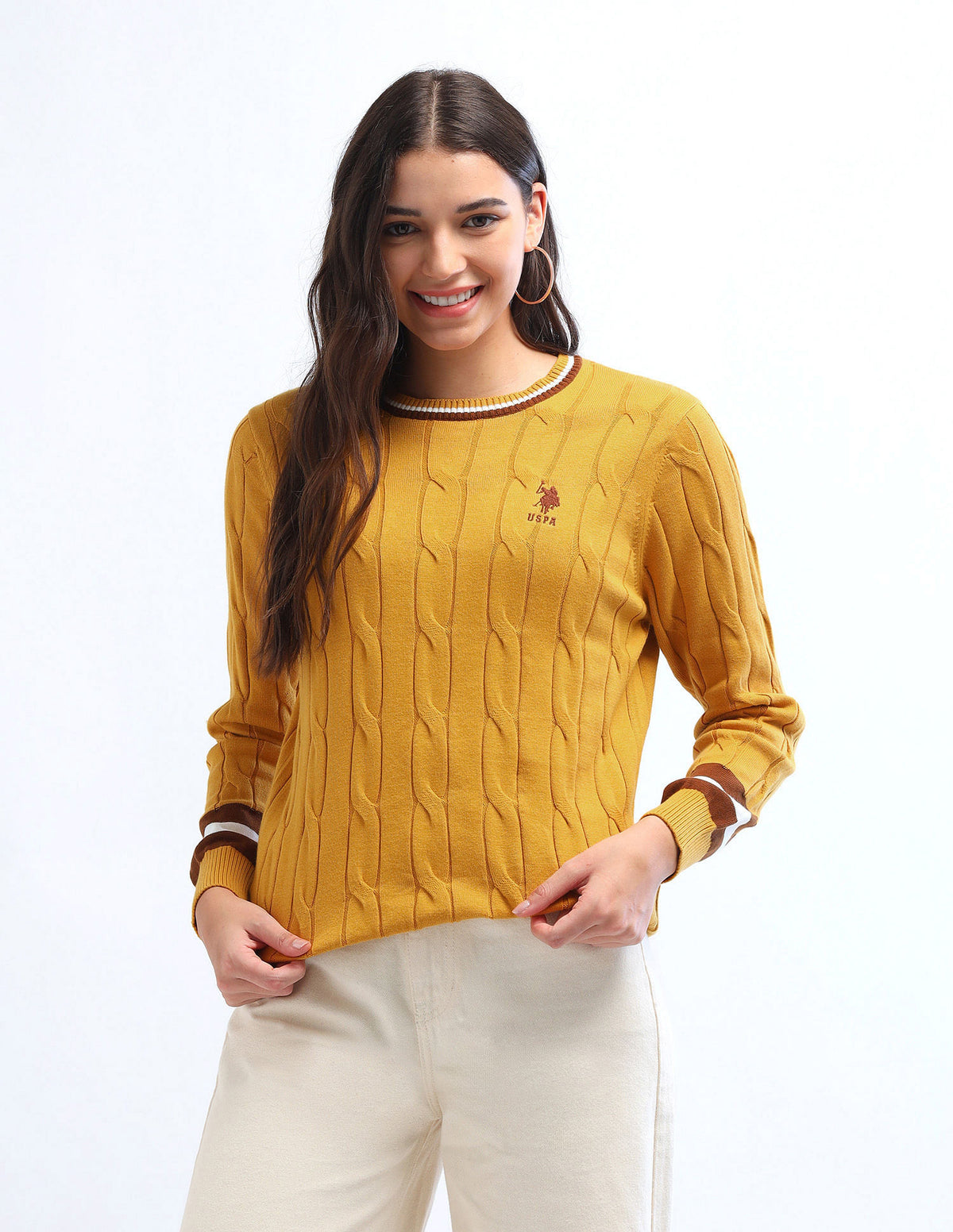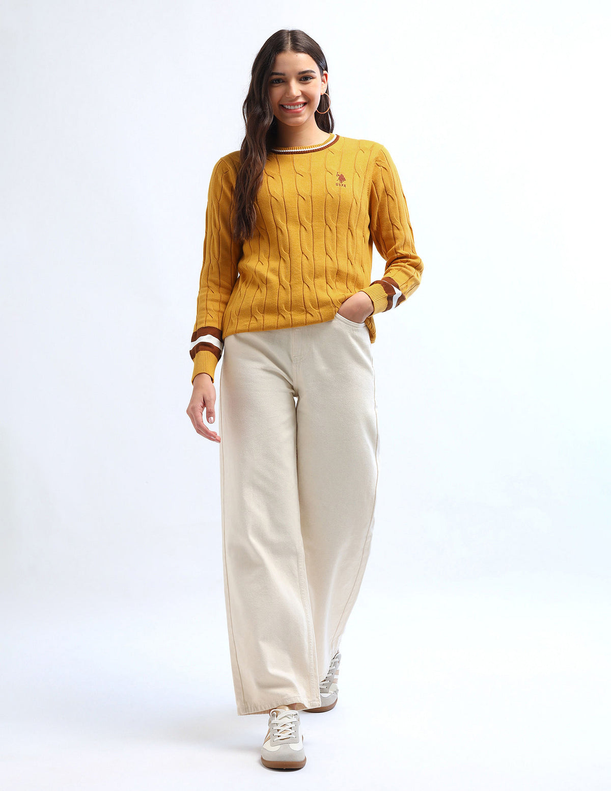 | Crew neck | Long sleeves | Ribbed neck, sleeve hems and hemline | Cable knit pattern | Regular fit |