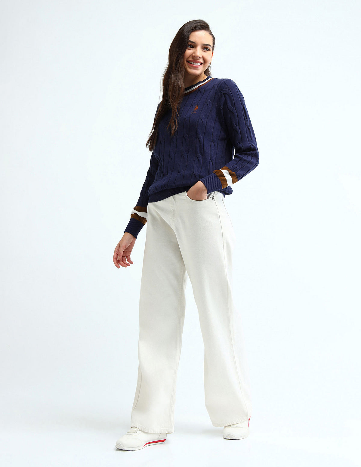 | Crew neck | Logo at chest | Long sleeves | Ribbed neck, sleeve hems and hemline | Solid pattern | Cable knit | Regular fit | Country Of Origin - India