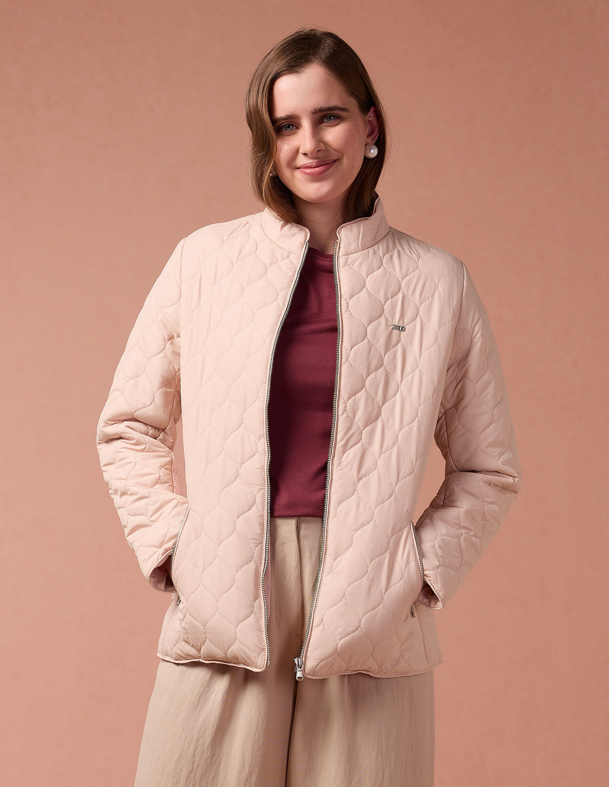 | Stand collar | Brand logo on chest | Zip closure at front | Long sleeves | Two pockets | Quilted construction | Solid pattern | Regular fit |