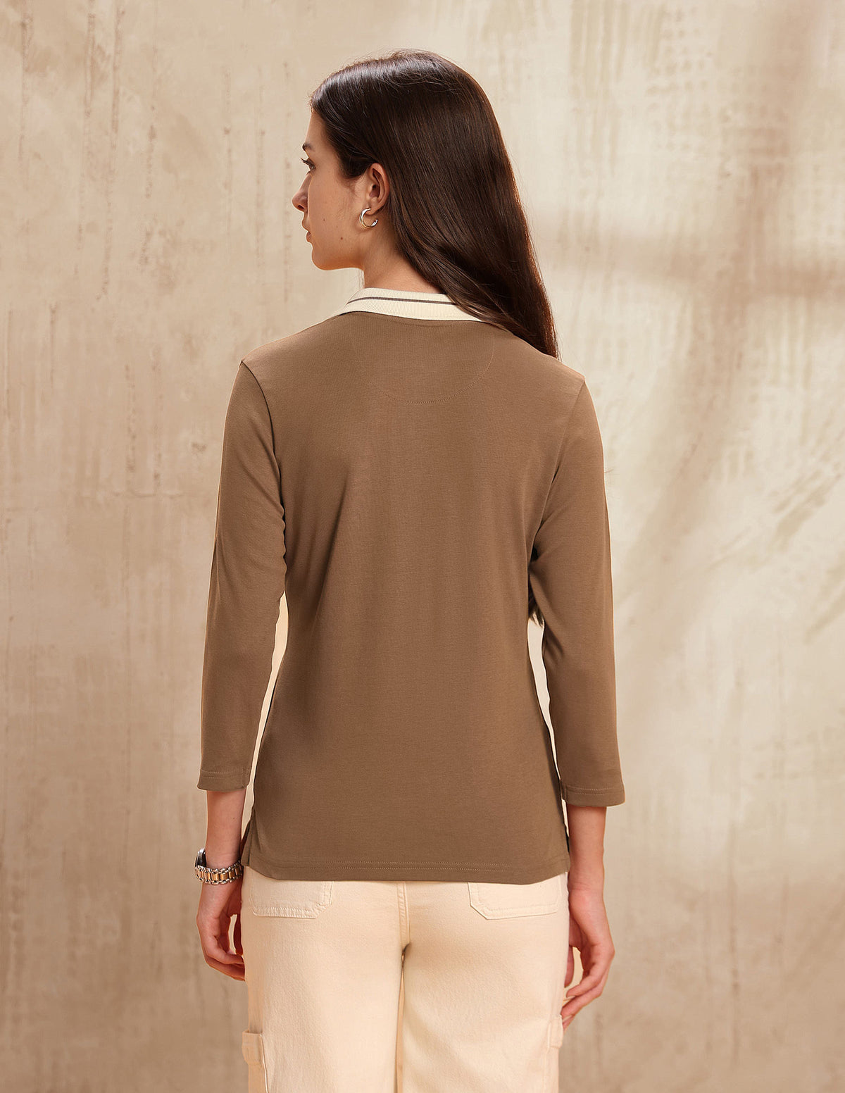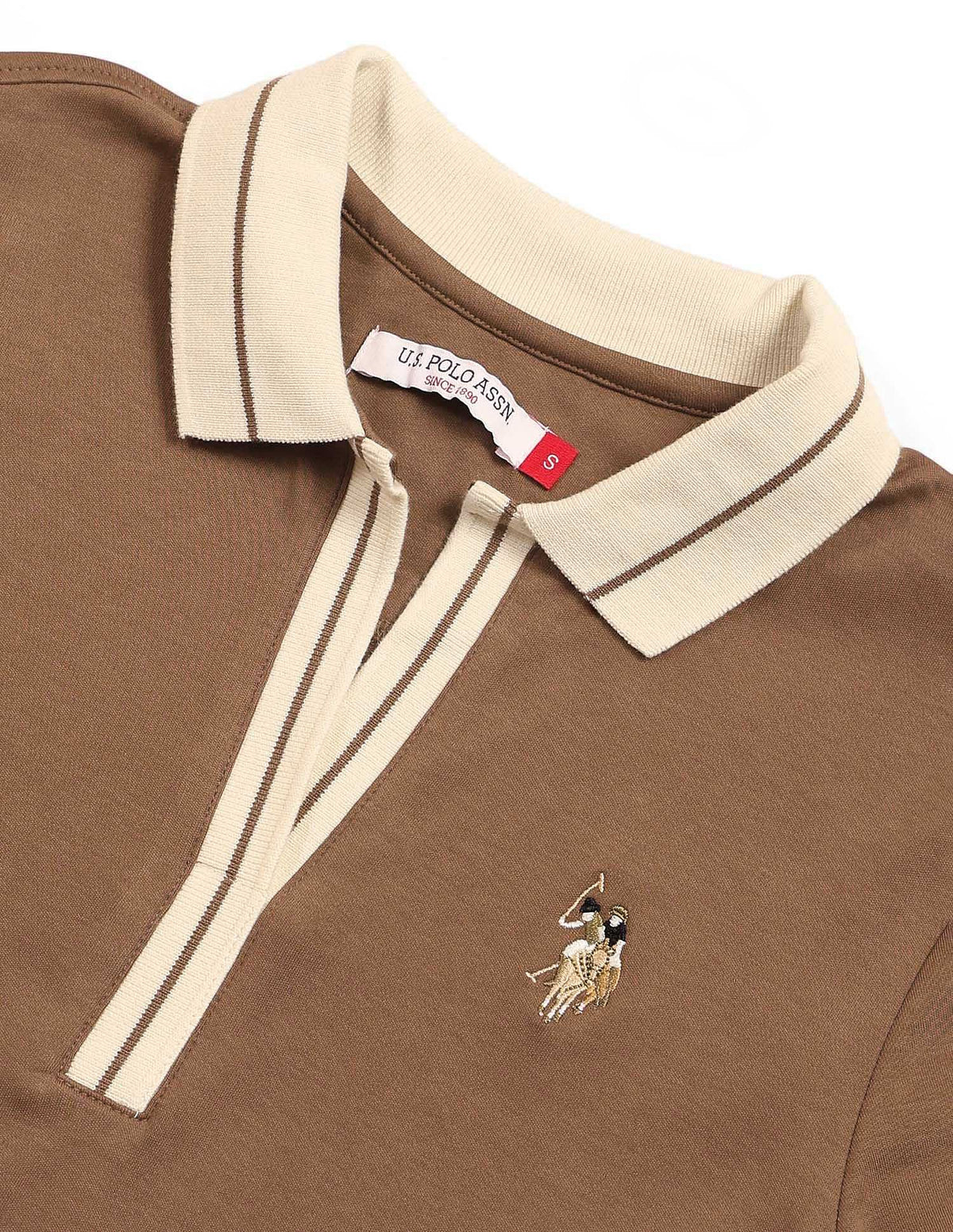 | Polo collar | Logo at chest | Open placket | Short sleeves | Uneven vented hem | Solid pattern | Pique knit | Regular fit |