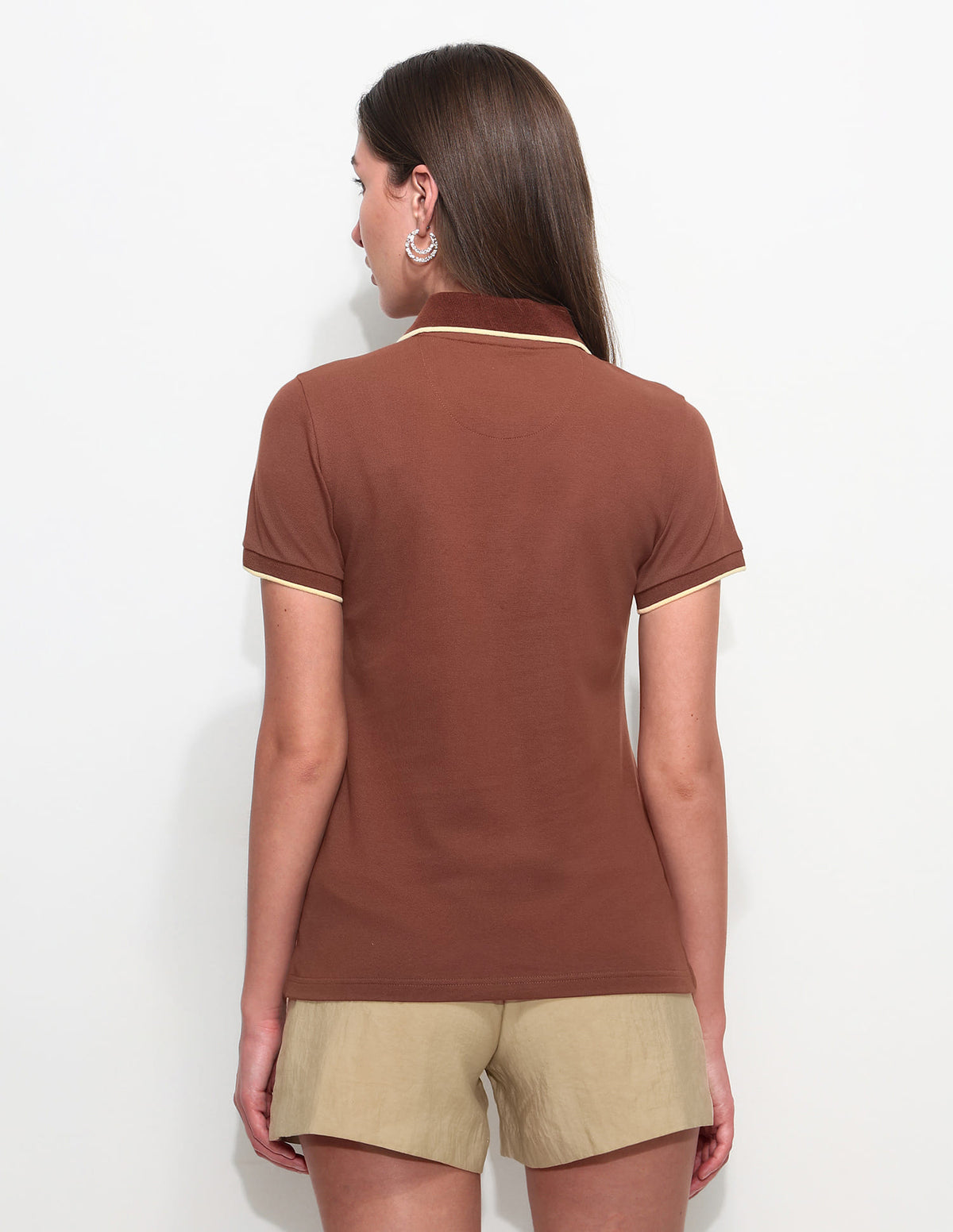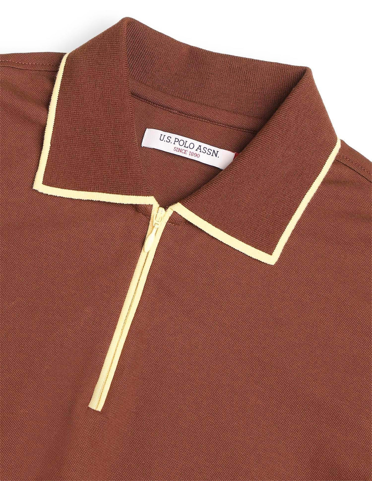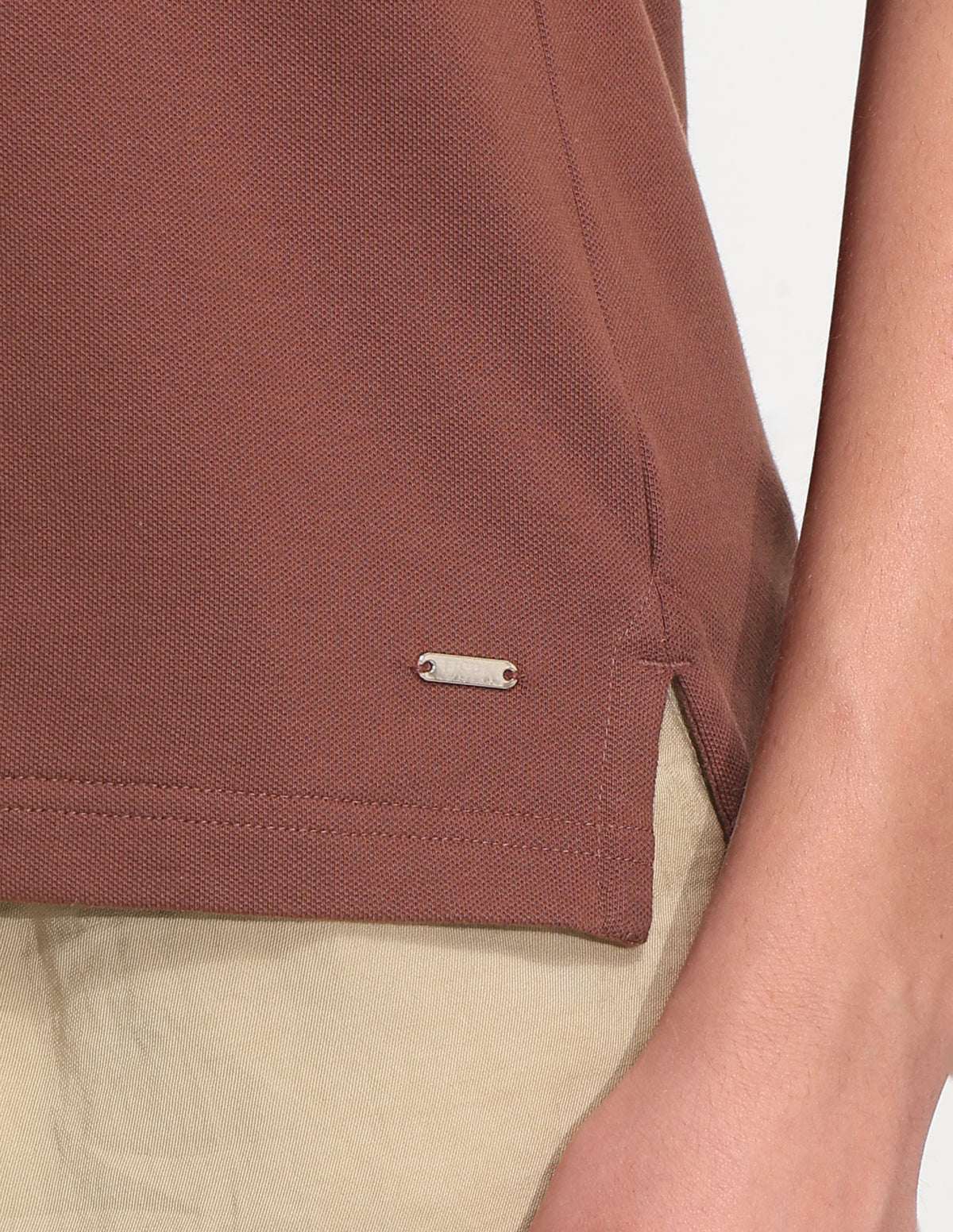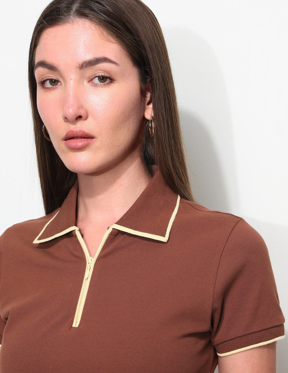| Polo collar | Short zip placket | Short sleeves | Ribbed collar and sleeve hems | Uneven vented hem | Solid pattern | Pique knit | Regular fit |