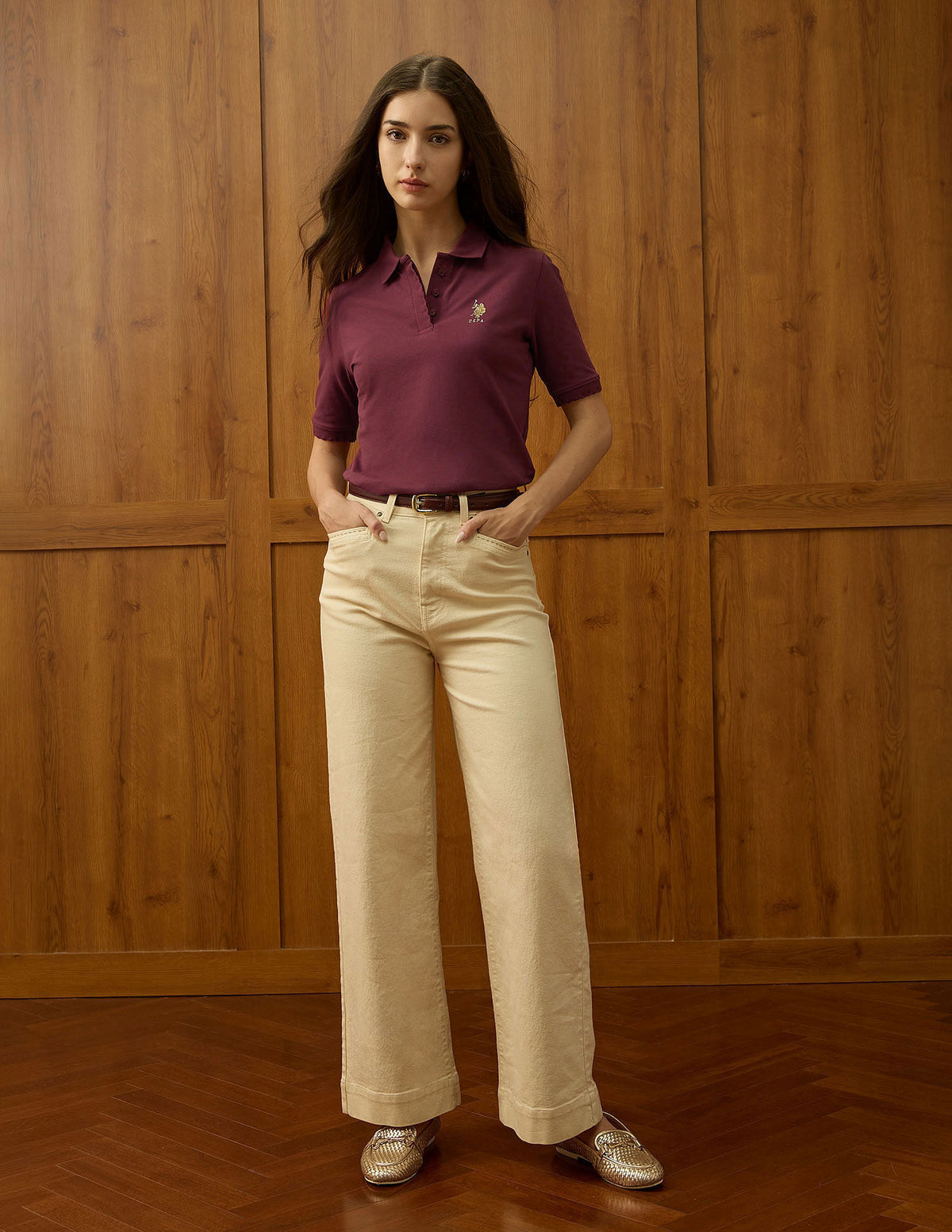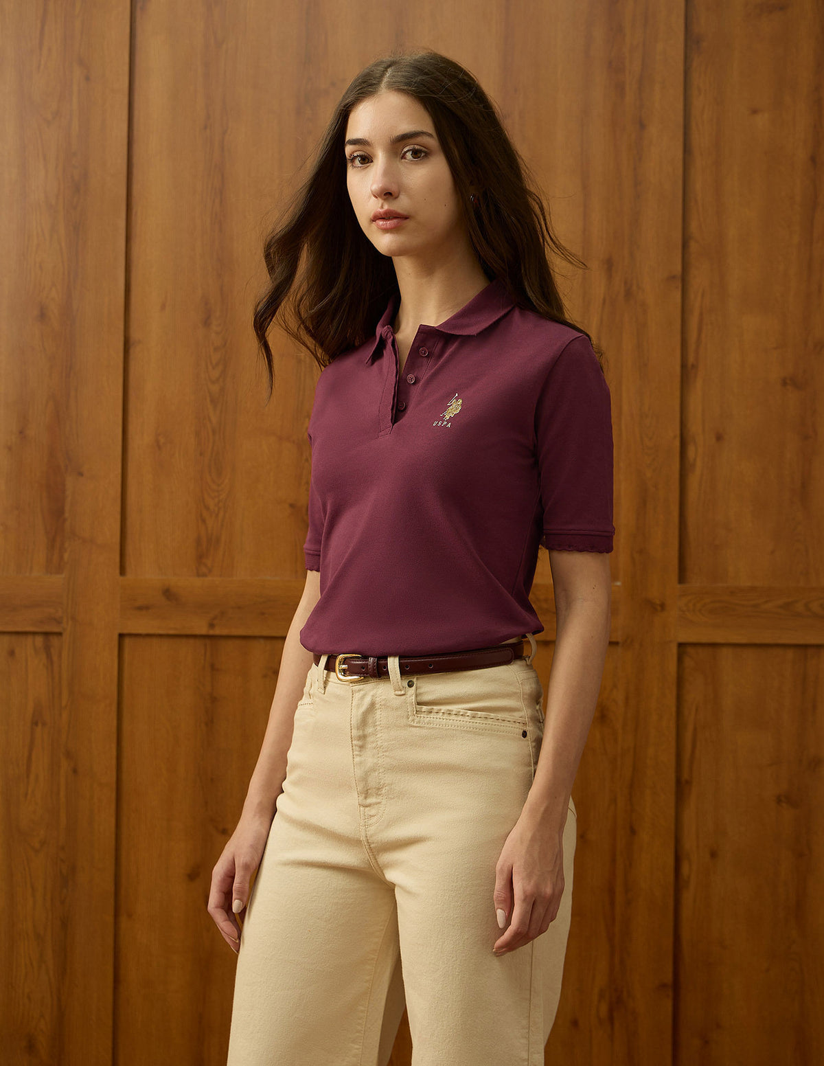 | Polo collar | Logo at chest | Short button placket | Short sleeves | Uneven vented hem | Solid pattern | Pique knit | Regular fit |