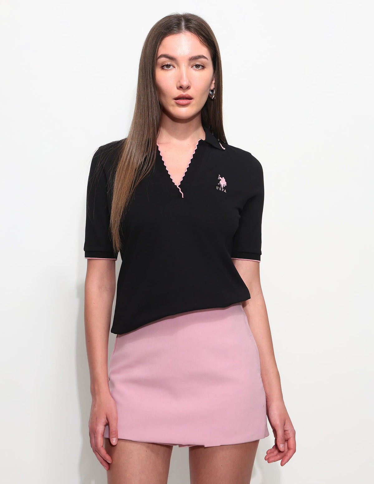 | Polo collar with V-neck | Short button placket | Short sleeves | Ribbed collar and sleeve hems | Uneven vented hem | Textured pattern | Pique knit | Regular fit |