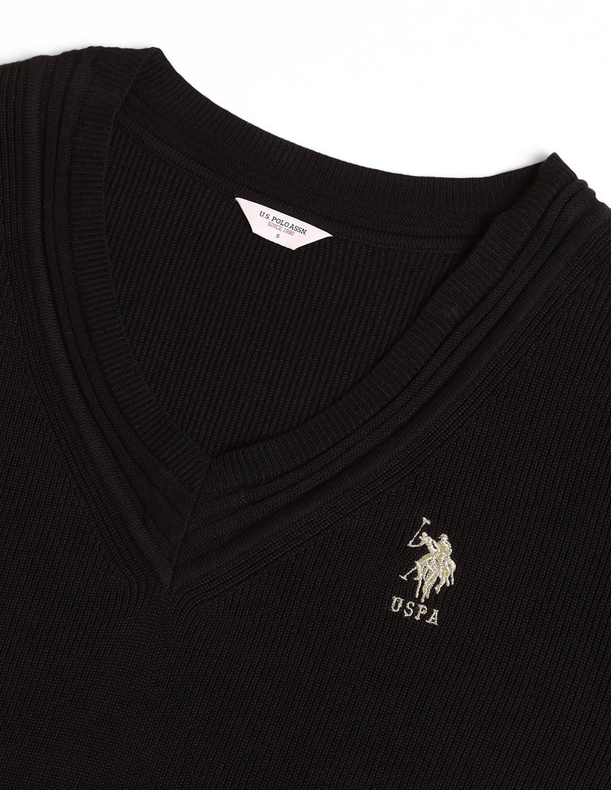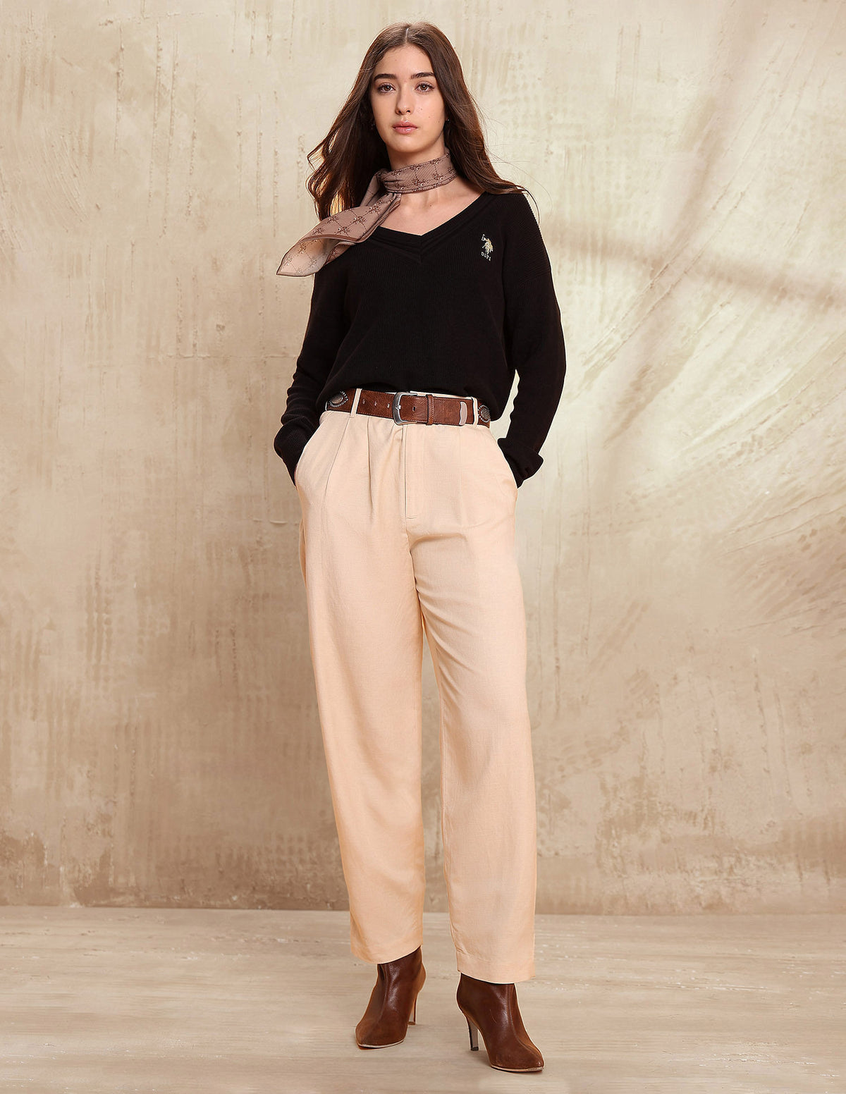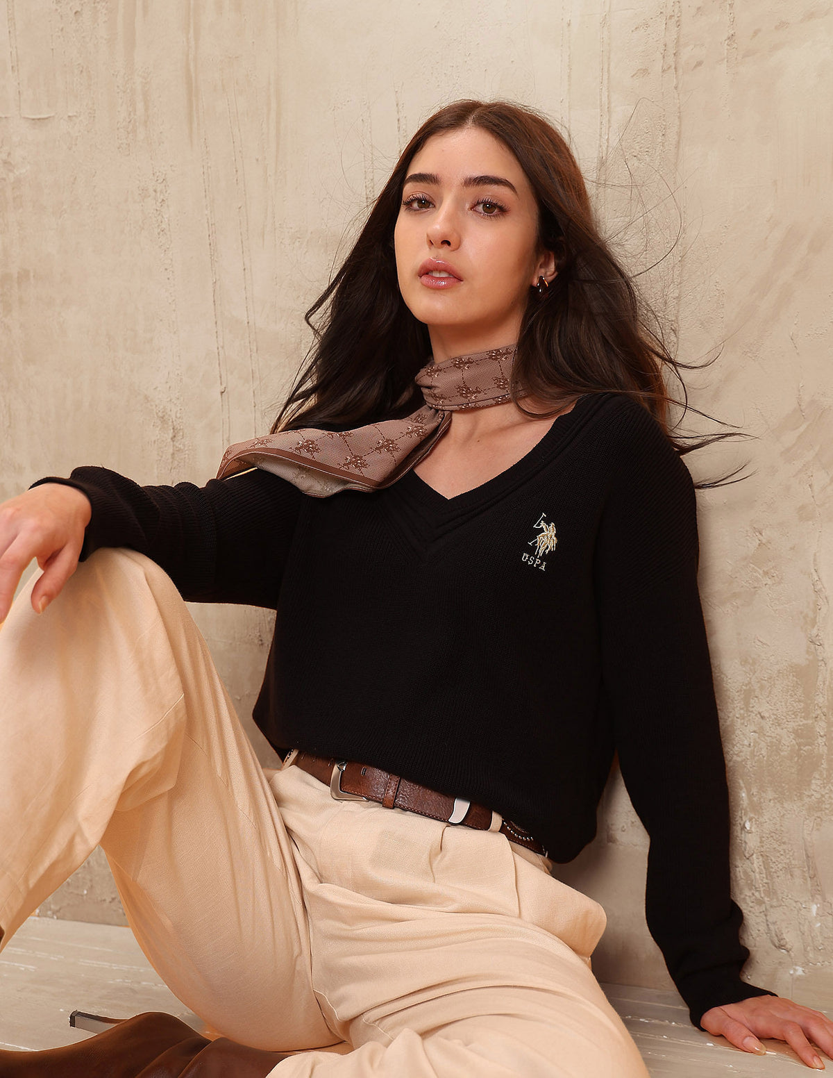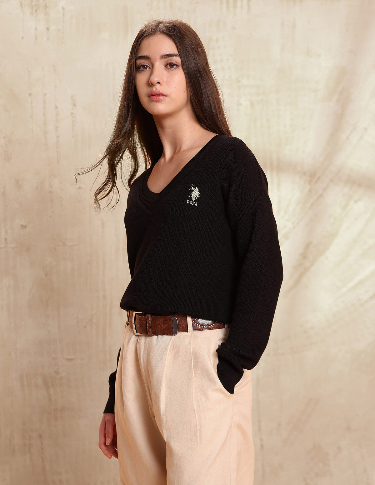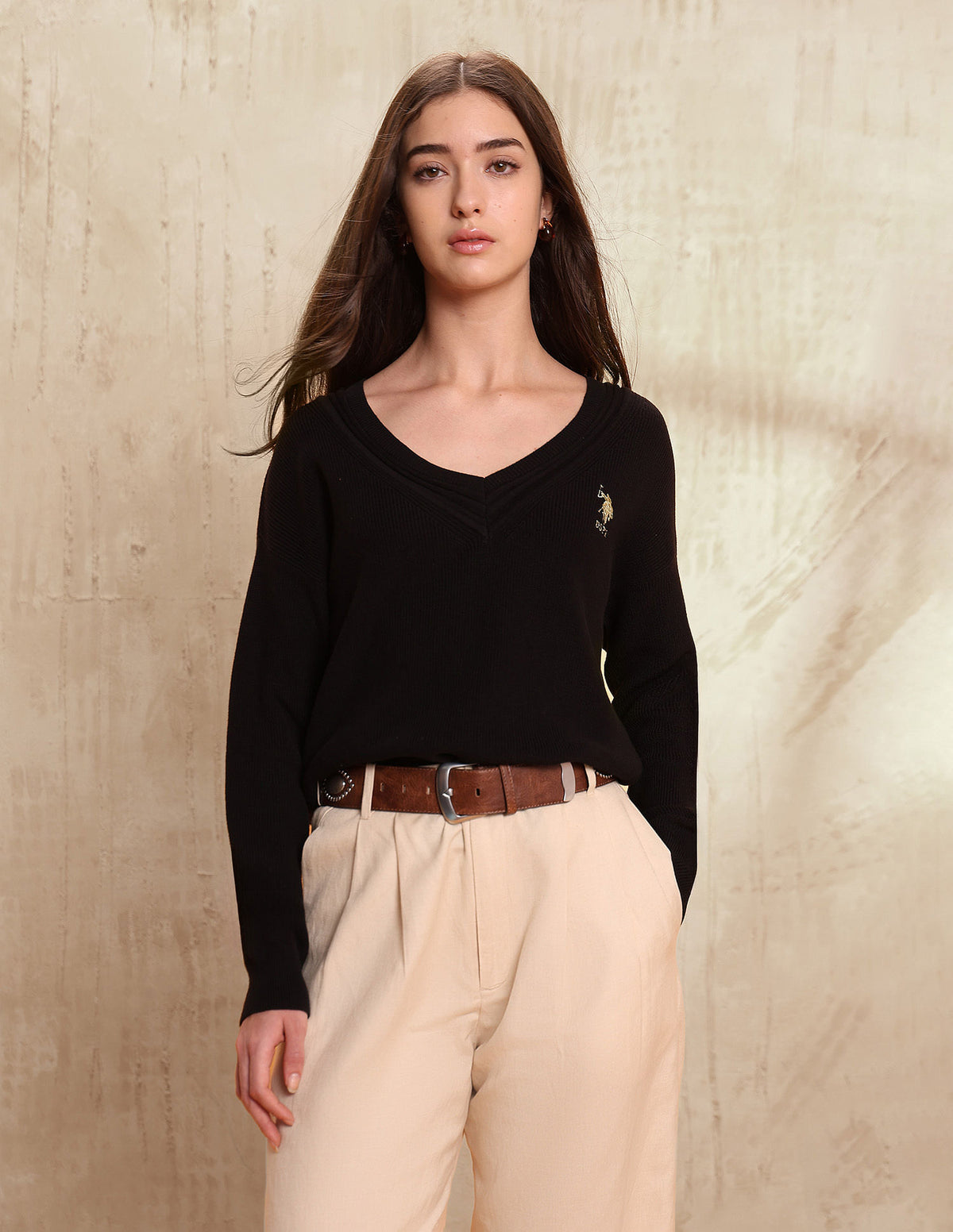 | V-neck | Long sleeves | Ribbed neck, sleeve hems and hemline | Solid pattern | Knitted | Relaxed fit |