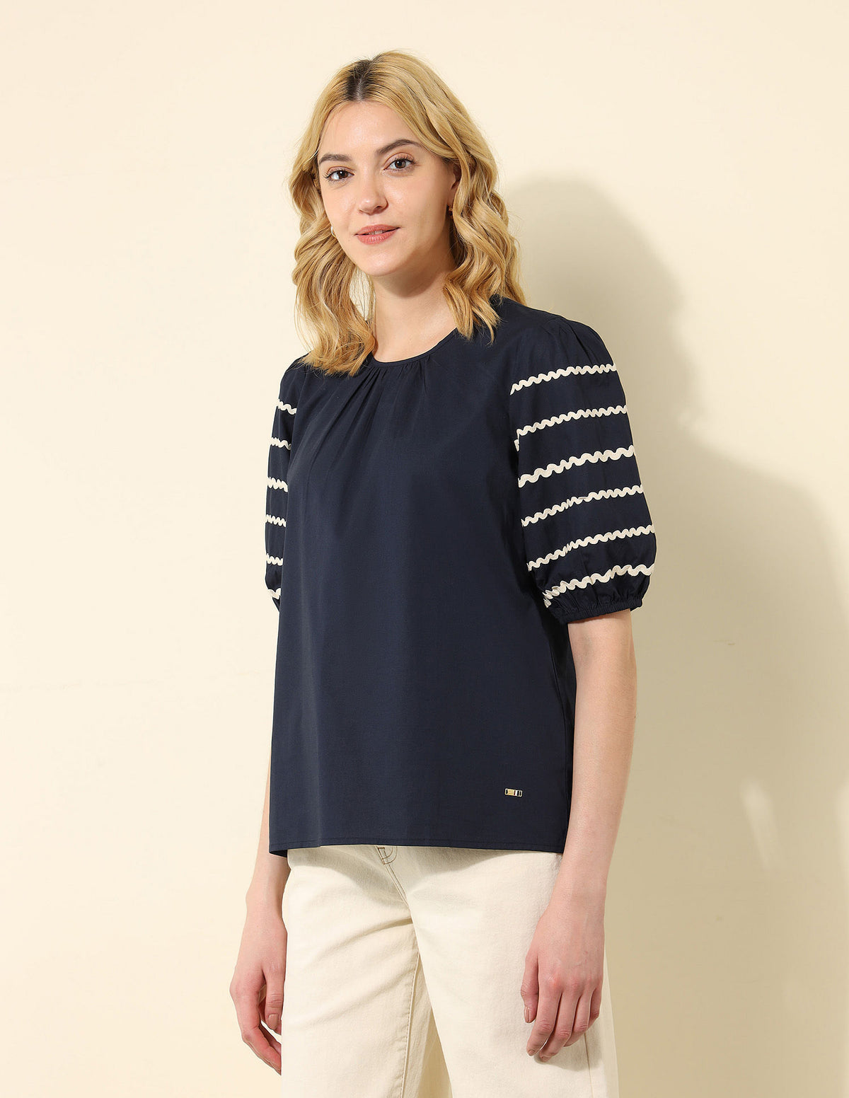| Round neck | Gathered near yoke | Button and loop closure at back | Short sleeves with ric-rac lace detail | Straight hemline | Solid pattern | Regular weave | Regular fit |