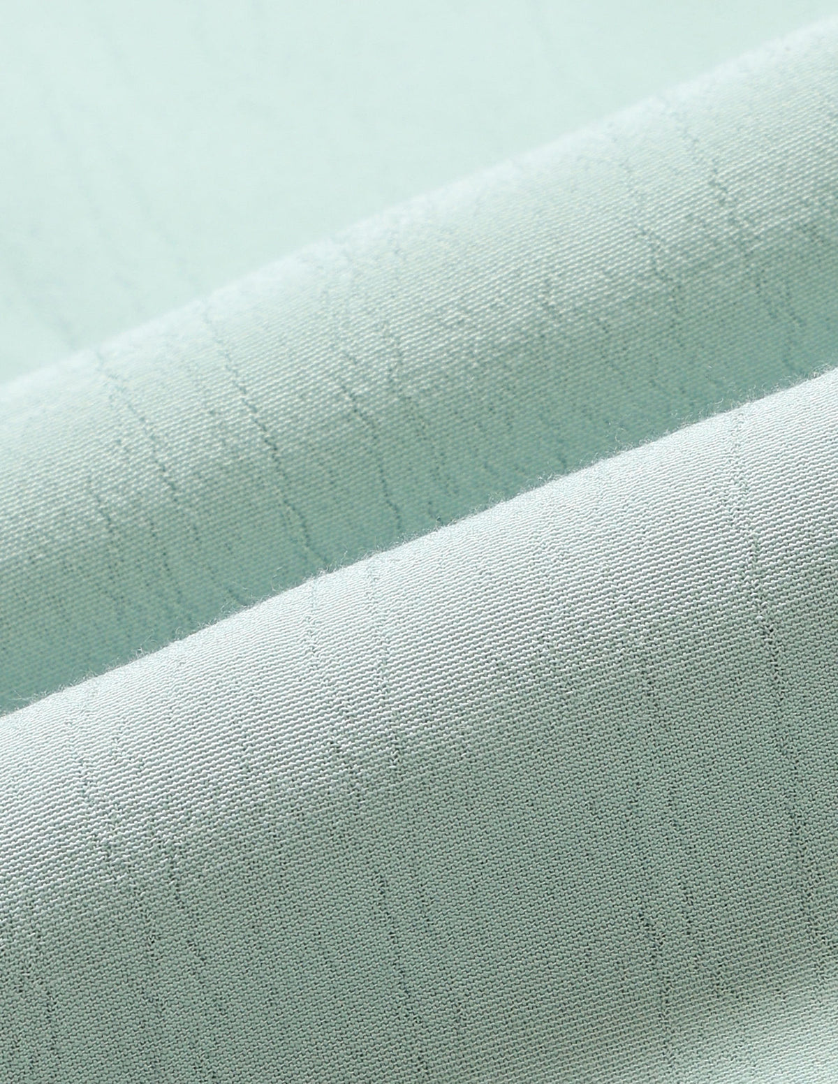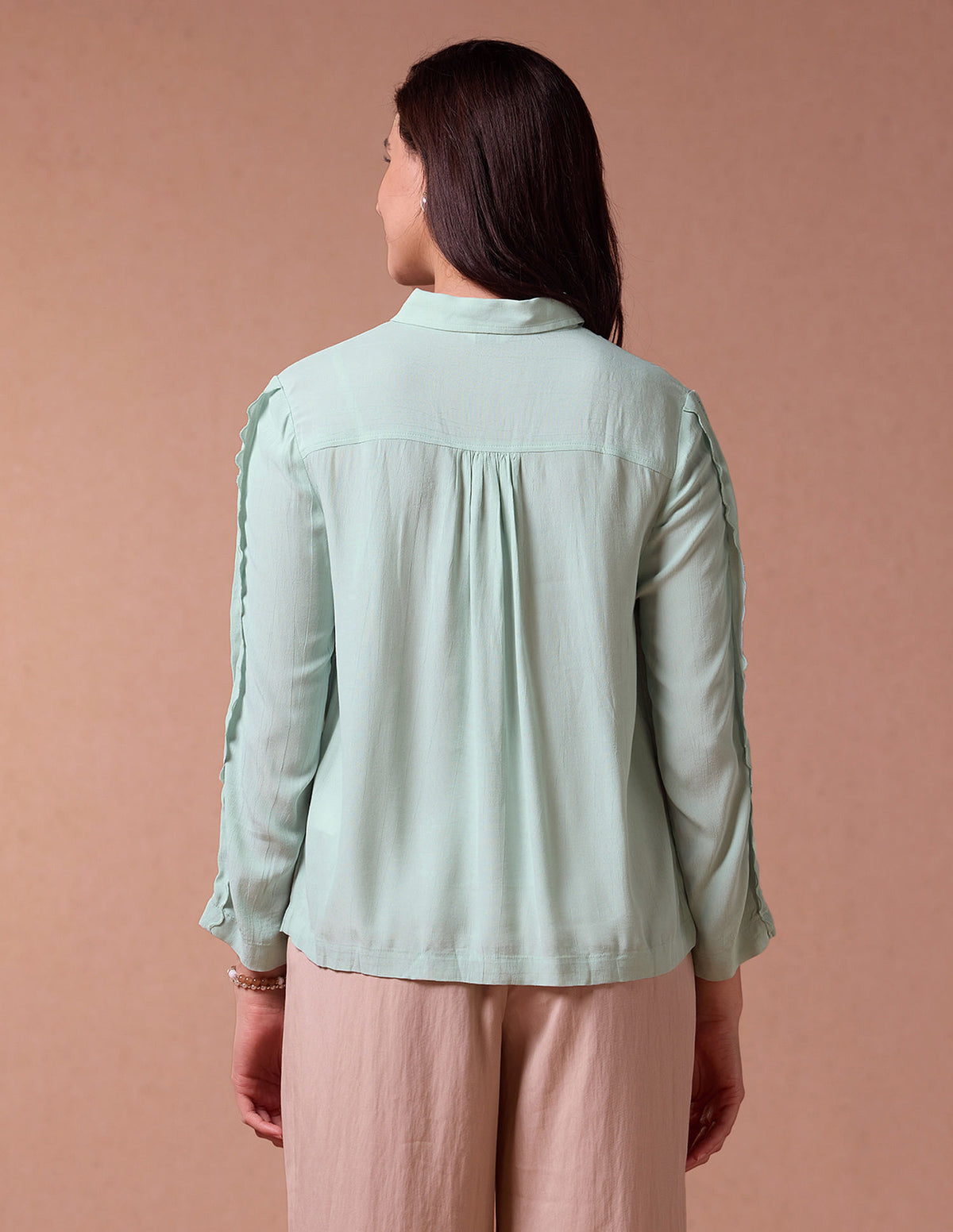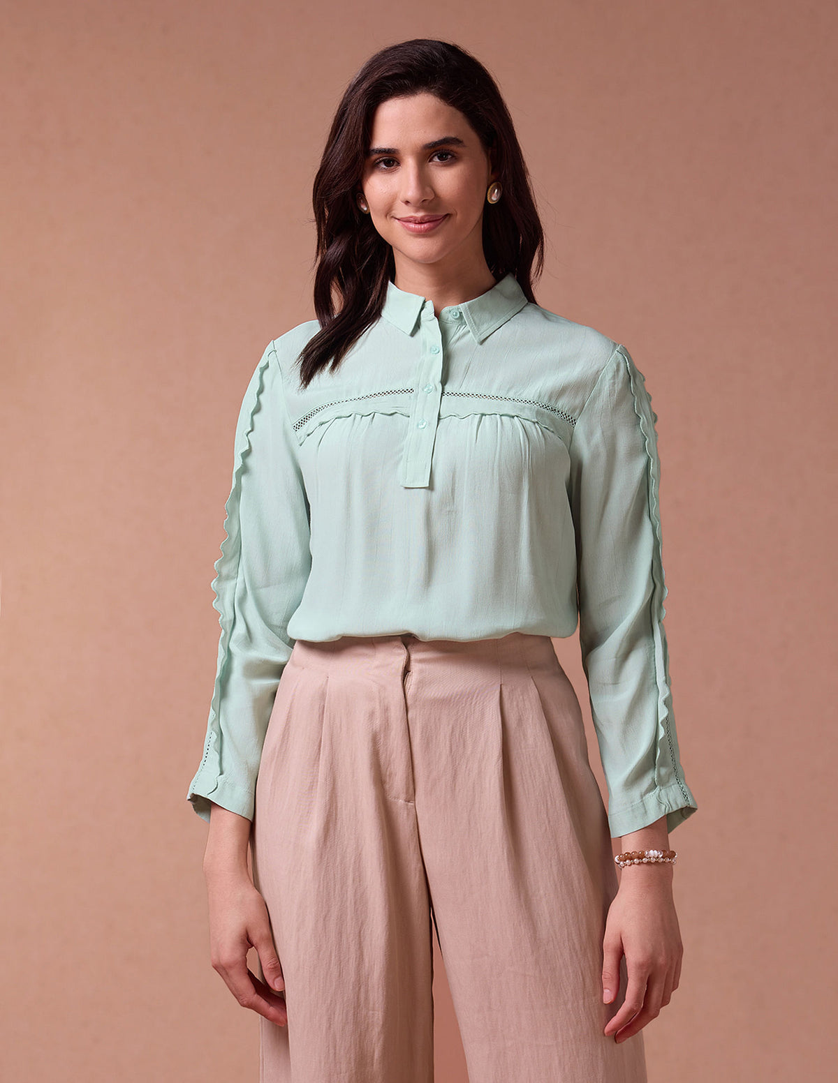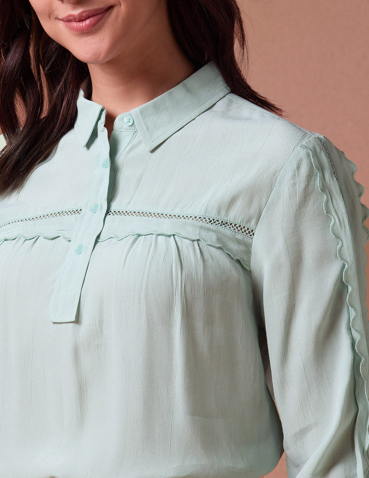| Shirt collar | Short button placket | Long sleeves with scallop lace detail | Straight hemline | Solid pattern | Regular weave | Regular fit