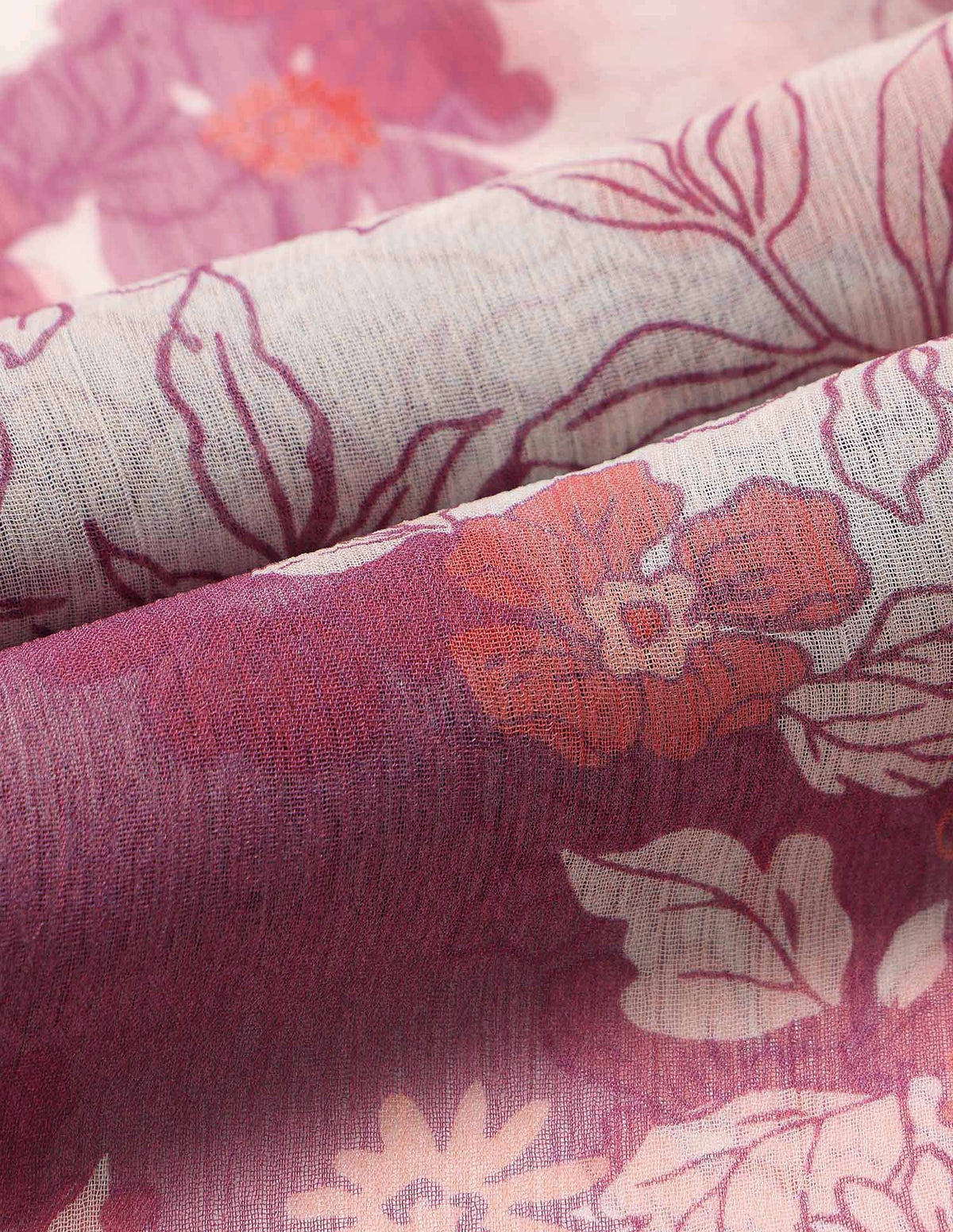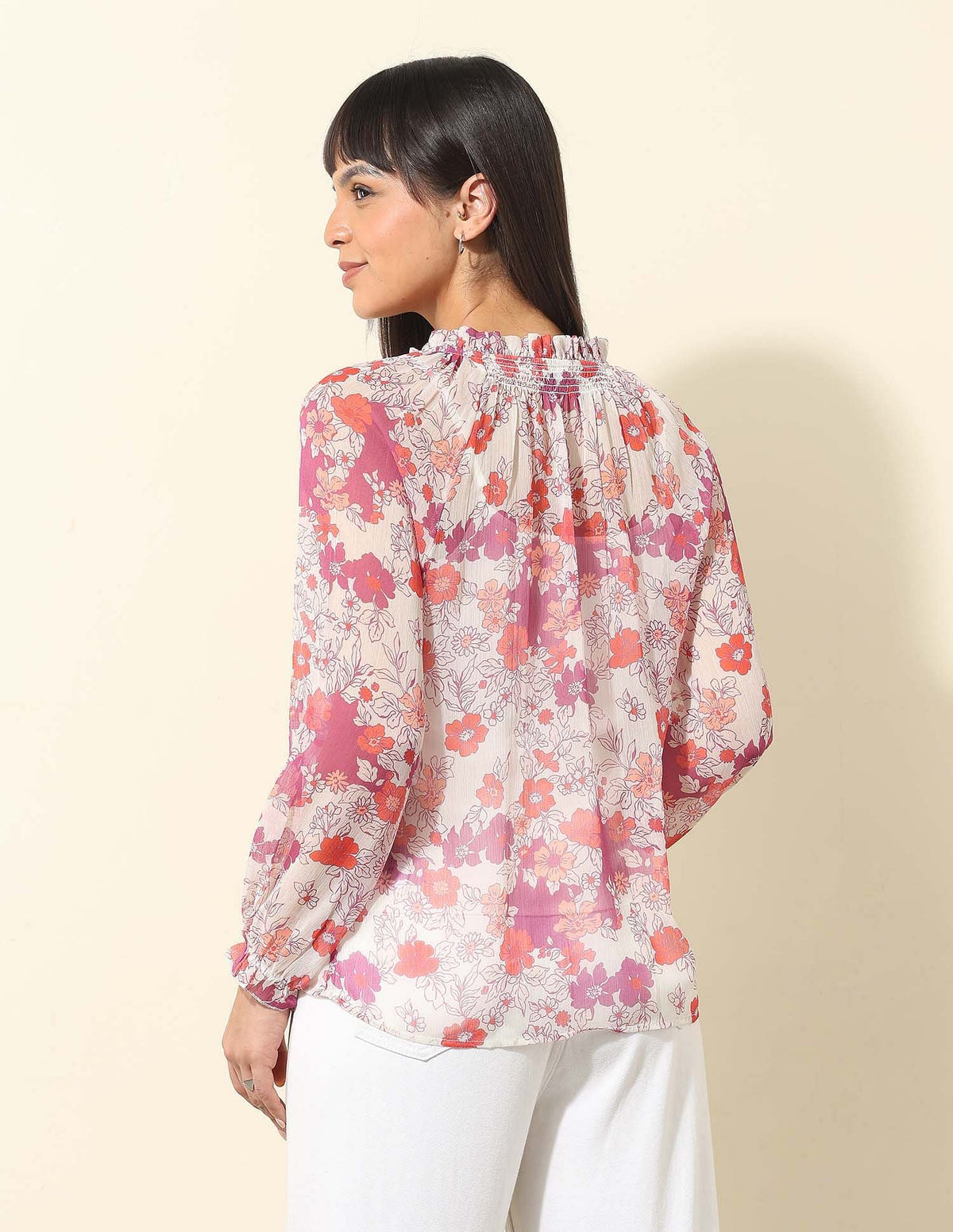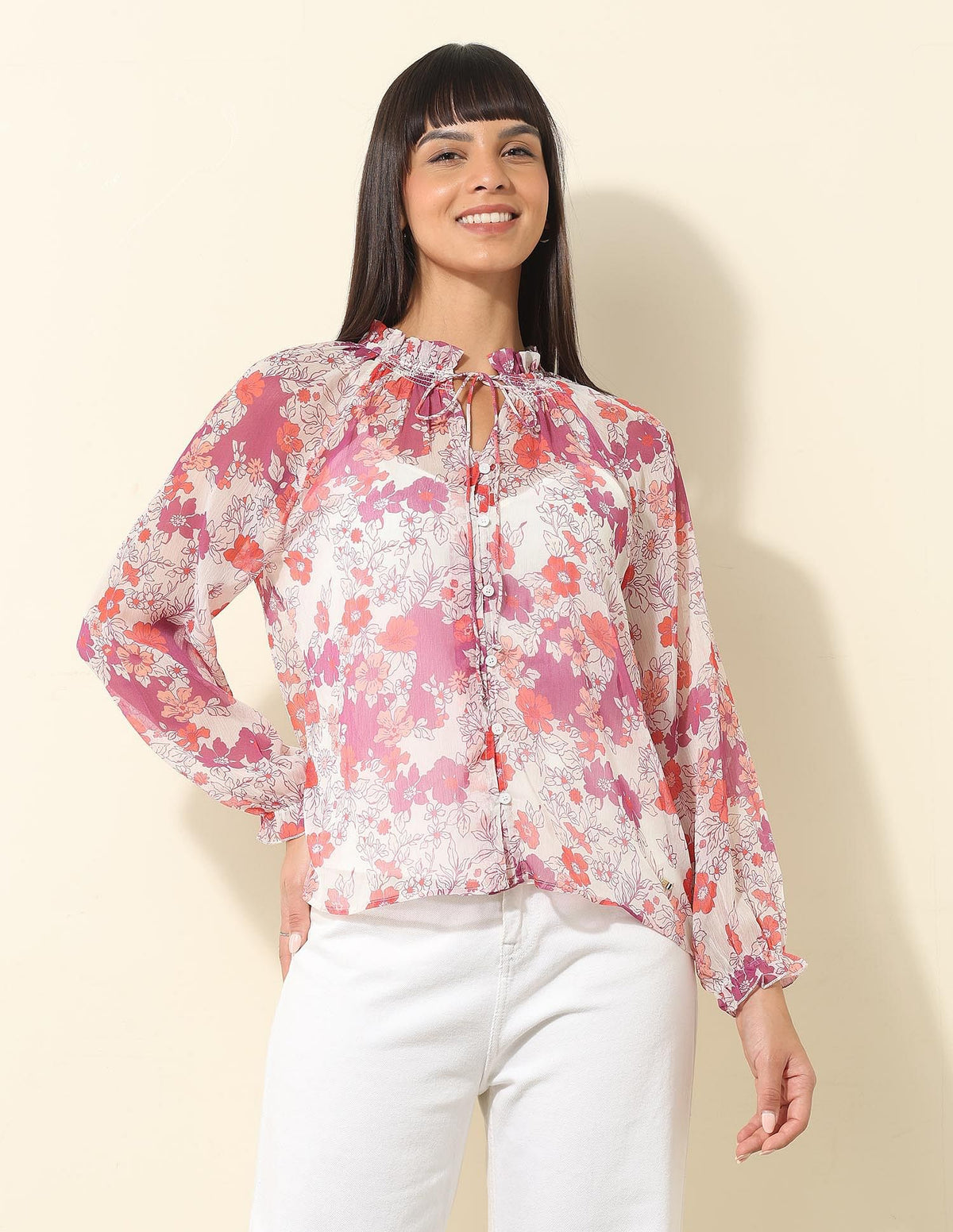| Round neck with tie-up detail | Long sleeves with elasticized hems | Straight hemline | Floral printed pattern | Regular weave | Regular fit |