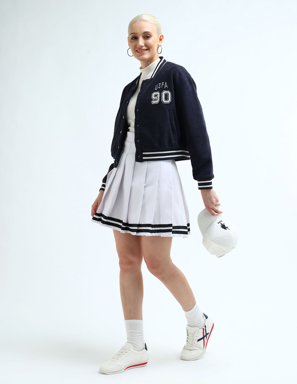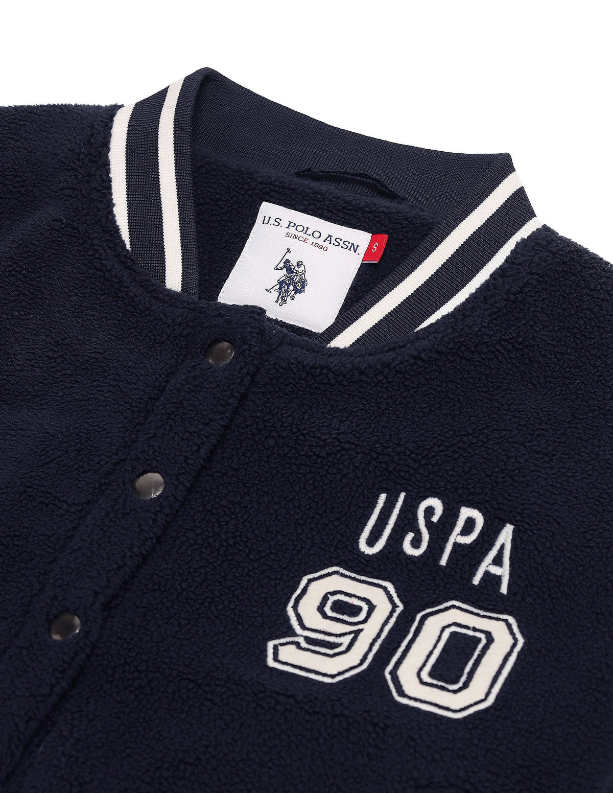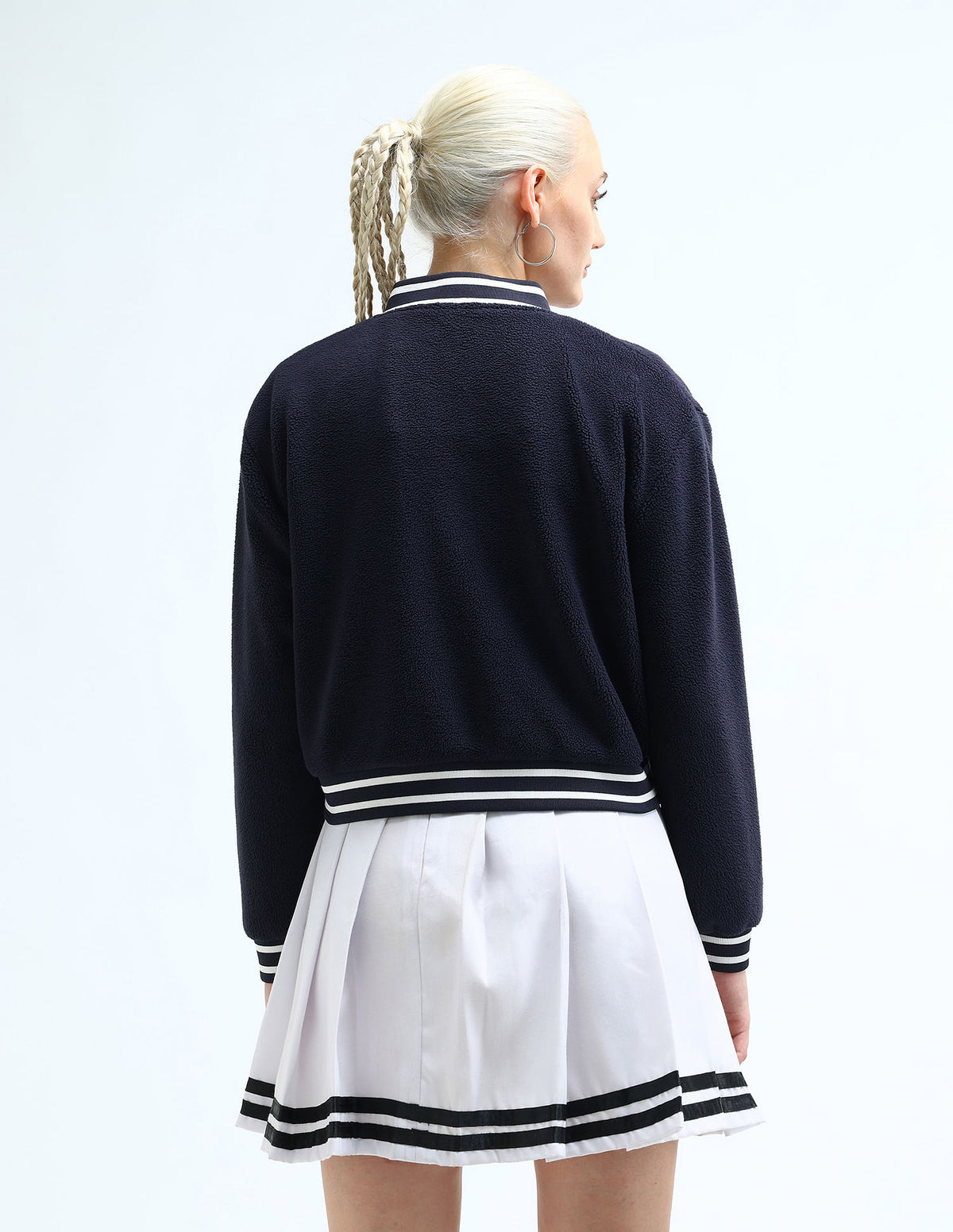 | Stand collar | Appliqued logo at chest | Full snap button closure | Long sleeves | Striped and ribbed collar, sleeve hems and hemline | Two pockets | Faux fur construction | Solid pattern |