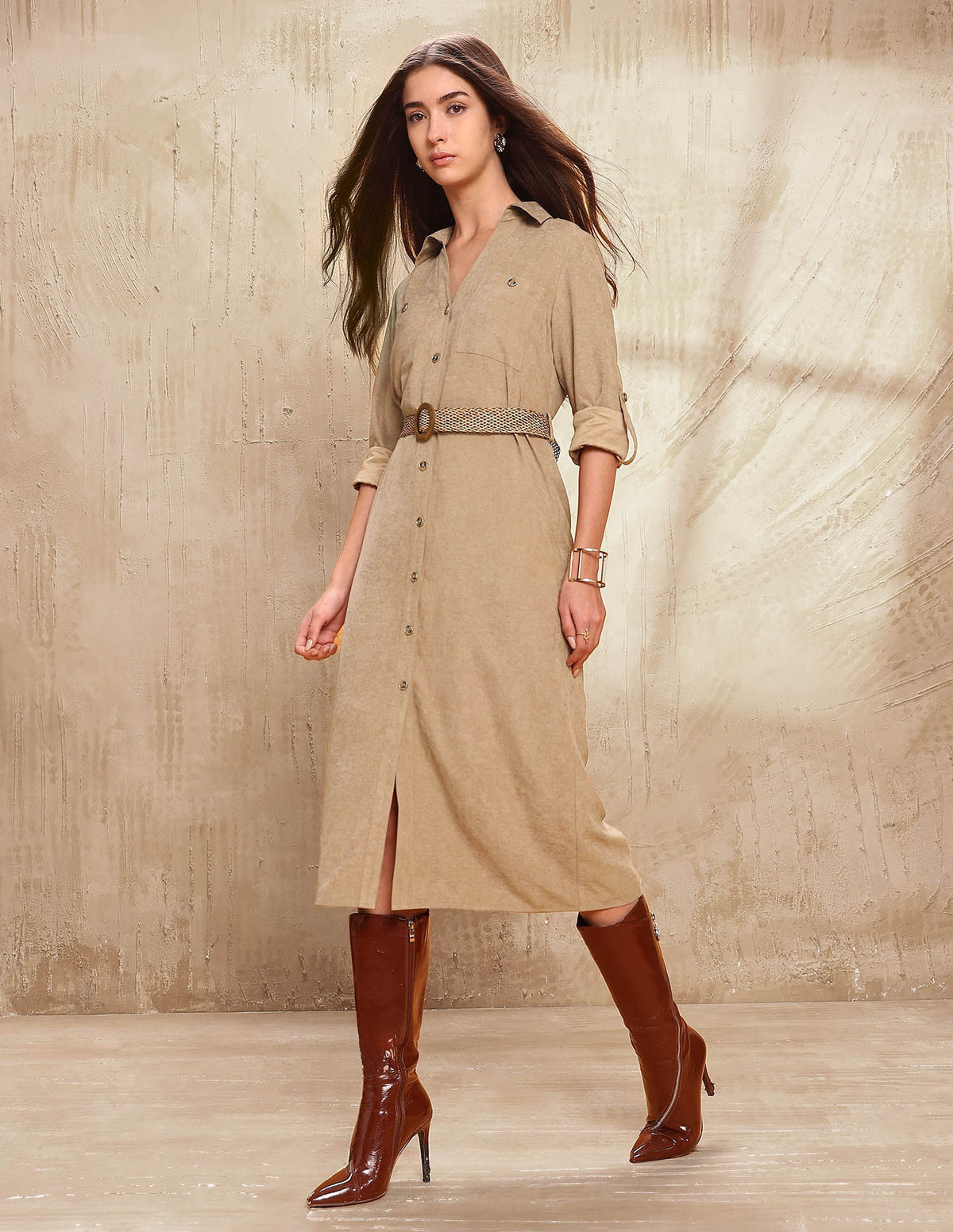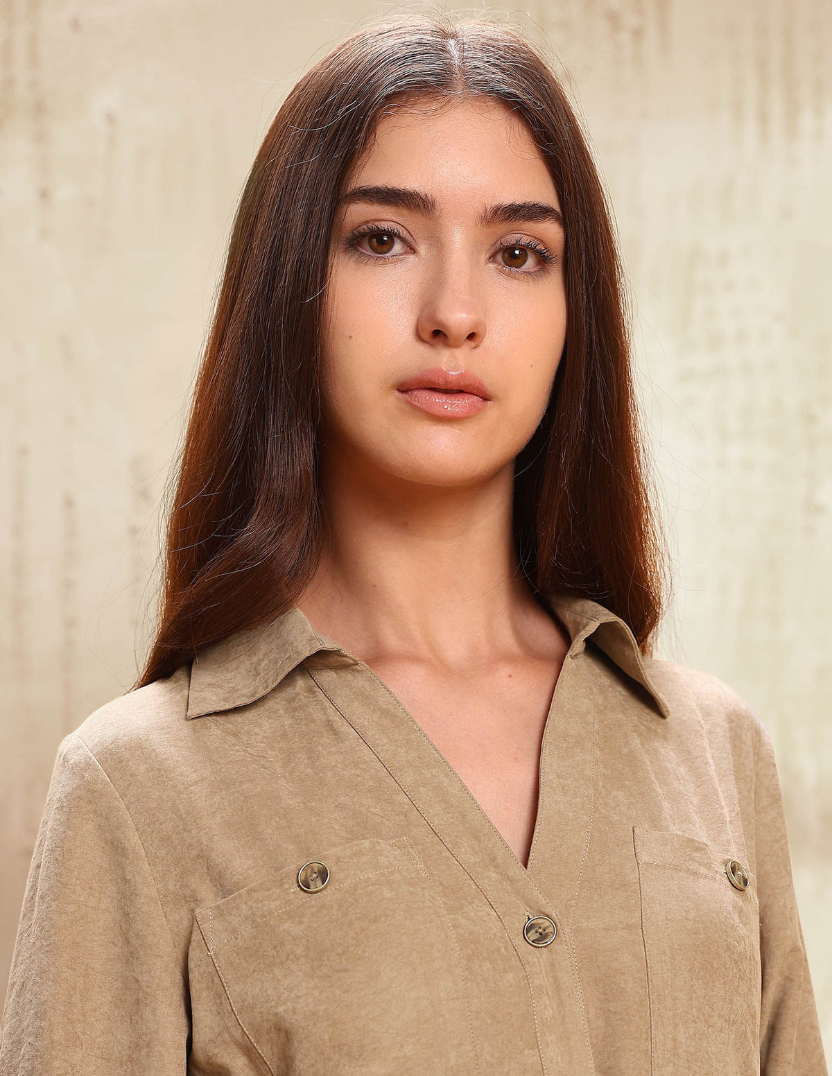 | Shirt collar | Full button placket | Short sleeve | Solid pattern |